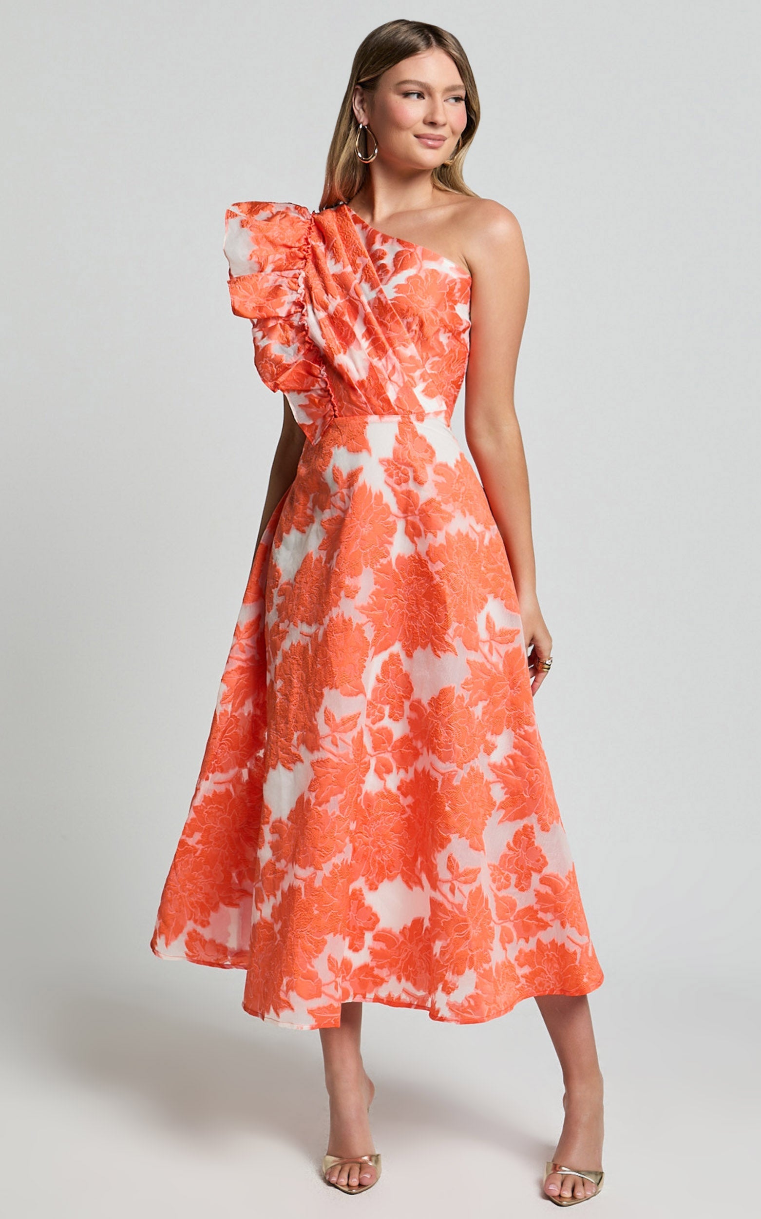 This striking orange midi brings a playful splash to your wardrobe, featuring an asymmetric one-shoulder neckline and flirty ruffle detail for an effortlessly maximalist look. Crafted from luxurious jacquard fabric, it's designed to hug your curves in all the right places, perfect for cocktail evenings or turning heads at your next event.