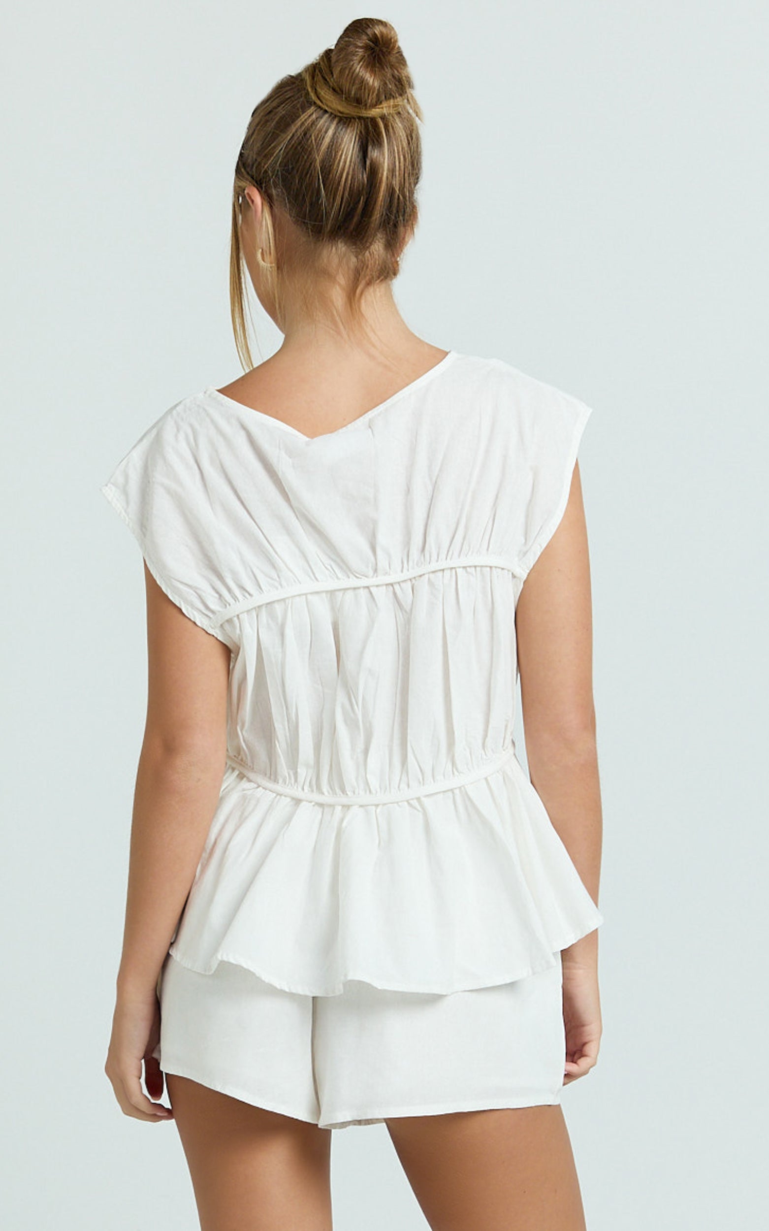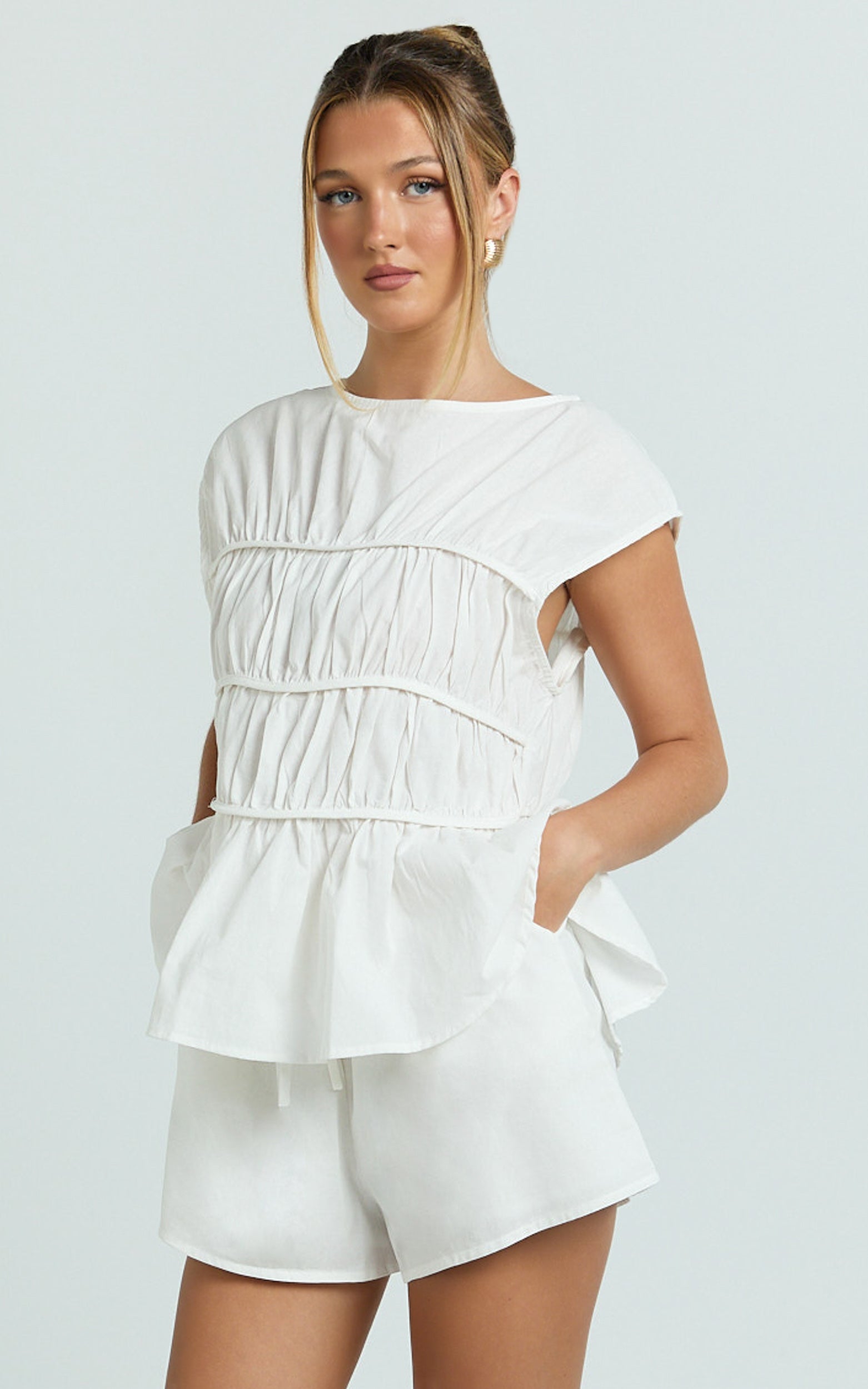 Alina Two Piece Set - Ruched Detail Top And Short Pants Set In White is made for summer dressing and quick outfit wins. Lean into short suits energy by pairing with oversized sunglasses and a shell pendant necklace for a chic finish, or add woven tote bags and criss-cross ballet flats for day plans. Keep it crisp, keep it cute, and let the compliments roll in.