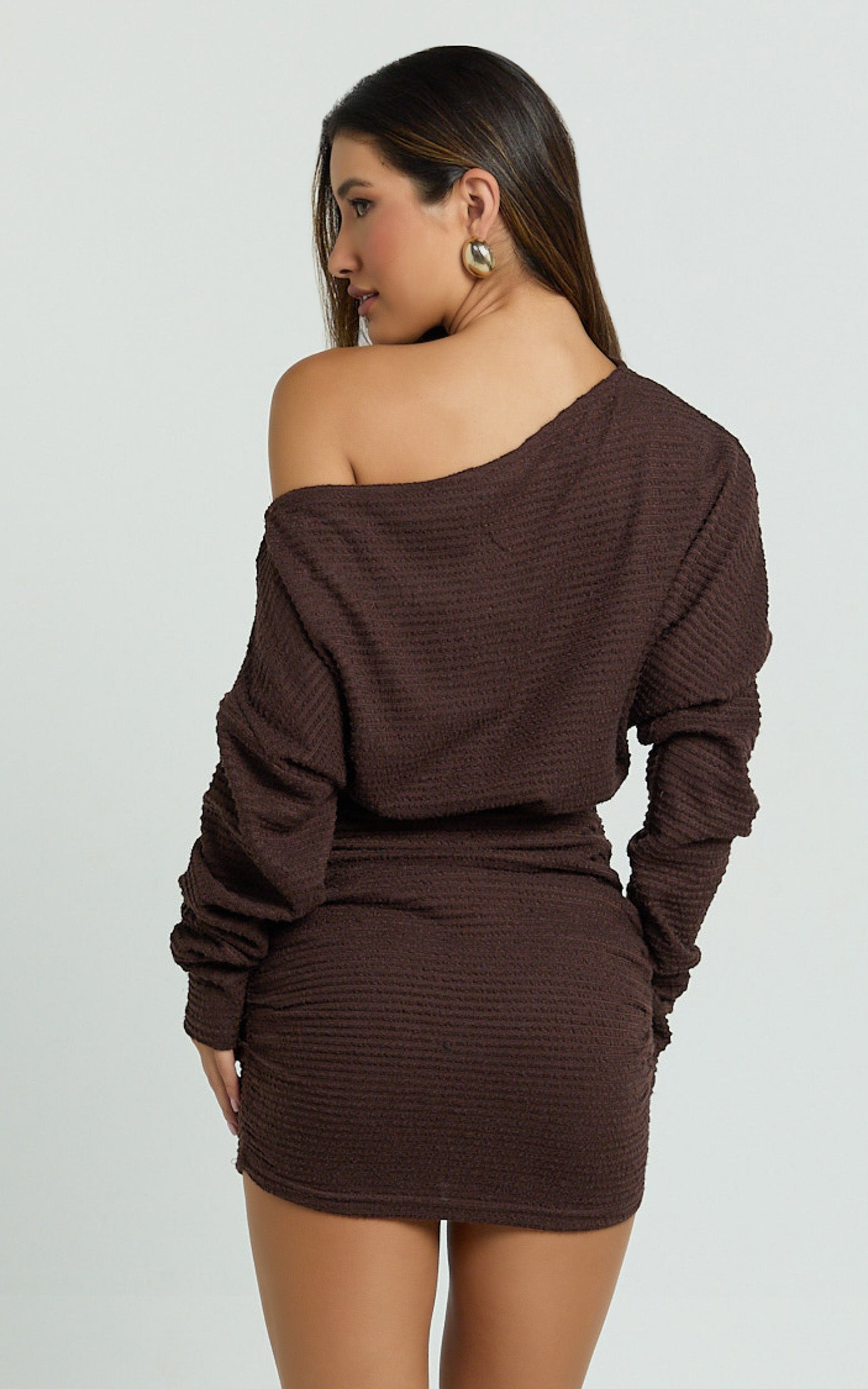 Alyce Mini Dress serves Monochrome magic with a Textured edge, making it a standout among brown Dresses for any night out or dressy date. Style it with strappy heels and a mini shoulder bag for a streamlined finish, or add delicate hoop earrings to keep the look clean and elevated. Wear it solo and let that asymmetric line do the talking.