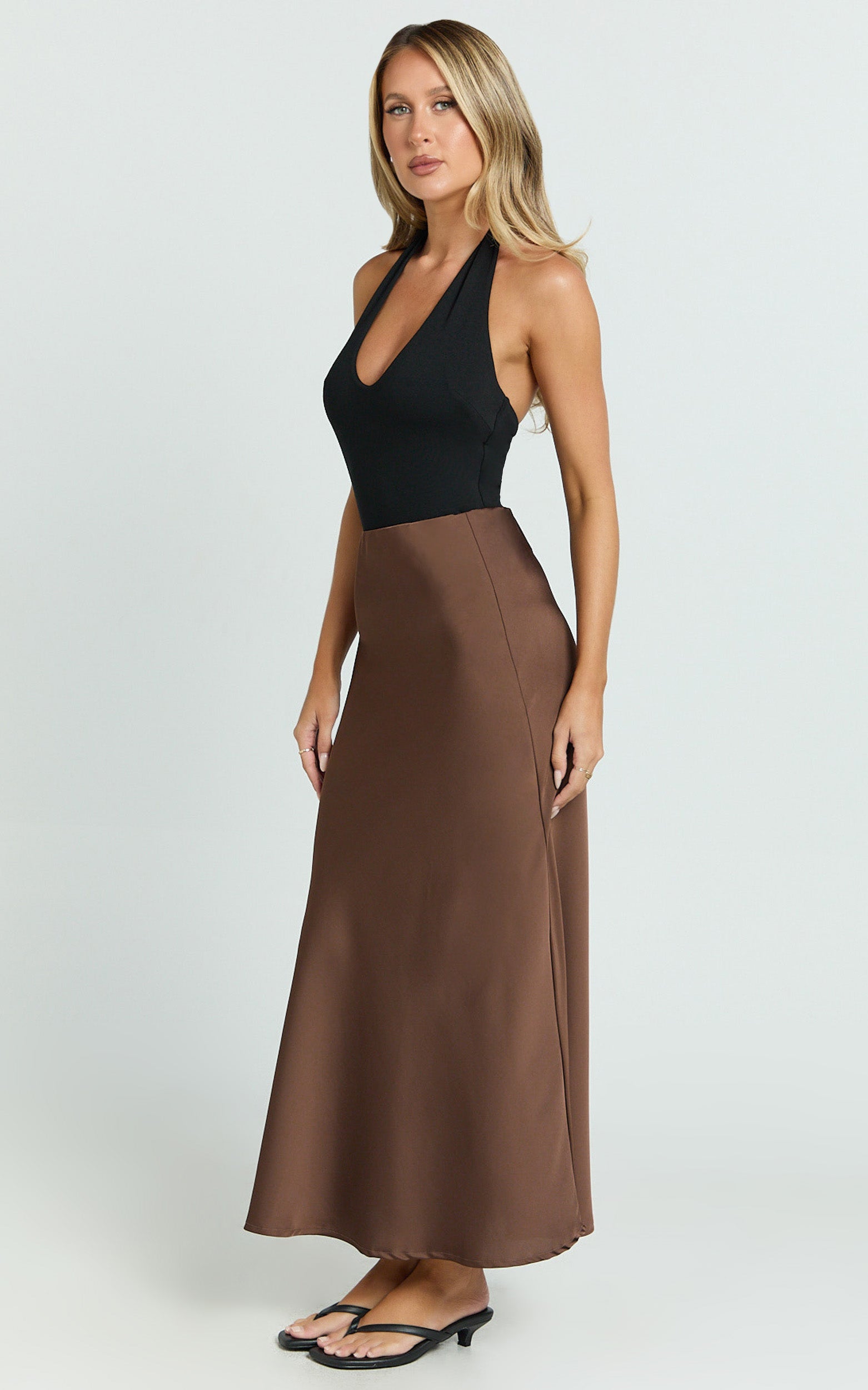 Crafted in a rich chocolate hue, this skirt features a flattering high-waisted fit and bias-cut fabric, perfectly accentuating your curves for a sleek, feminine silhouette. An asymmetrical hem adds playful movement, making each step feel effortlessly graceful and ensuring this maxi skirt stands out from the rest.