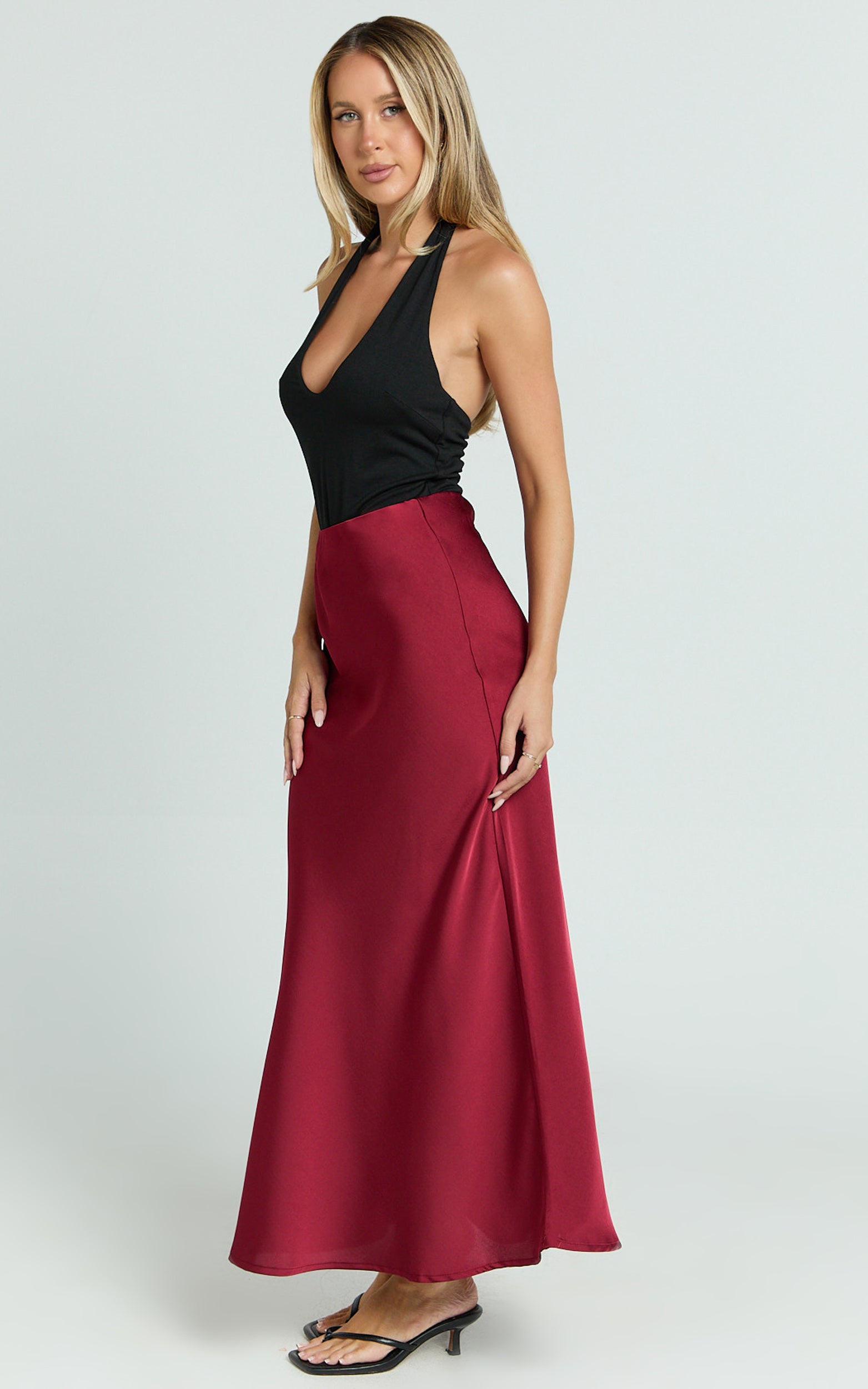 Make a statement in the Amari Maxi Skirt, where elegance meets effortless style. As the ultimate must-have for Gen Z and Millennials looking for that perfect blend of casual and chic, this high-waisted, bias-cut beauty in a sumptuous wine shade is your new go-to piece. Crafted from luxurious satin polyester that feels as good as it looks, the Amari Maxi ensures you glide through your day with a flirty swing in your step.