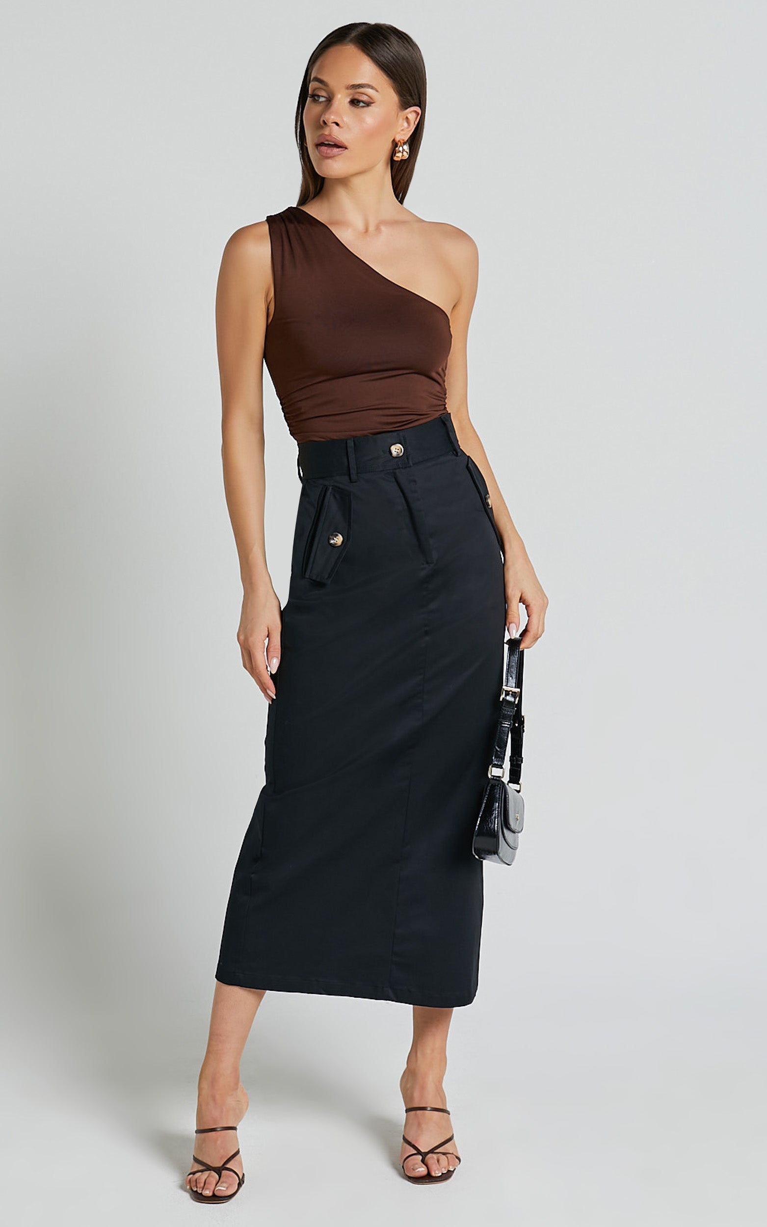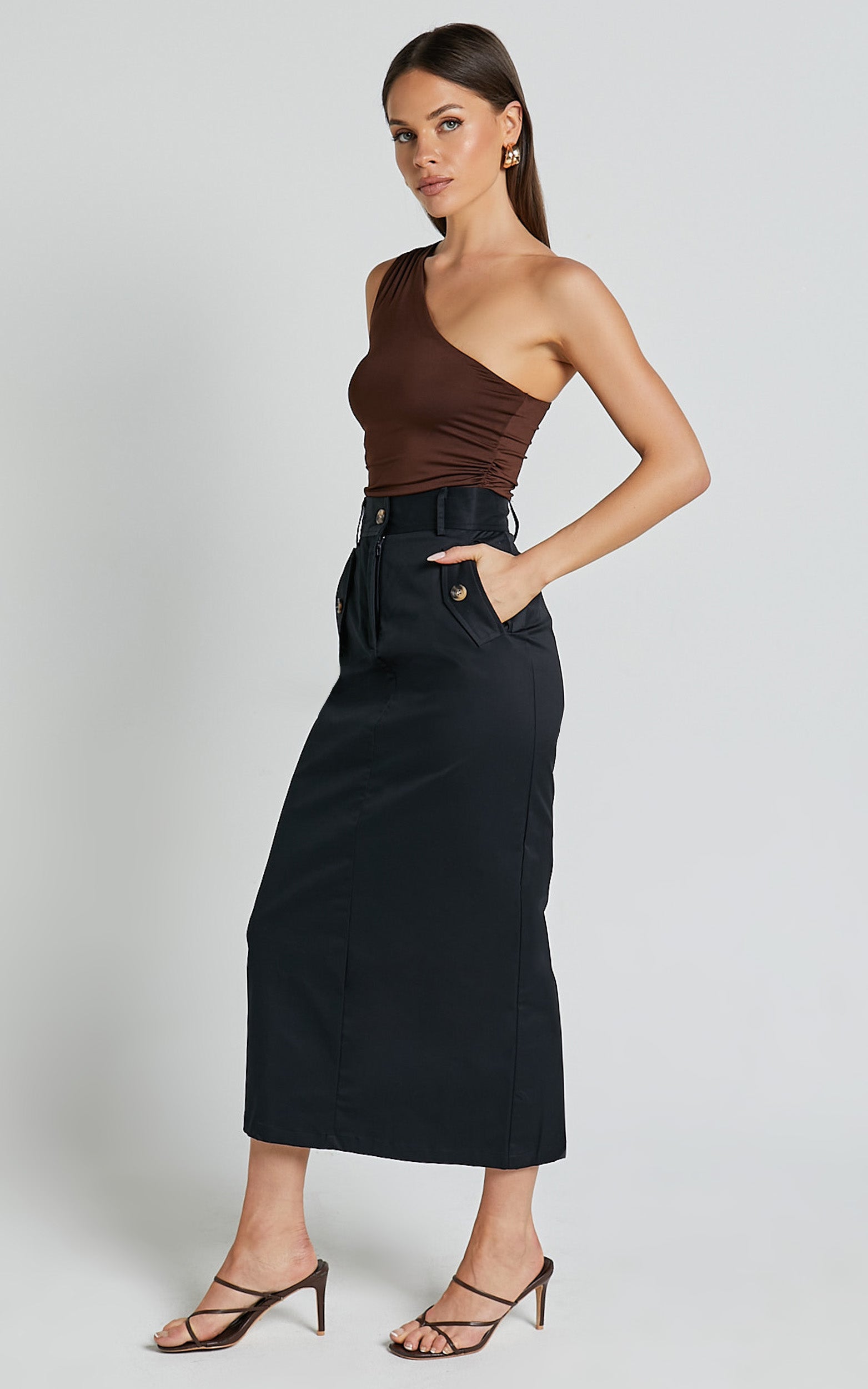 Get ready to turn heads with the Anna Midi Skirt in Black! This high-waisted cargo skirt is perfect for those casual-yet-chic days when you want to make a statement. Made from a mid-weight woven fabric with just the right amount of stretch, this pencil skirt hugs your curves in all the right places. The black color adds a touch of elegance while still keeping it versatile enough for any occasion. Pair it with your favorite crop top or blouse and get ready to slay that effortlessly stylish look. So go ahead, show off your playful and flirty side with the Anna Midi Skirt - you won't regret it!