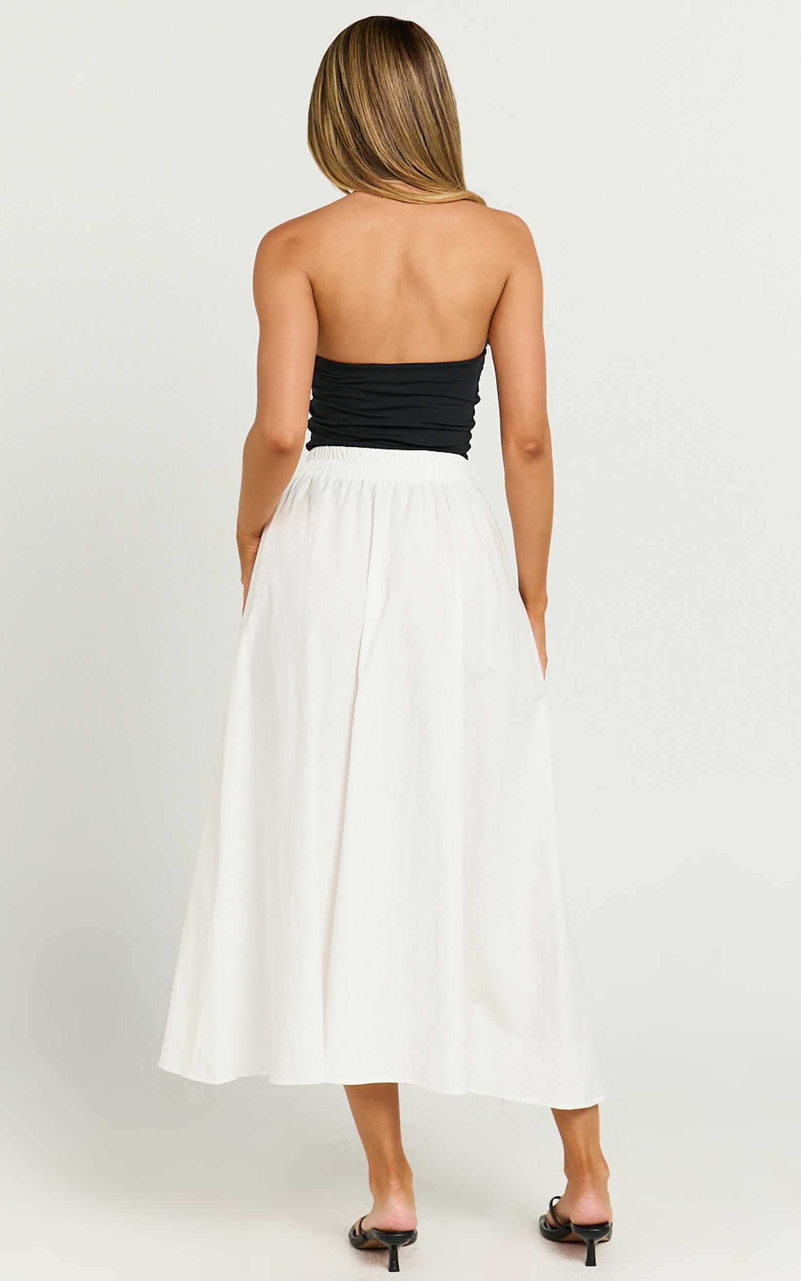 'Say hello to your new go-to skirt! The Annika A Line Midi Skirt in Ivory is the perfect addition to your wardrobe for those casual spring days. Made from comfortable and breathable cotton, this A-line skirt flatters any body type with its versatile midi length.