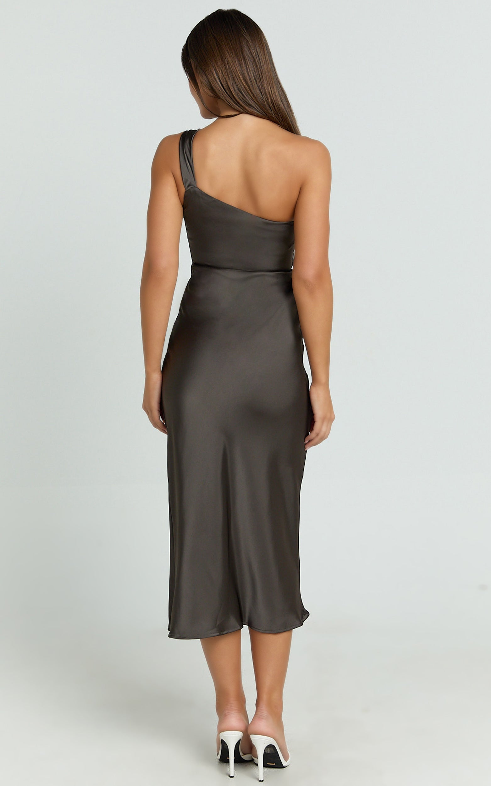 Crafted from a luxurious espresso-brown satin, this dress features an alluring one-shoulder neckline accented with an elegant twist detail. Its flattering bias-cut silhouette gently hugs your curves, highlighting your shape with grace and ease. Channeling a delicate ballerina-inspired aesthetic, this midi dress is ideal for romantic dinners and chic cocktail evenings.