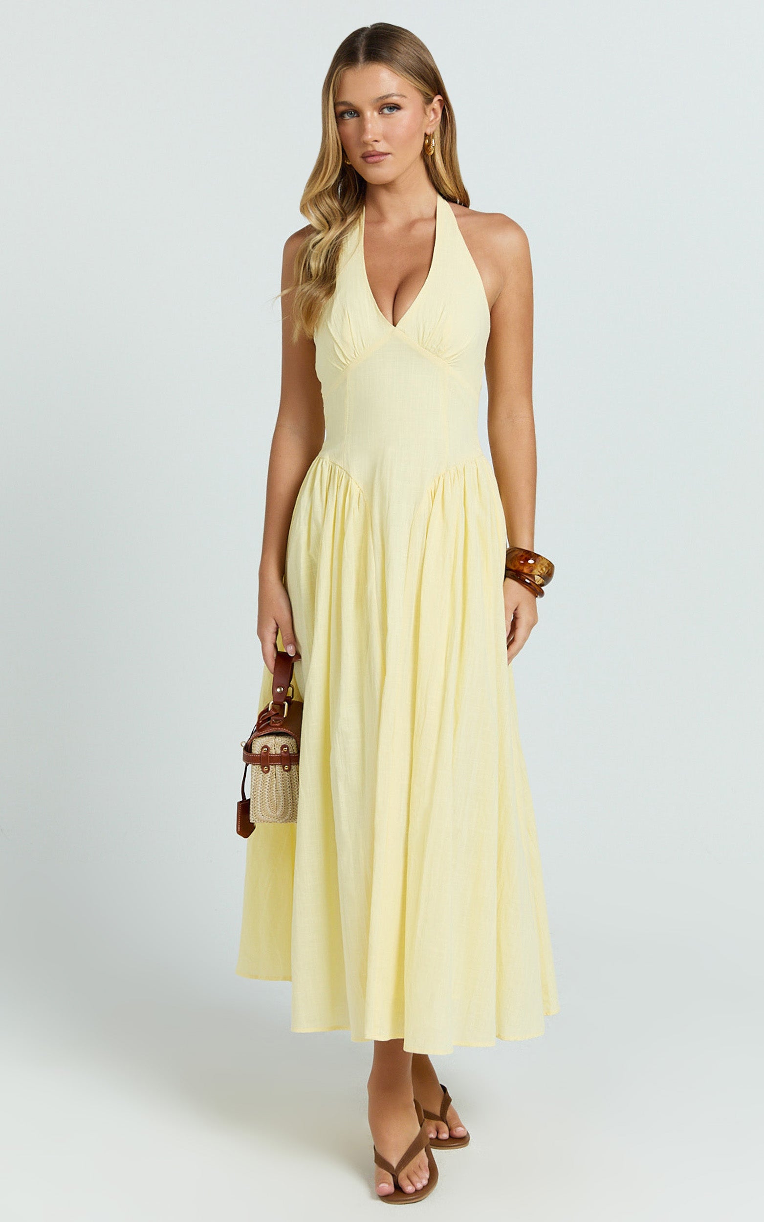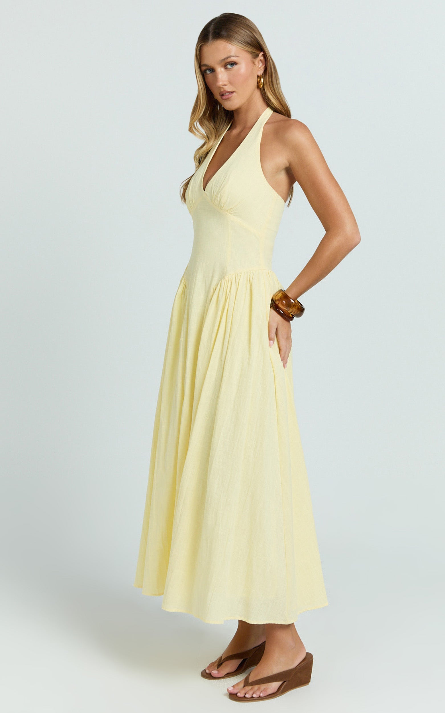 This halter drop waist midi turns heads with a soft lemon hue and flowy silhouette that skims and swishes in all the right places. The drop waist gives effortless elongation while the halter neckline frames your shoulders, perfect for long lunches, garden parties, or a beach-to-bar glow-up. Think Dresses that do the most with minimal effort.