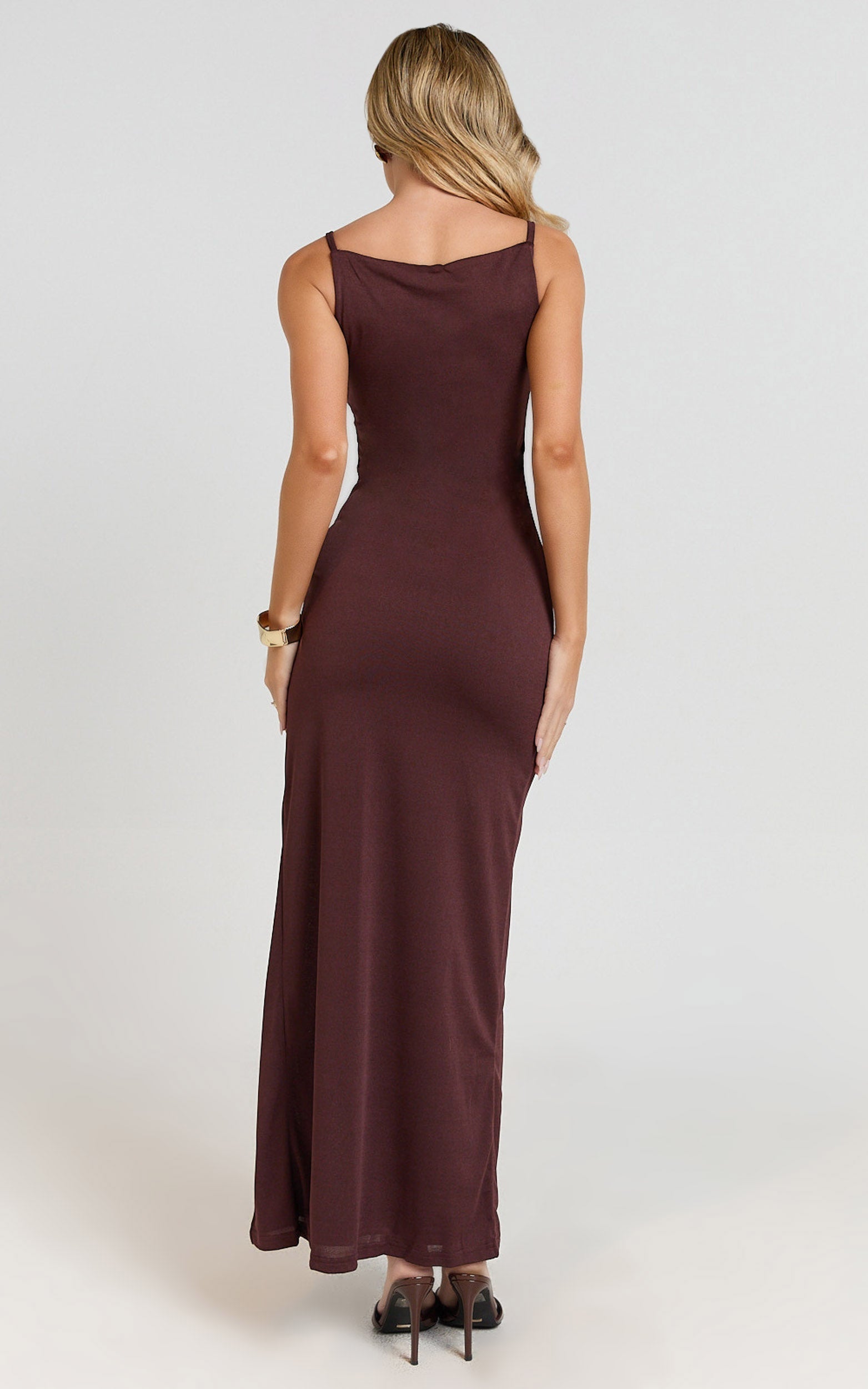 This body-hugging maxi is cut with a clean boat neck and flattering ruching that skims and smooths, serving a sculpted silhouette made for dinner-to-dance moments. The Audette Maxi Dress leans into elevated minimalism while the rich brown hue taps that luxe neutrals mood everyone’s loving.