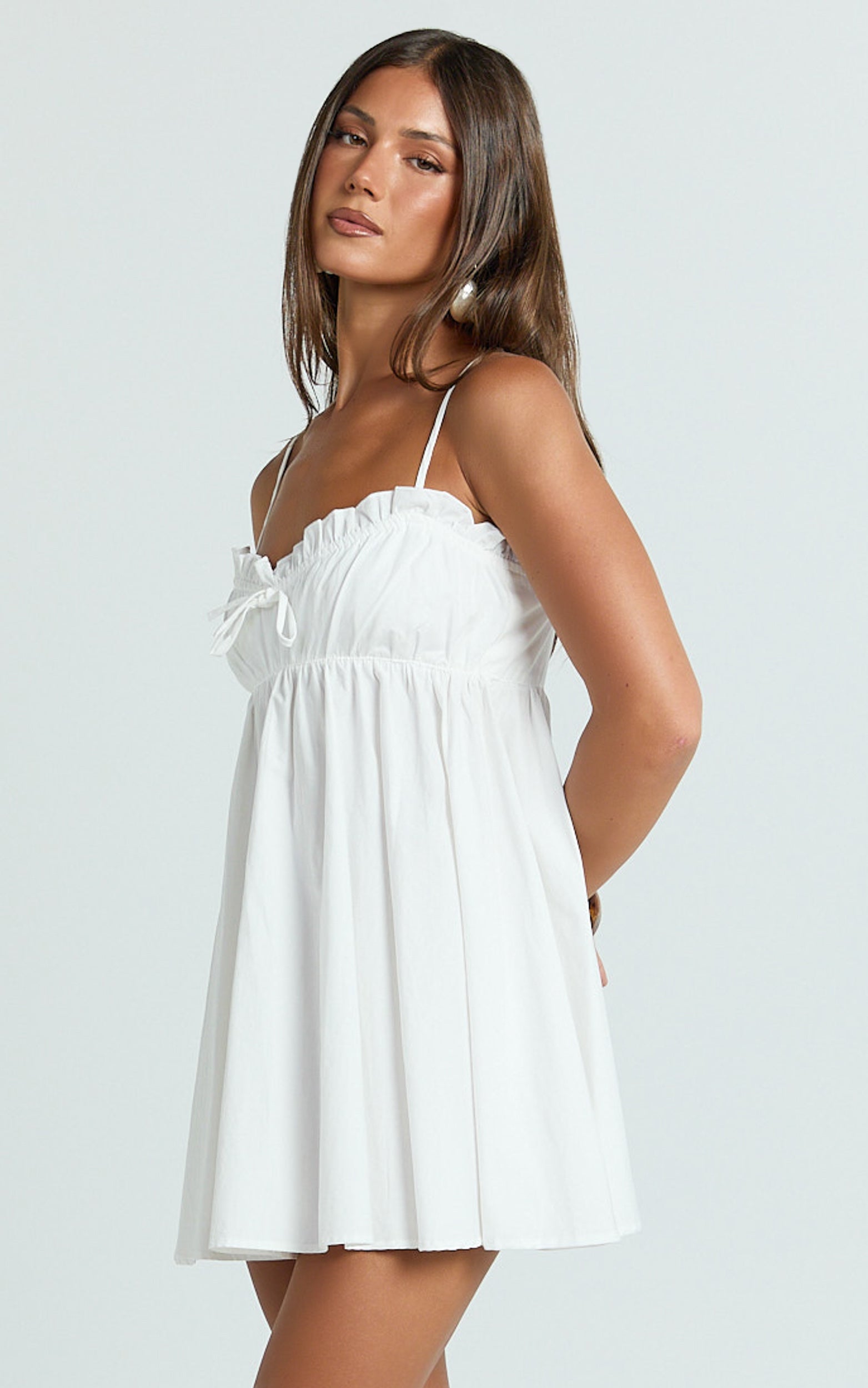 The Augustine Mini Dress in Off White is the definition of sweet-but-effortless energy. With its soft frill trimming and floaty babydoll fit, it brings that light, swishy movement that feels dreamy from every angle. The strappy neckline keeps things delicate, while the relaxed shape is comfy enough to wear all day without thinking twice. The off-white tone gives it that fresh, romantic feel—perfect for soft girl styling or a modern cottagecore moment. Wear it with ballet flats and a ribbon in your hair for something cute and flirty, or elevate it with gold hoops and kitten heels for date night. Pretty without trying too hard, Augustine is an instant add-to-cart.
