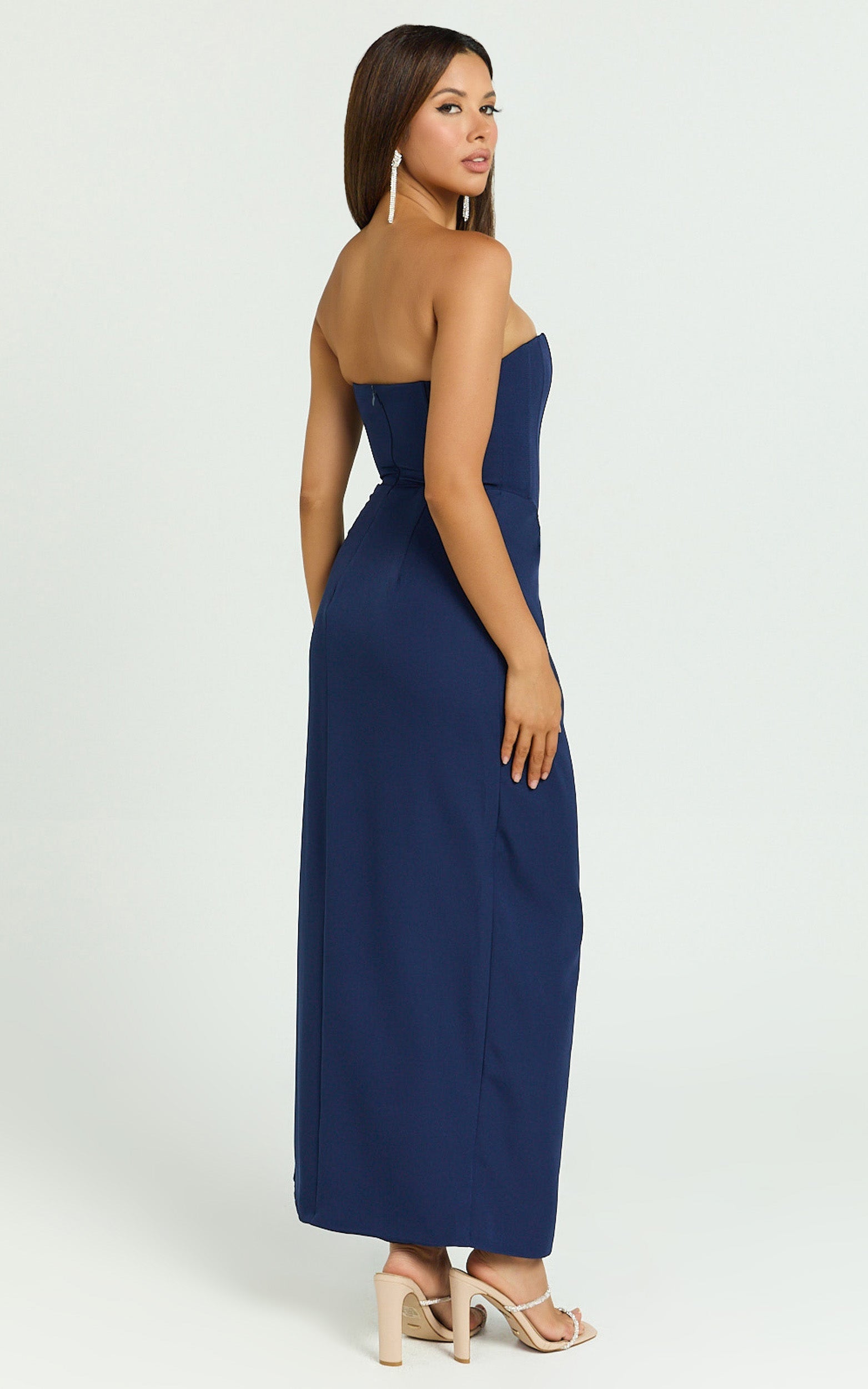 Discover the perfect look in our Avery Midi Dress, a mesmerizing strapless draped side split dress that effortlessly merges sophistication with a dash of daring. Designed for the unapologetically confident woman, this navy number is a quintessential addition to your wardrobe, that speaks volumes of your innate sense of style.