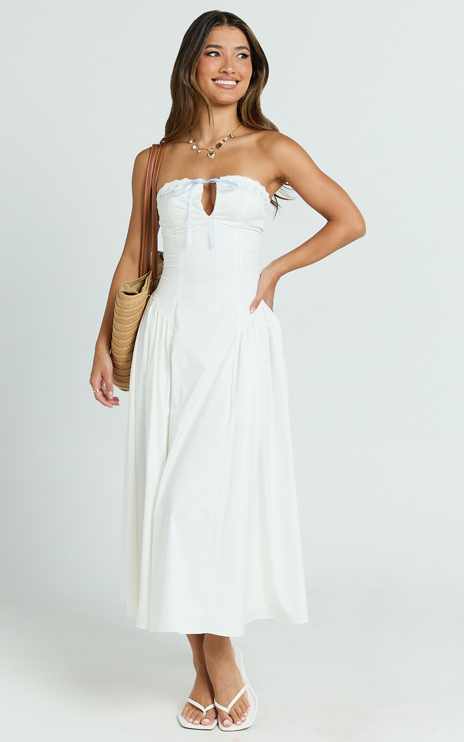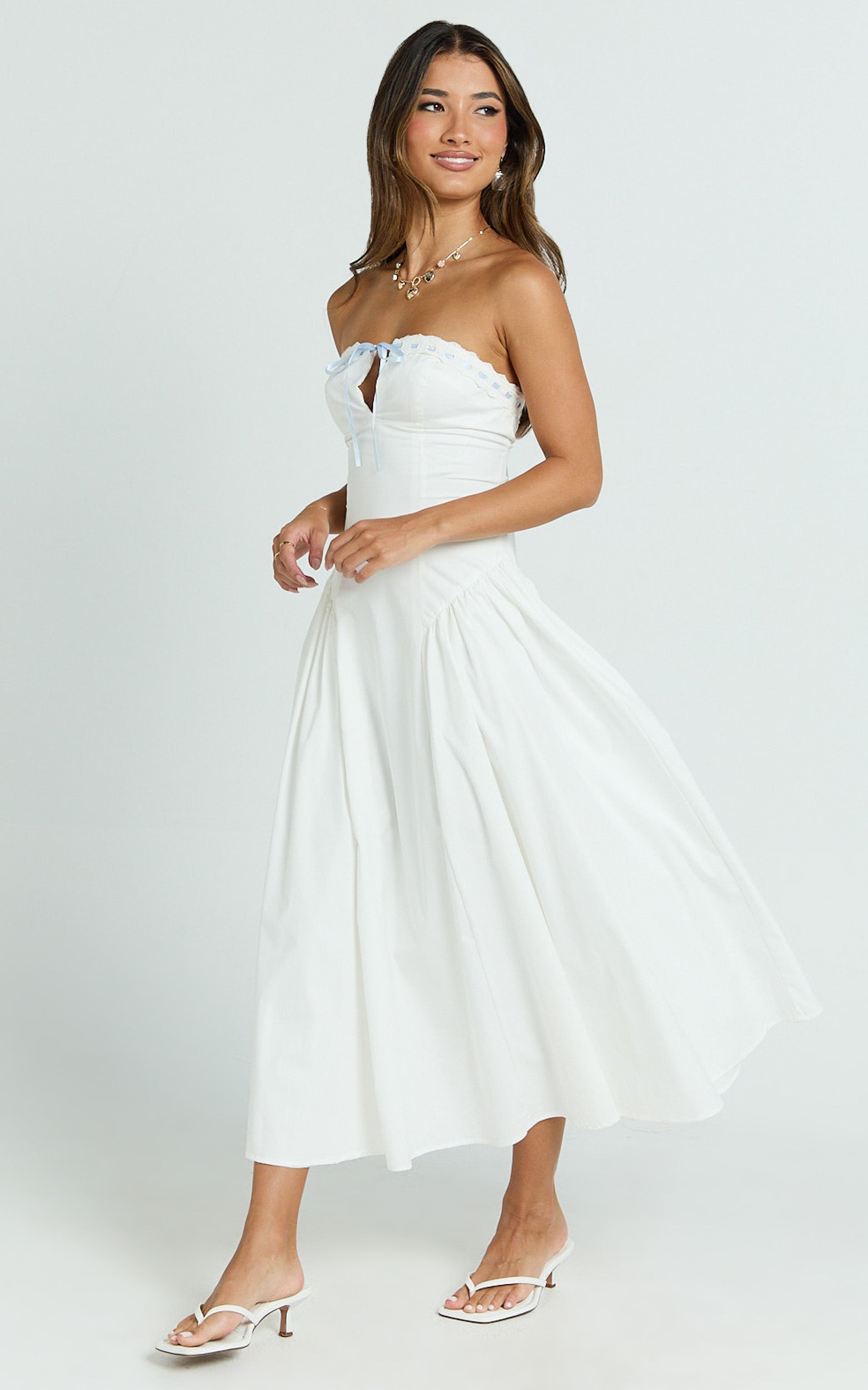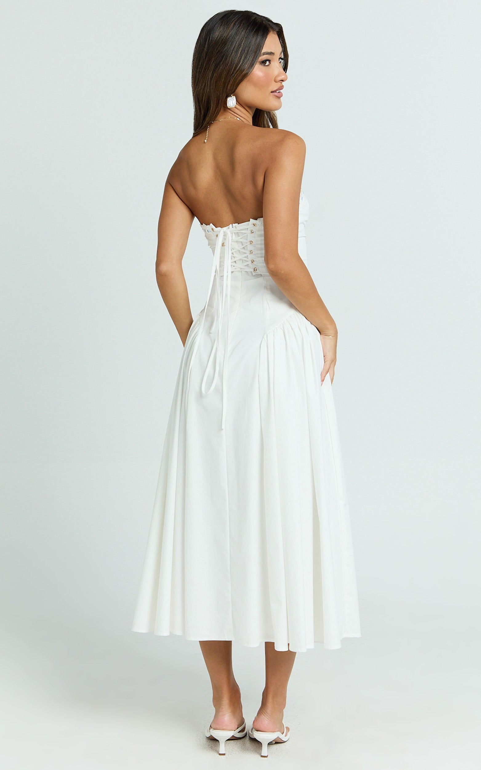 Get ready to turn heads in the Bambi Midi Dress, your quintessential piece that seamlessly merges elegance with a touch of whimsy for that perfect Party Day look. This strapless masterpiece is where comfort meets chic, crafted from the breeziest poplin cotton to ensure you feel effortlessly fabulous from day to night.