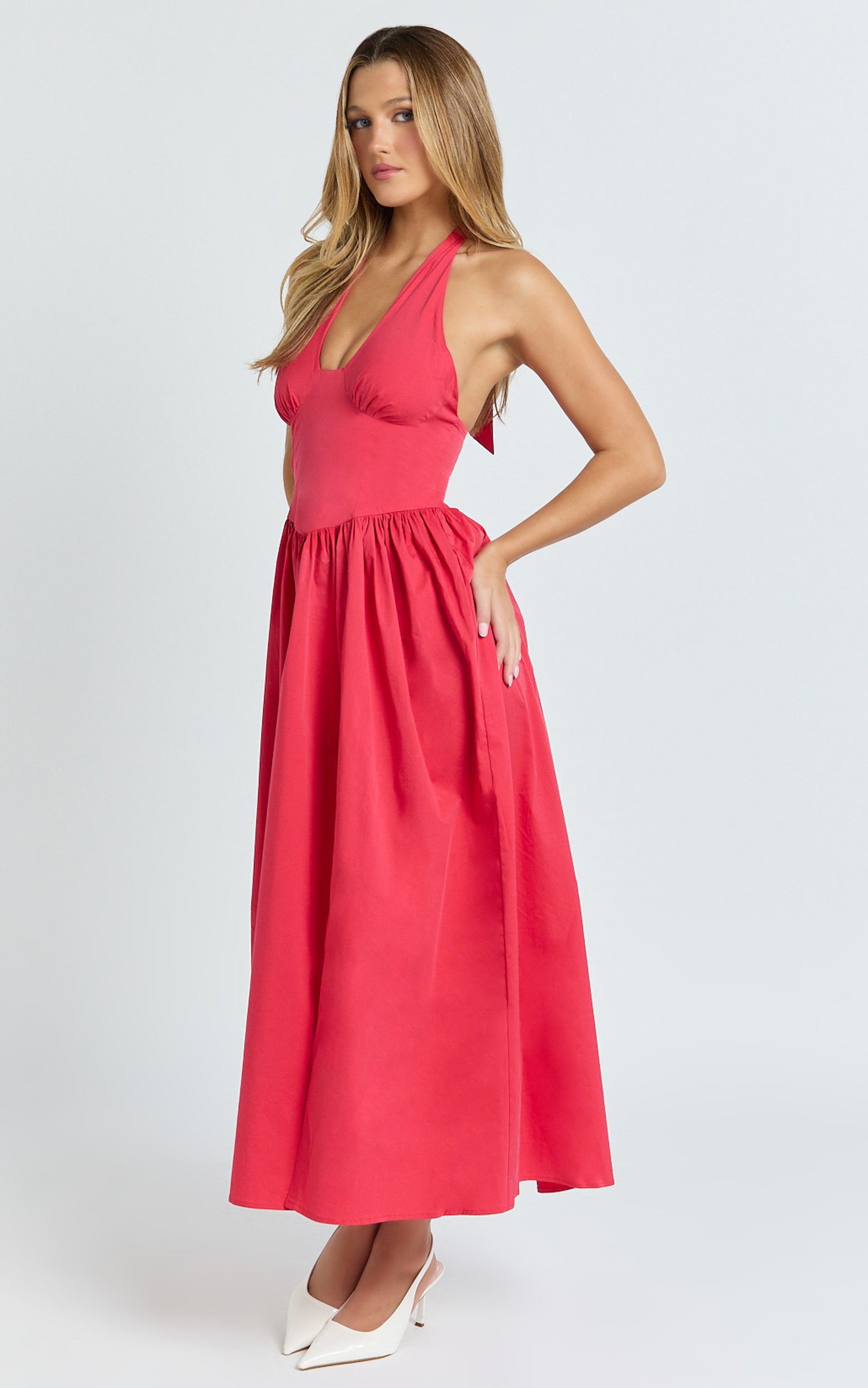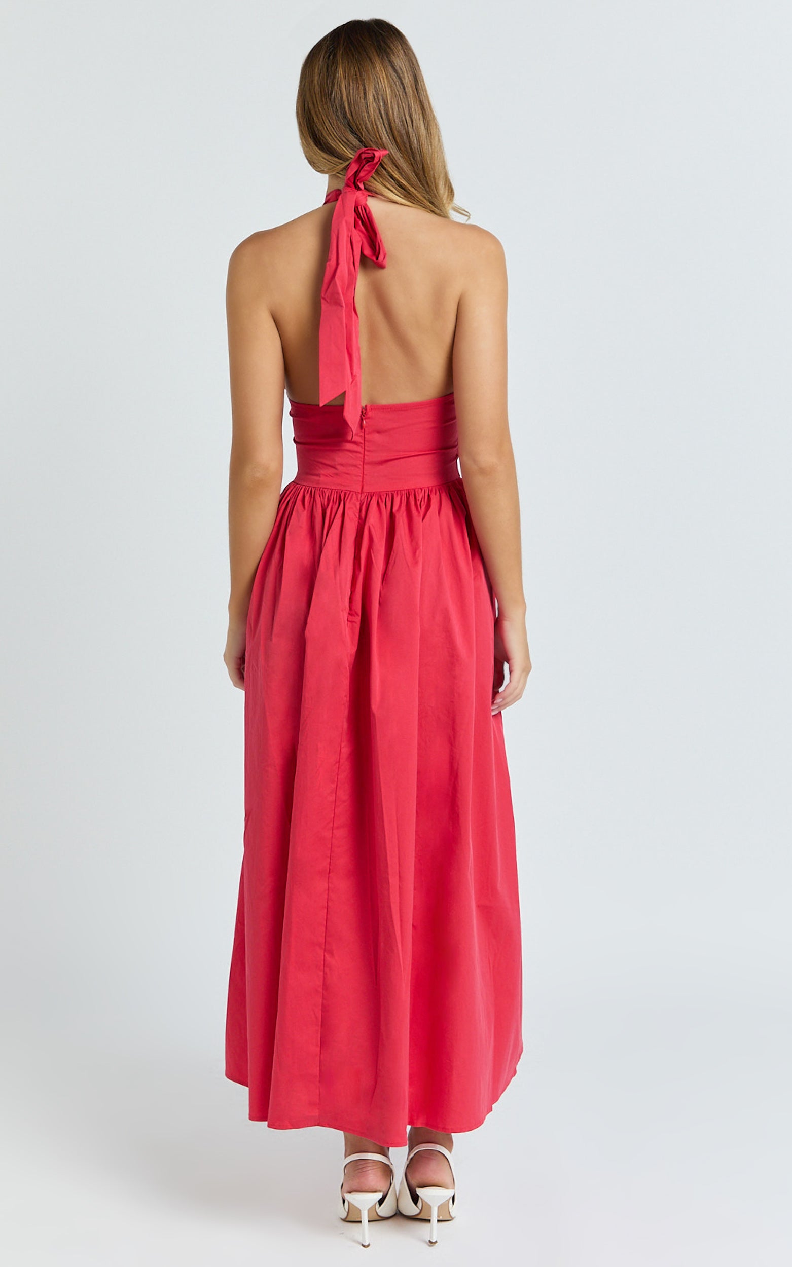 Belle Midi Dress - Keyhole Halter With V Yoke Dress In Red elevates your Dresses rotation with a flattering halter neckline that lifts, a front keyhole that teases, and a midi length that balances allure and ease. Lean into the moment with a swipe of gloss, slick hair, and mesh flats for a chic switch-up, or edge it out with leopard print accents. Either way, it’s your go-to for instant confidence and standout style.