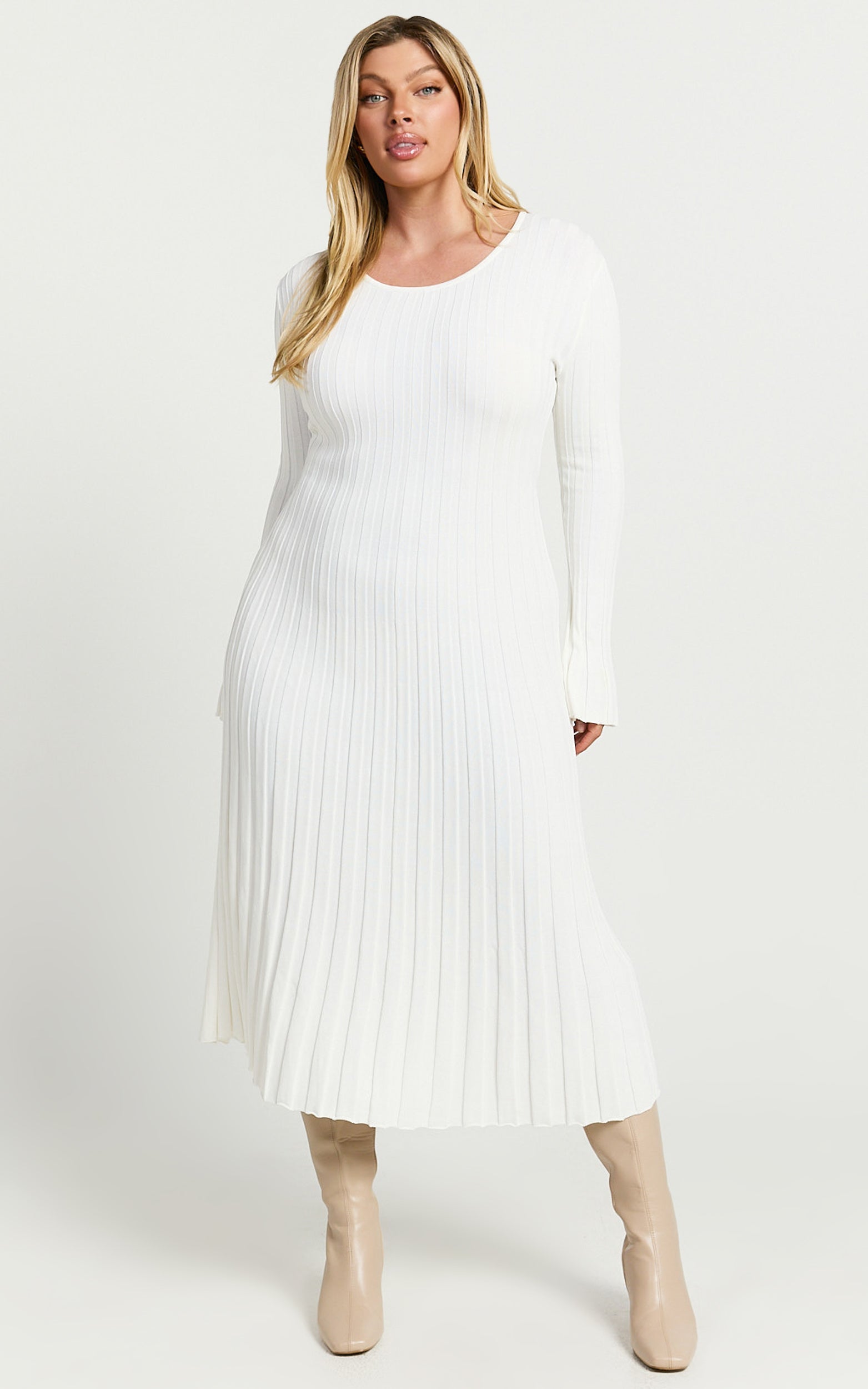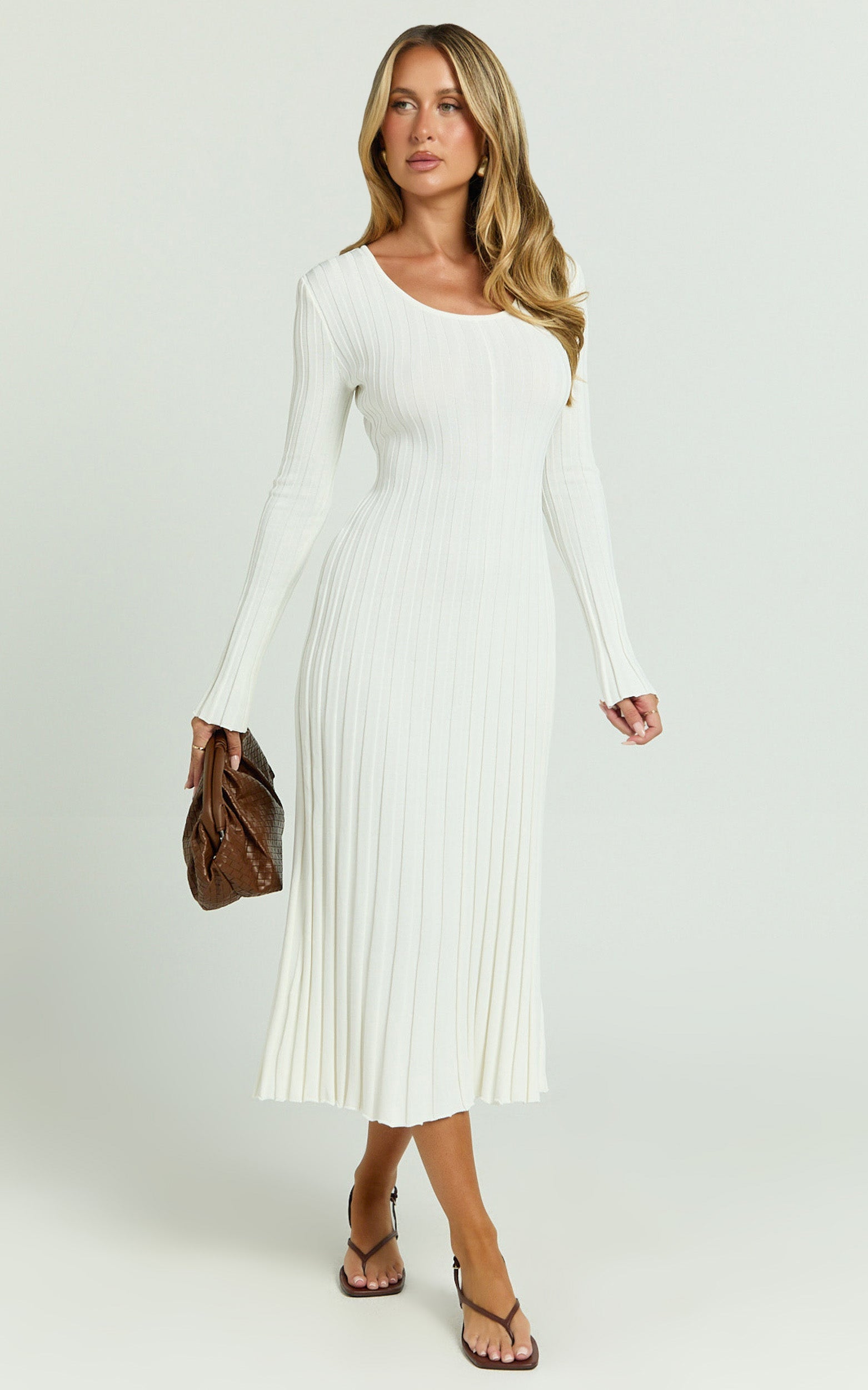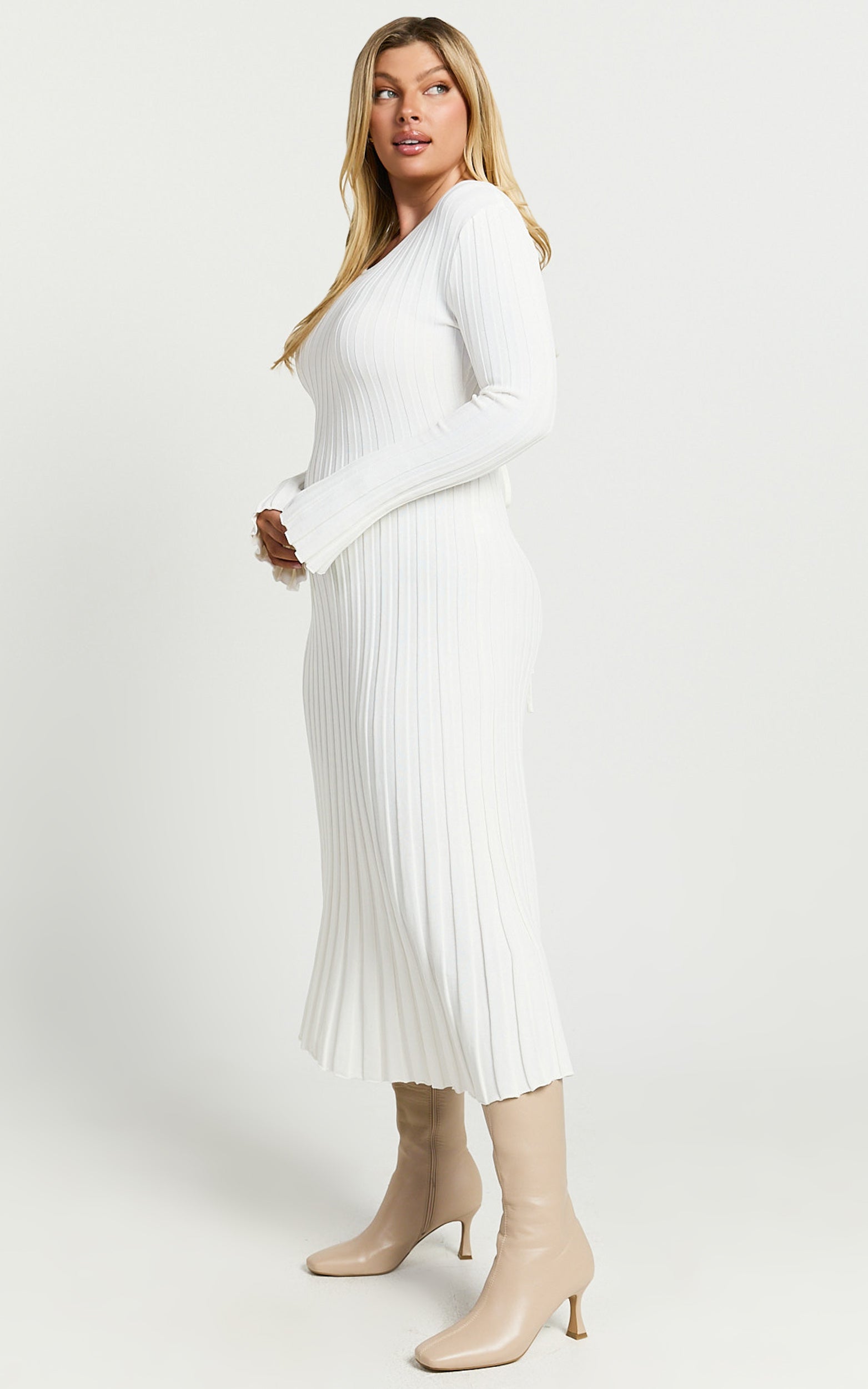 With dreamy long sleeves and a romantic tie-back detail, this ivory midi dress gently skims your silhouette before flaring out into an elegant skirt, perfect for twirling into special occasions. Pair it with Bow Detailed Pumps and a chic Mini Evening Bag to elevate your style even further.