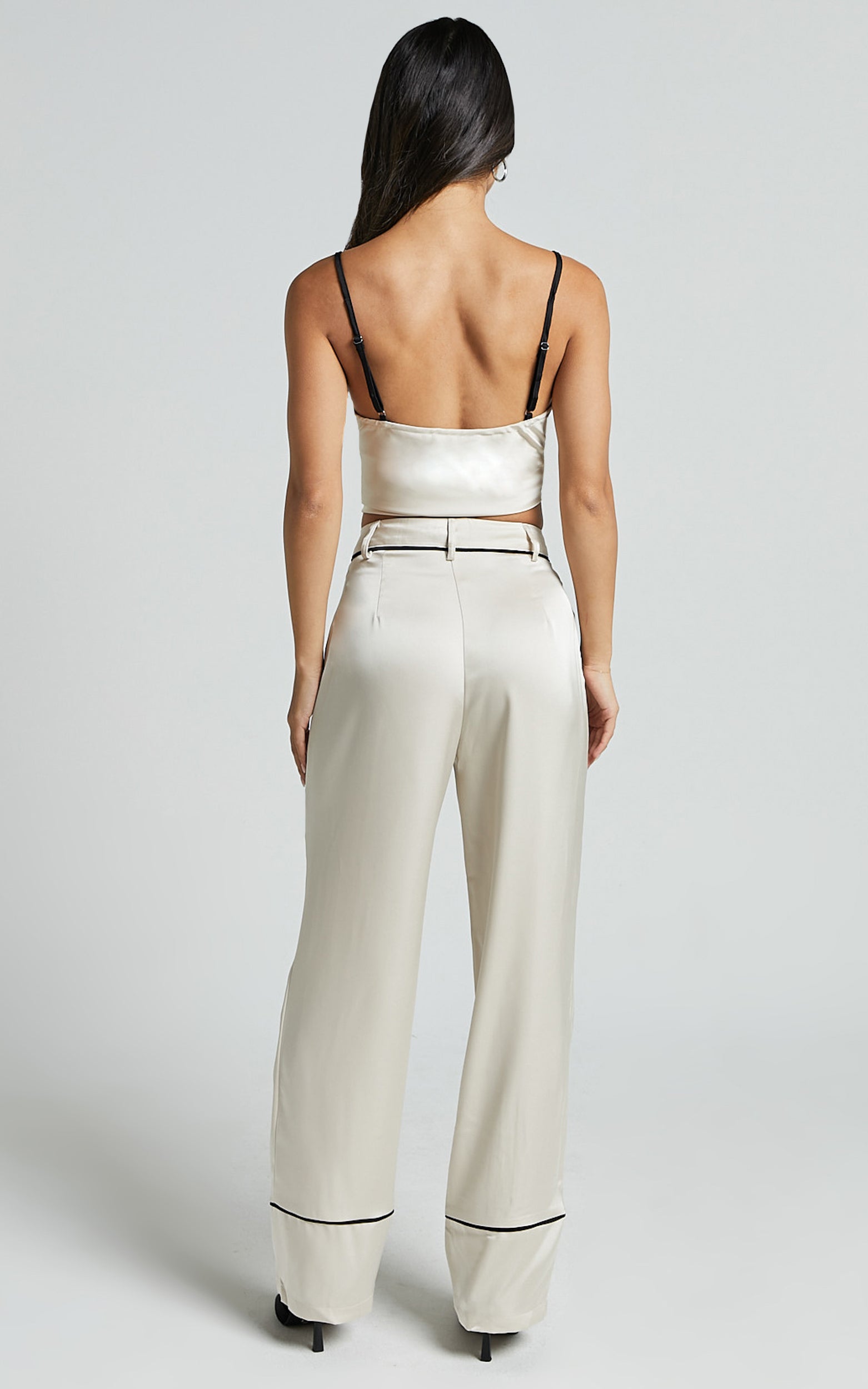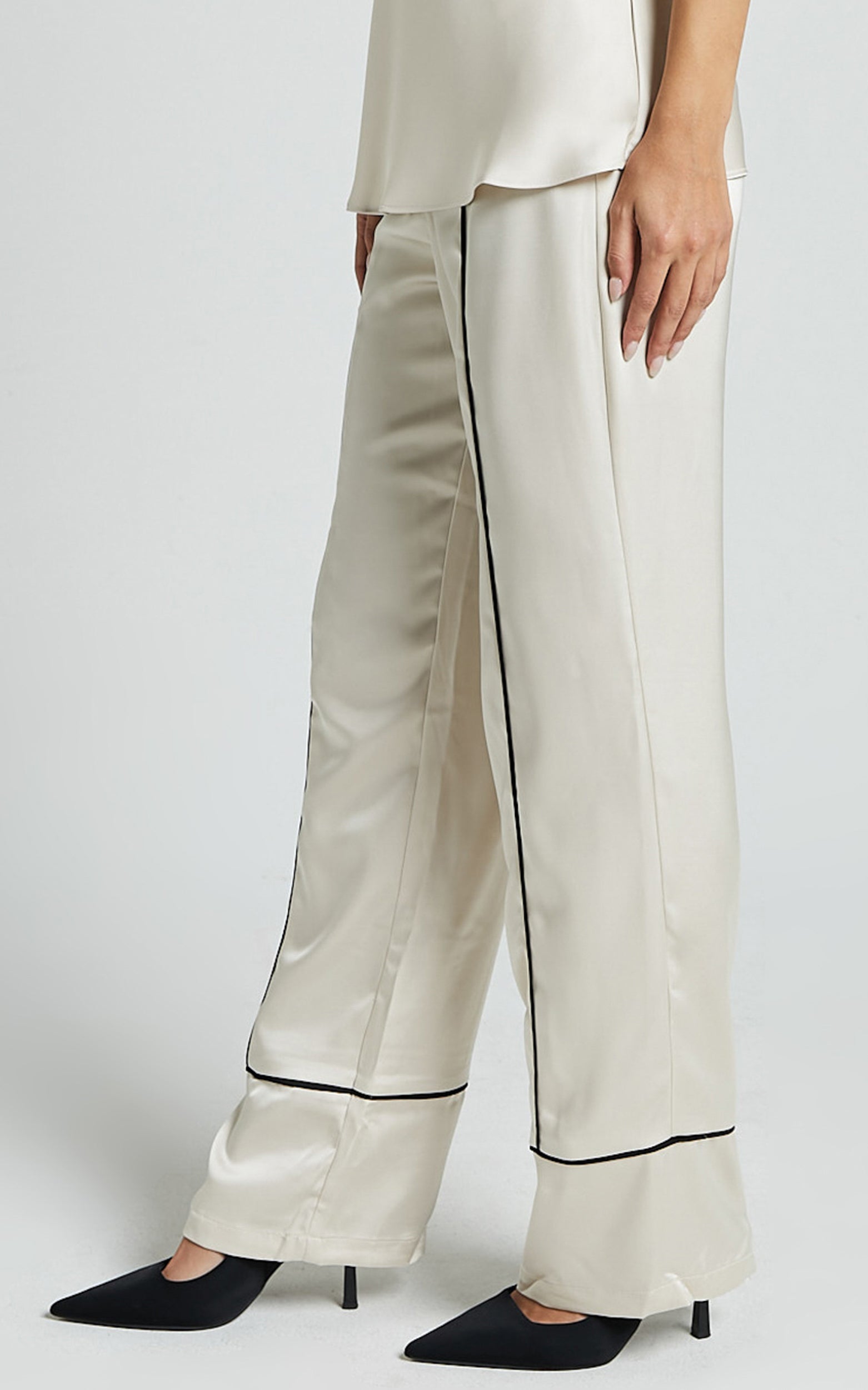 Stand out from the crowd in our Bobbie Pants - High Waist Contrast Piping Pants In Oyster. These elegant white pants are perfect for any party night, with their high waist and full-length design adding a touch of sophistication to your look. Made from a mid-weight woven polyester fabric, these relaxed pants offer both comfort and style. The contrast piping detail along the sides adds an extra pop of interest, making them a statement piece that will turn heads wherever you go. Step into these Bobbie Pants and embrace your empowered self as you conquer the dance floor or social event of your choice!