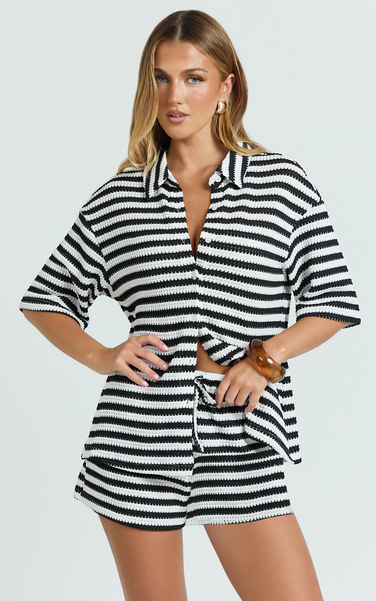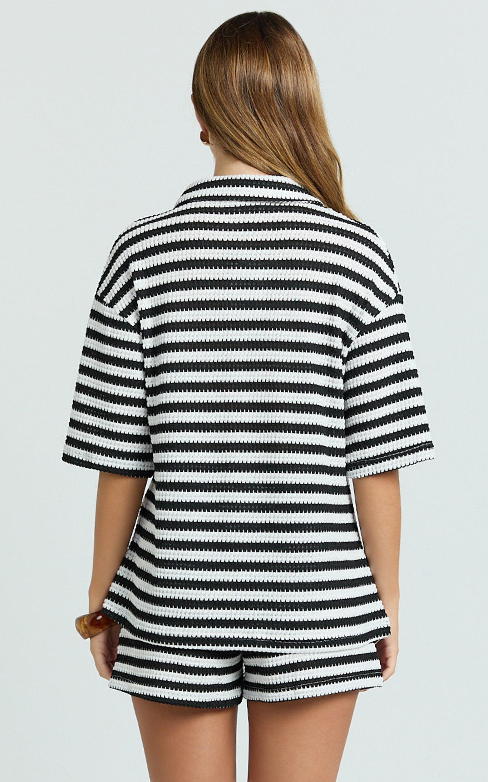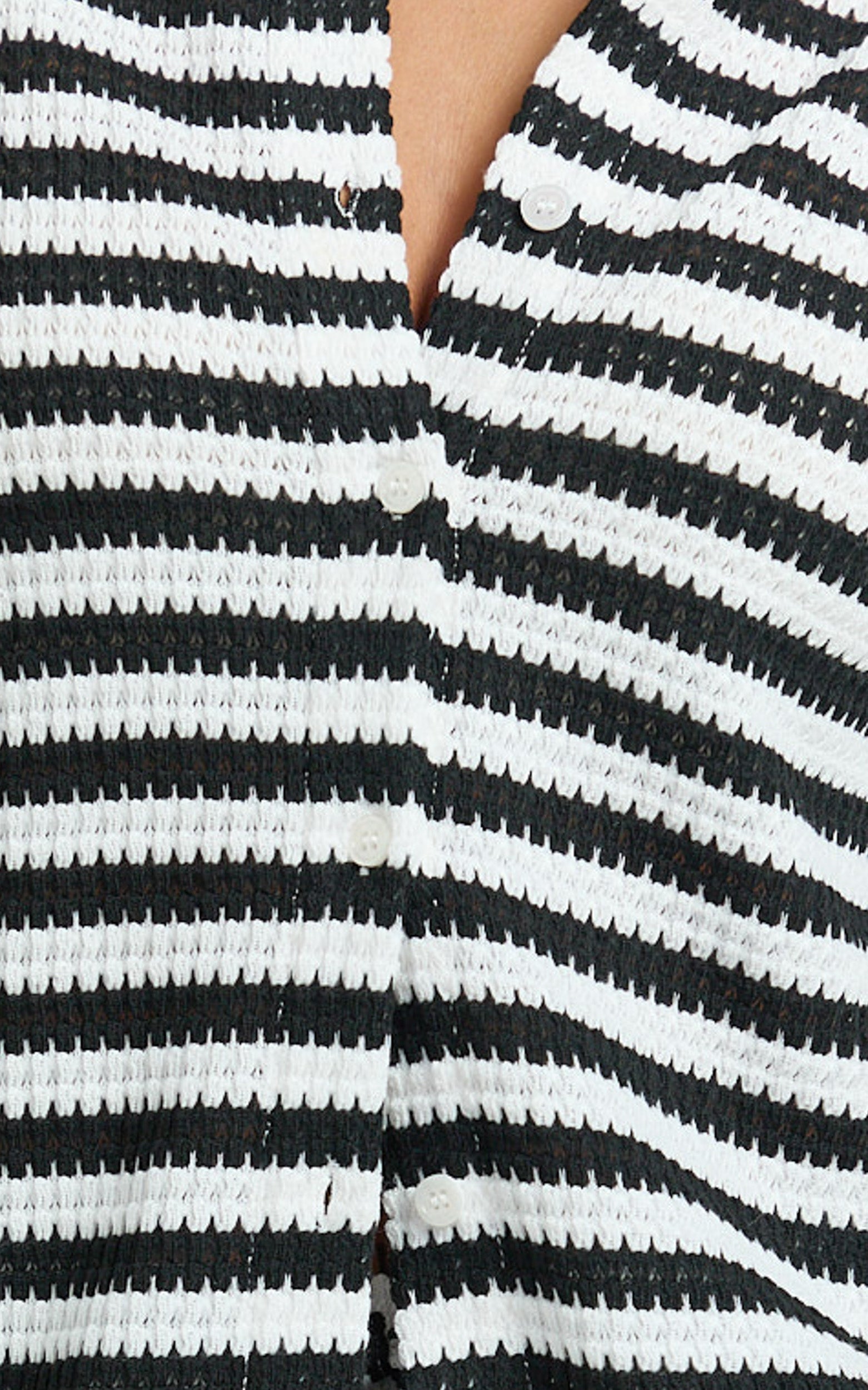 Brenda Top - Textured Stripe Drop Shoulder Button Down Shirt In White/Black levels up your Tops game with a relaxed fit, curved hem, and classic collar that works from brunch to beach walks. Style it open over a white tank top, add oversized sunglasses and a shell pendant necklace, or pair with Capri pants for clean lines. It’s the versatile shirt you’ll reach for on repeat, polished, breathable, and made to mix with everything.