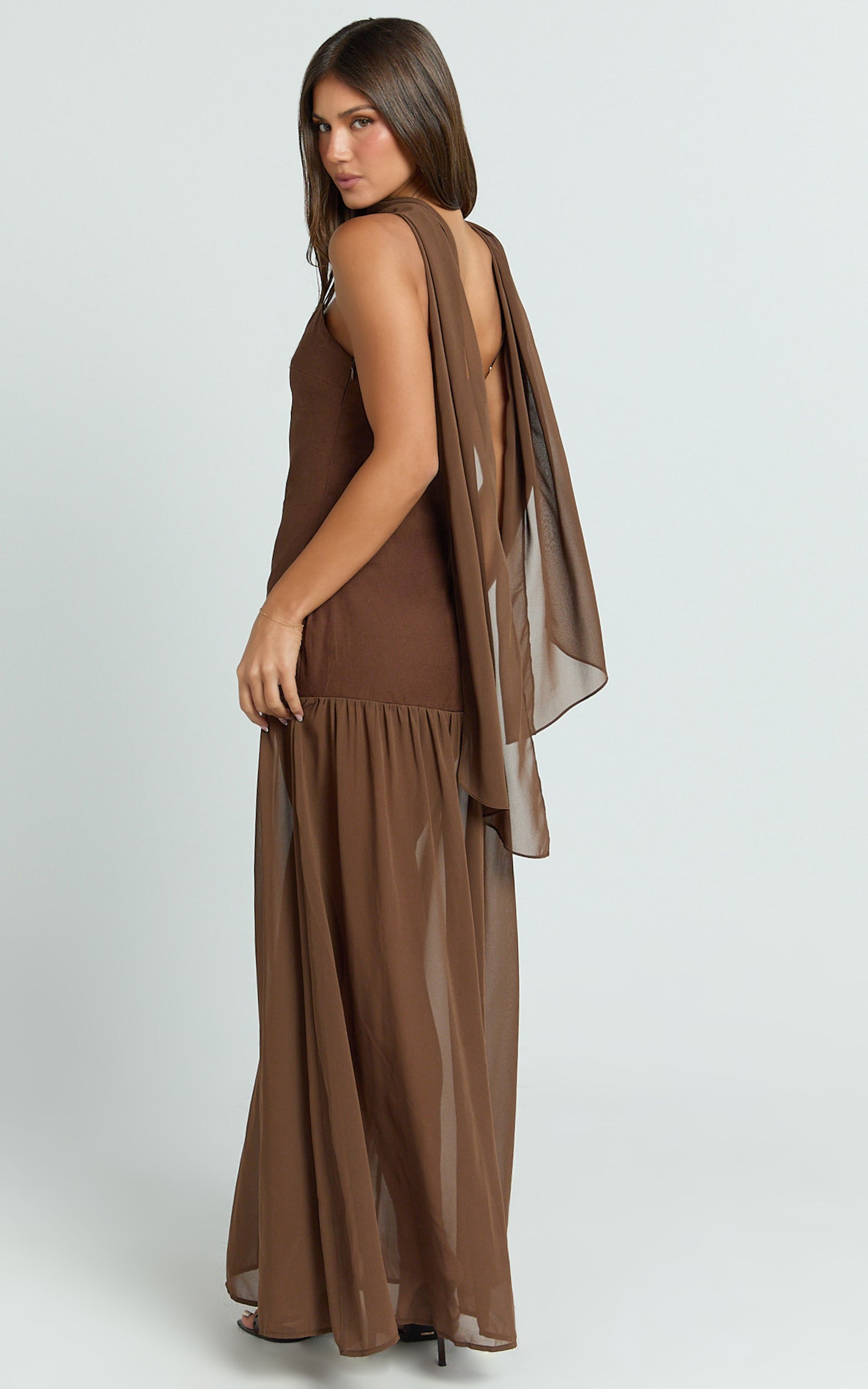 Calvin Maxi Dress - Linen Look Contrast Georgette Skirt With Neck Scarf In Chocolate brings floaty elegance in a deep, Dark Brown shade that flatters every skin tone. Style it with minimalist thongs for a modern finish or go High Shine with statement earrings and an oversized bag for polished glamour. A timeless silhouette that feels trend-forward and photo-ready from first sip to final dance.
