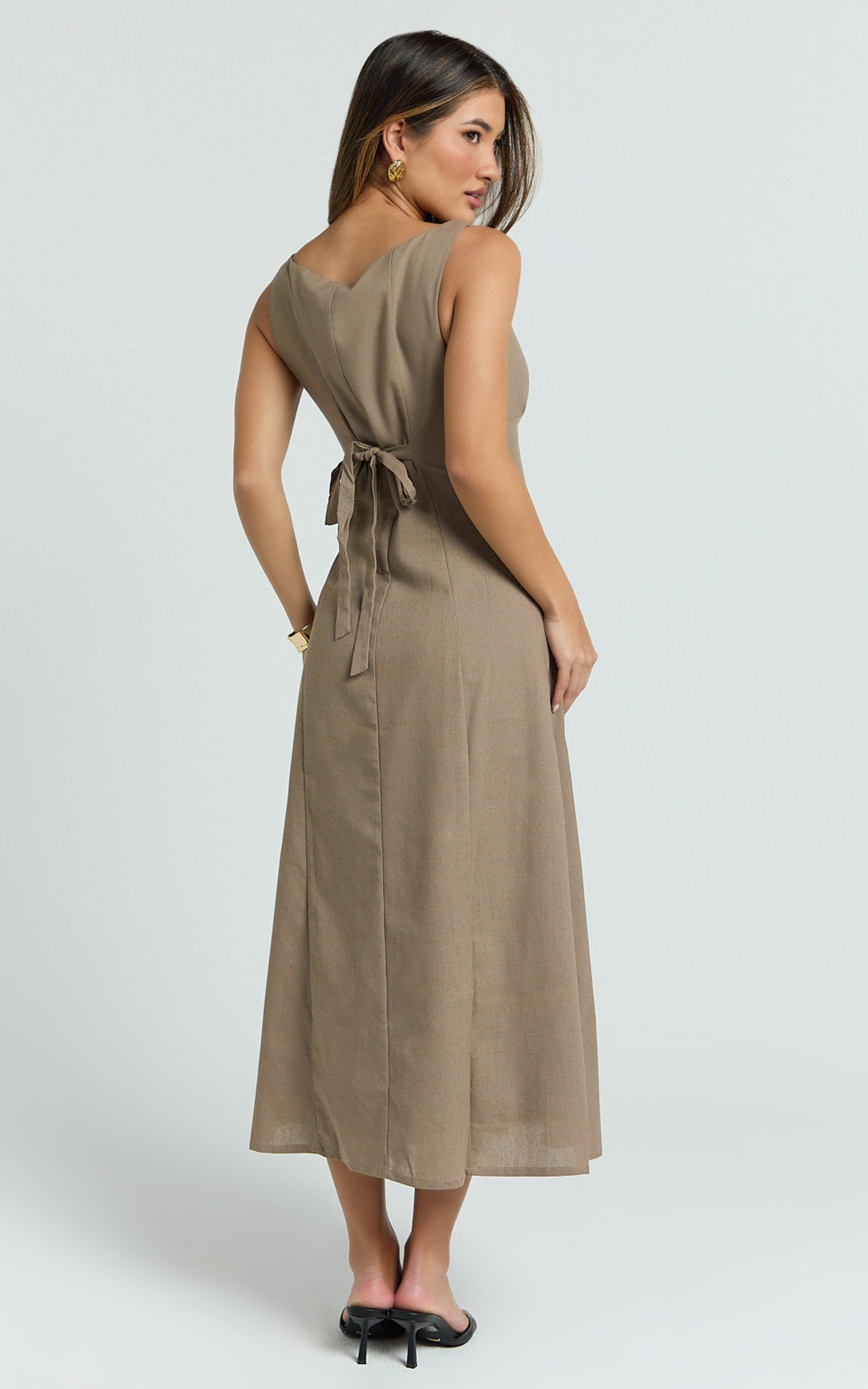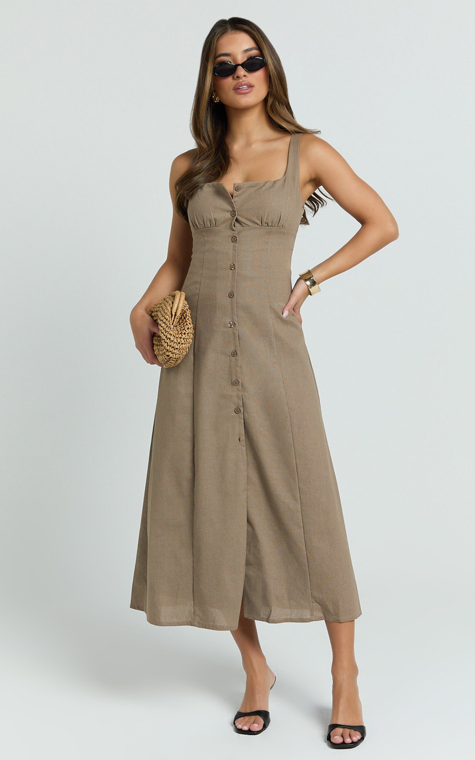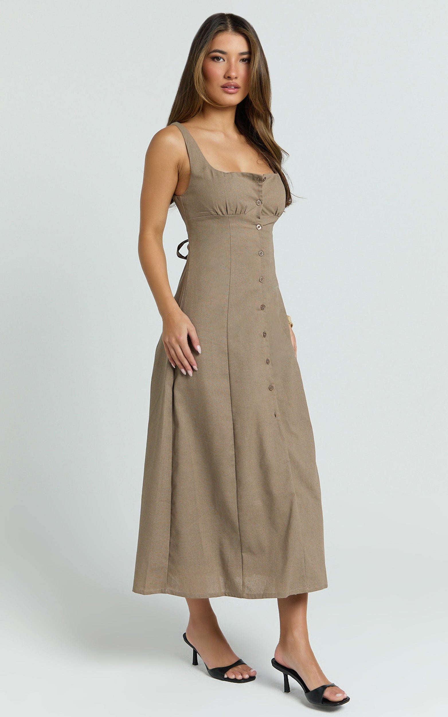 Cameron Midi Dress - Button Front Tie Back Dress In Mocha levels up with subtle Bowcore vibes and pairs effortlessly with thong sandals for that sleek, leg-lengthening finish. Style it for brunch or date night, its versatile cut and flattering shape make it an instant rotation favorite. Dresses that do it all? This is the one.