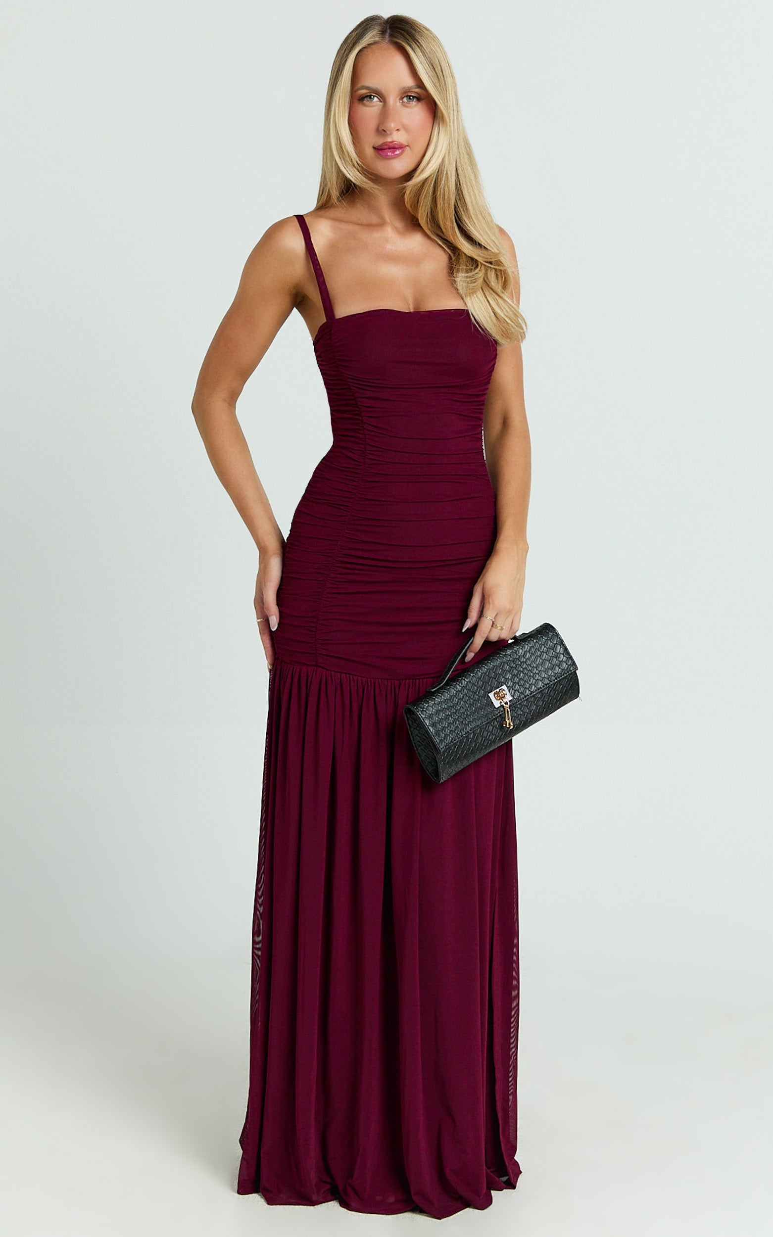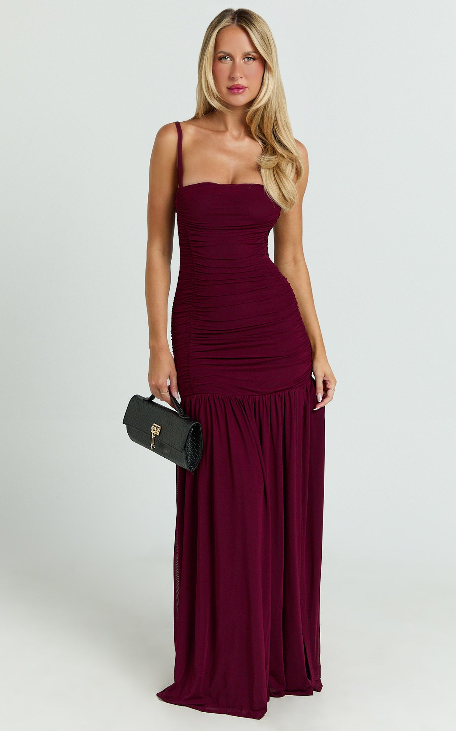 The Cardi Maxi Dress - Ruched Mesh High Leg Split Dress In Wine nails the Dresses brief with a polished yet playful vibe that’s so now. Style it with minimalist heels and a delicate clutch for a refined finish. On-trend details meet fashion-forward appeal with artisanal ruching and a limited edition feel, made for RSVPs, red lips, and late nights.