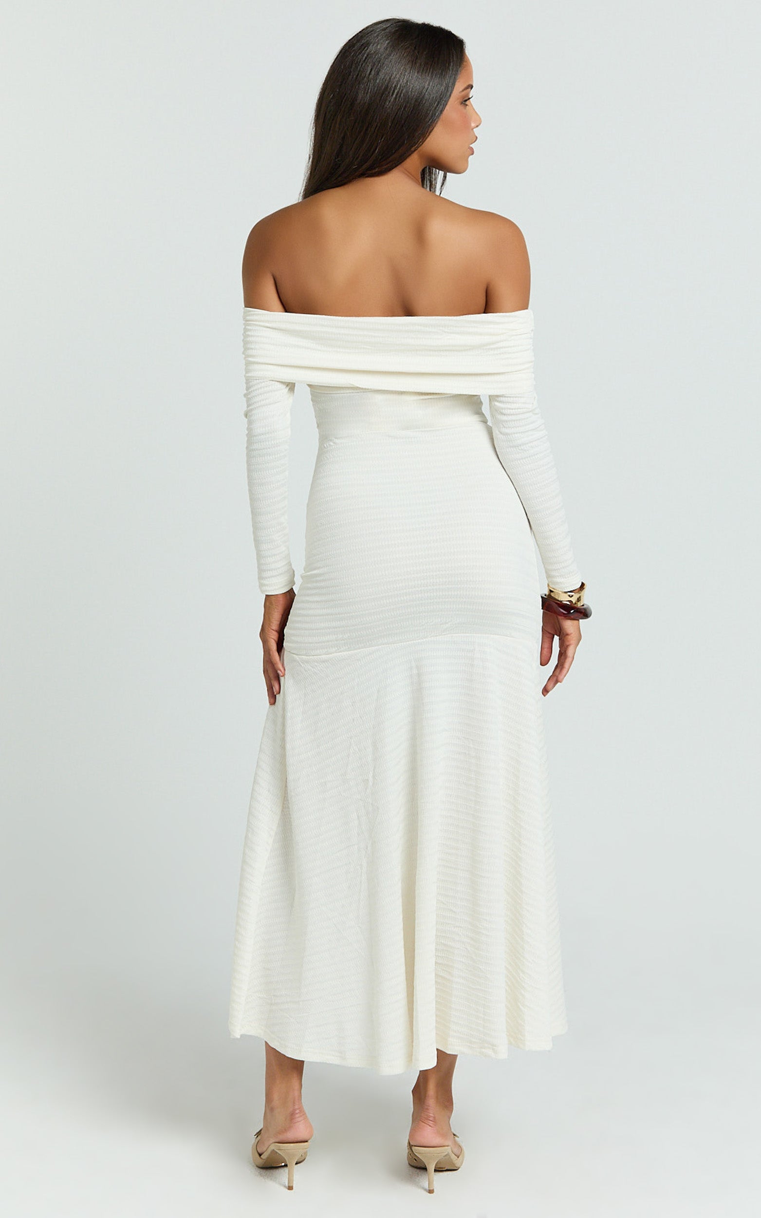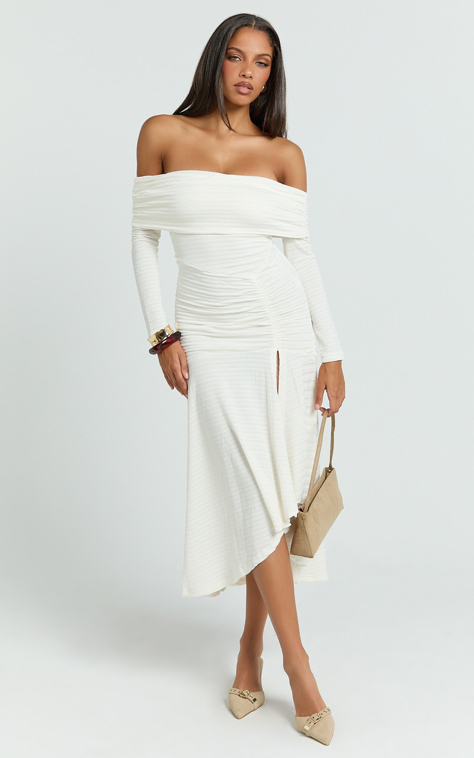 A fitted long sleeve bodice balances the flounce skirt, giving you that Minimalist silhouette with a Statement twist, perfect for engagement parties, hens, birthdays or any event where a white dress wins. The ivory hue keeps it Monochrome-clean and camera-ready, while the off-shoulder neckline brings just the right amount of drama.