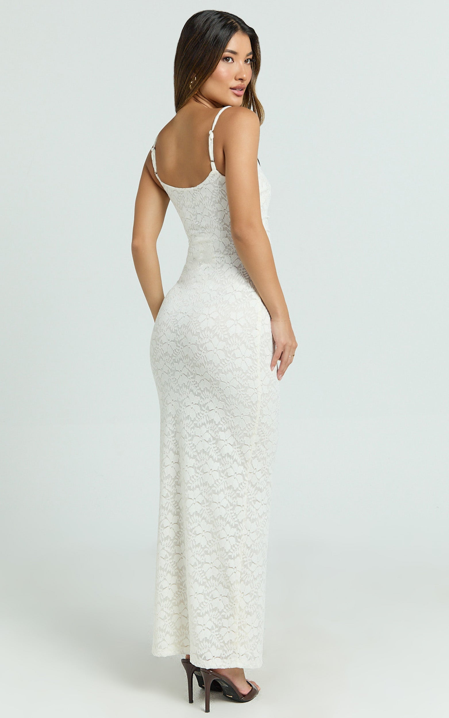 Meet Carly Maxi Dress – Stretch Lace Scoop Neck Dress In Off White. The ankle-grazing length balances the fitted shape for a refined finish, while the clean scoop front and back keep it sleek and photograph-ready. Style with strappy heels and a petite shoulder bag for minimalist fashion energy, or add statement earrings to lean into maximalist dressing. Consider it one of our buzziest items this season, timeless, versatile, and made to stun.