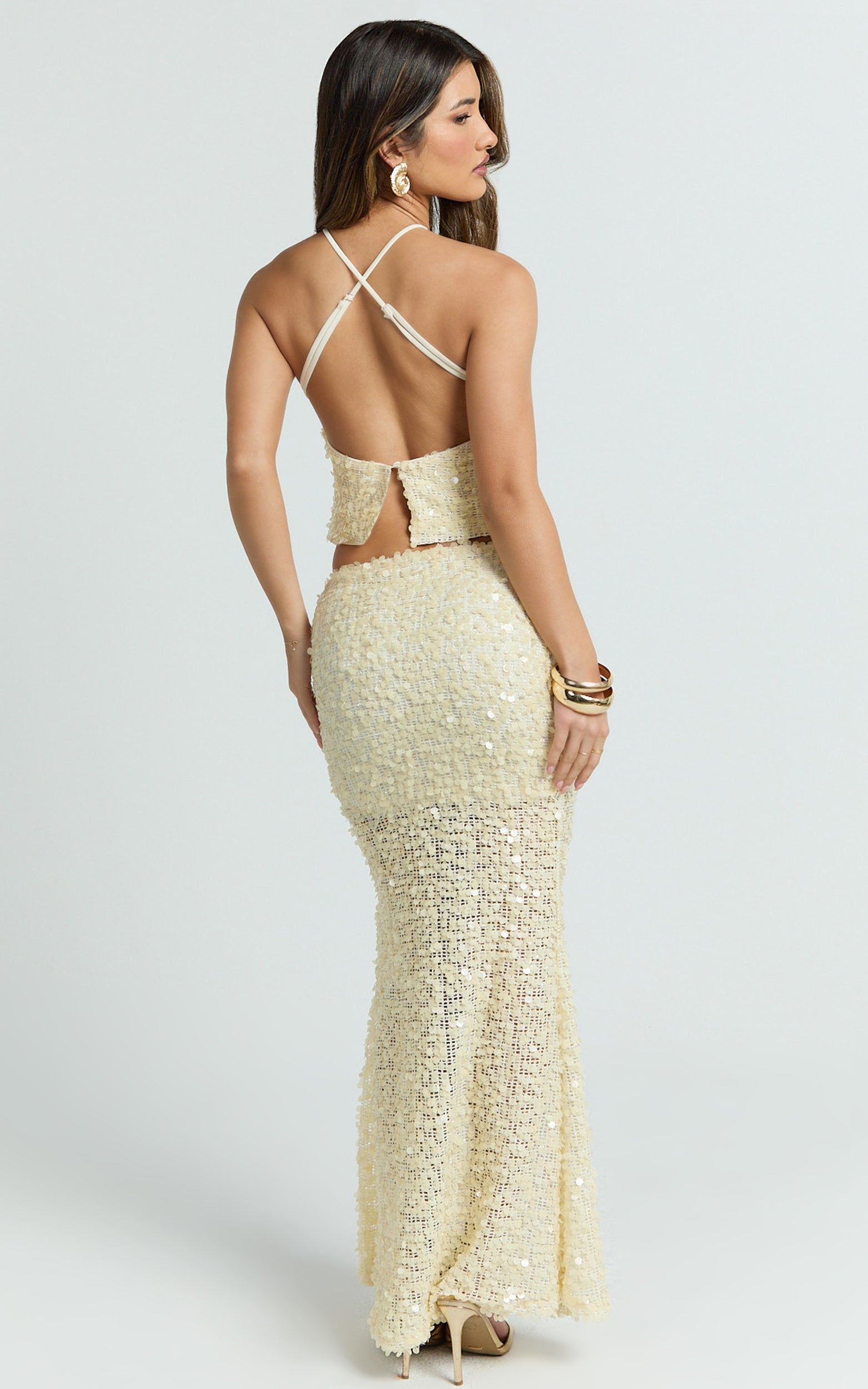 The Celeste Maxi Skirt brings full-on glam thanks to dazzling all-over sequins and an elegant fit-and-flare cut that skims the waist then drapes beautifully to the floor, perfect for nights when you want all eyes on you.