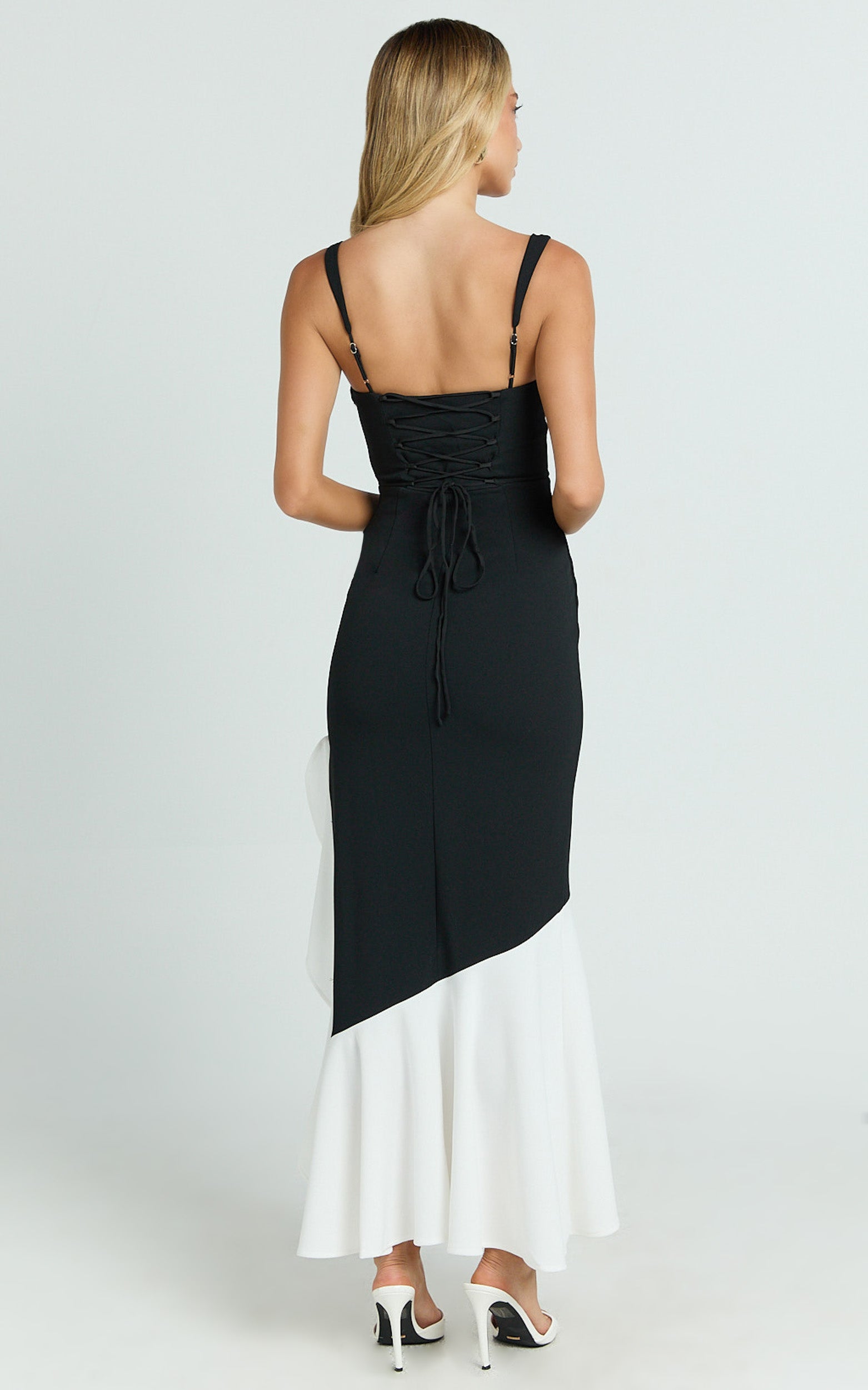 Cut with an asymmetrical contrast frill hem and a sleek silhouette, this White maxi brings drama without trying too hard, perfect for parties, date nights, and any dressy occasion. A little flirt, a lot of polish, and totally camera-ready.