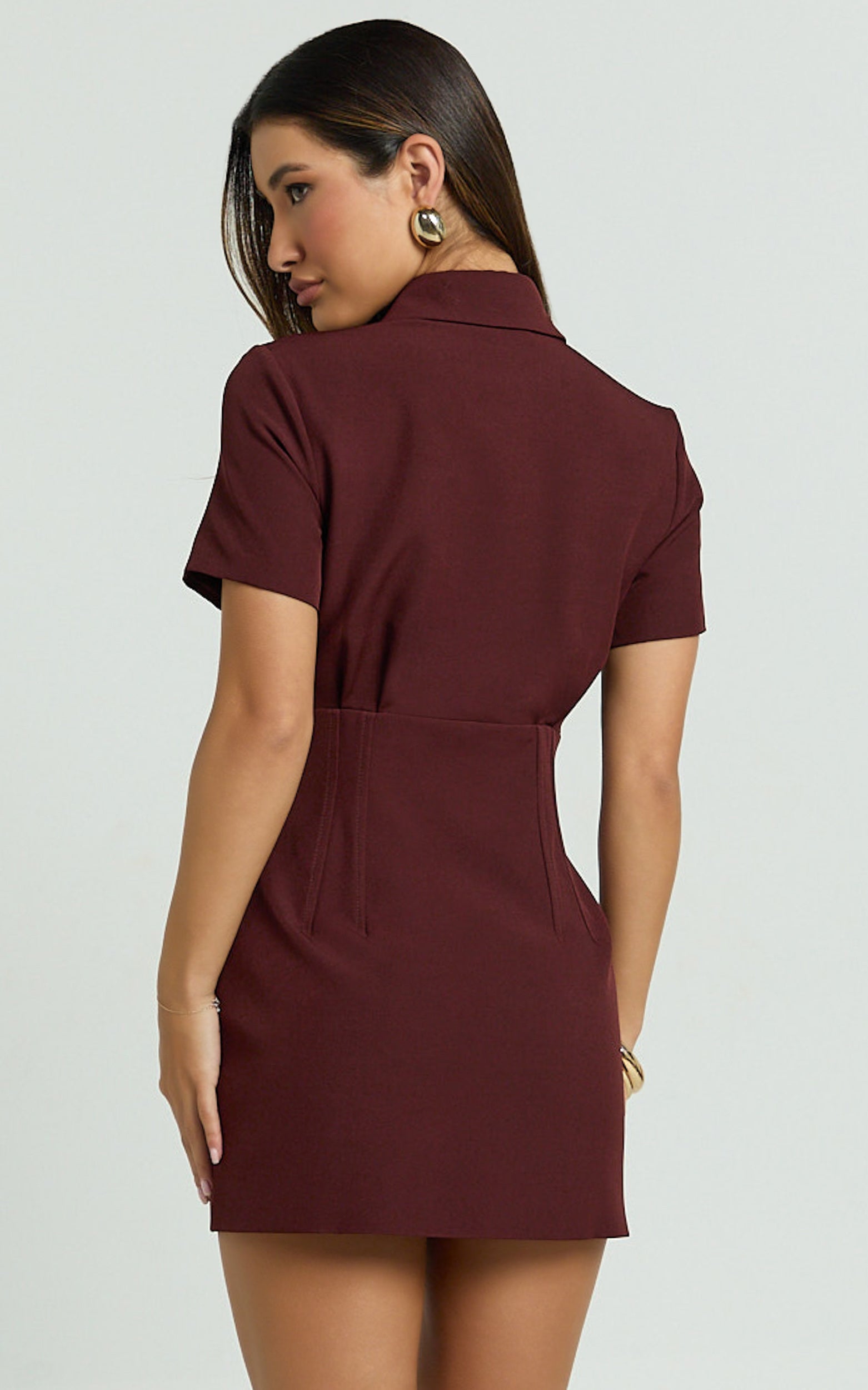 Cut in a rich mahogany brown with a sleek placket front and curve-hugging silhouette, it’s the mini that goes from desk to drinks in a heartbeat. Think polished collar, long sleeves, and a length that shows off legs—perfect for slipping into your Dresses lineup for a refined yet flirty vibe.