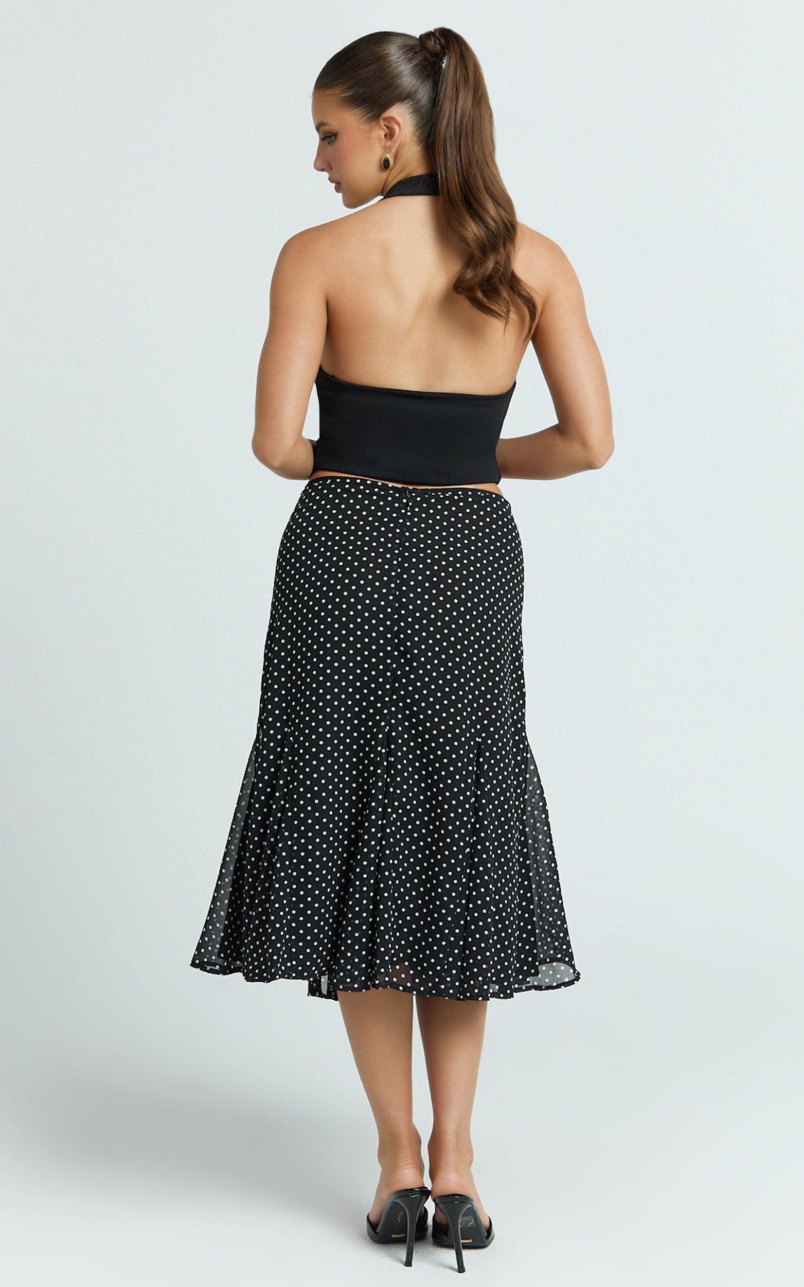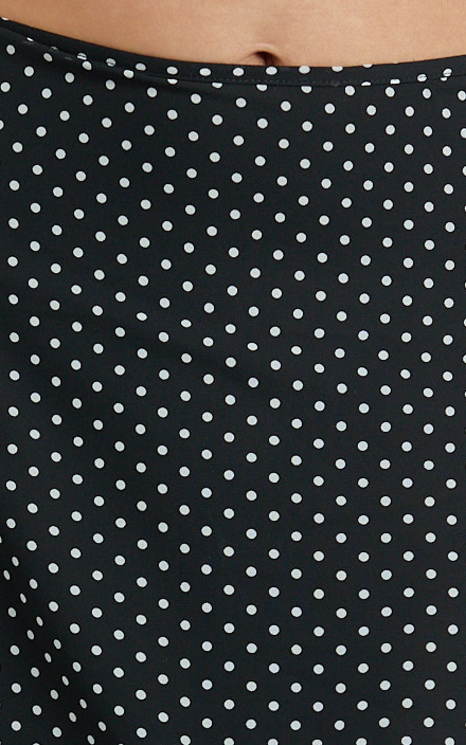 Charlie Midi Skirt - Polka Dot Low Waist Godet Skirt In Black nails the trending low-rise silhouette with a midi length that elongates and elevates. A true cult-favourite vibe, it cinches subtly at the hips and flares just right for a waist-snatching effect. Perfect for dressing up or down, this versatile midi skirt is your go-to for polished looks that feel effortless.