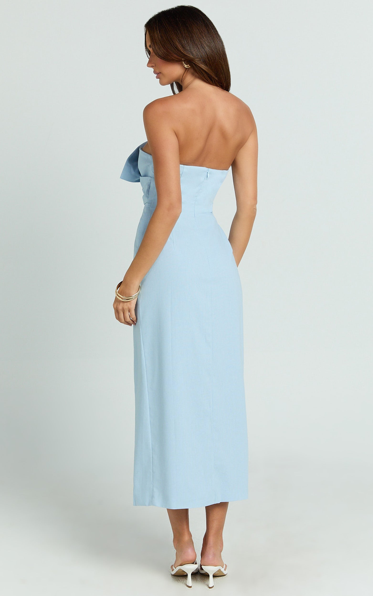 **Chika Midi Dress - Linen Look Strapless Bow Front High Split Dress In Pale Blue**