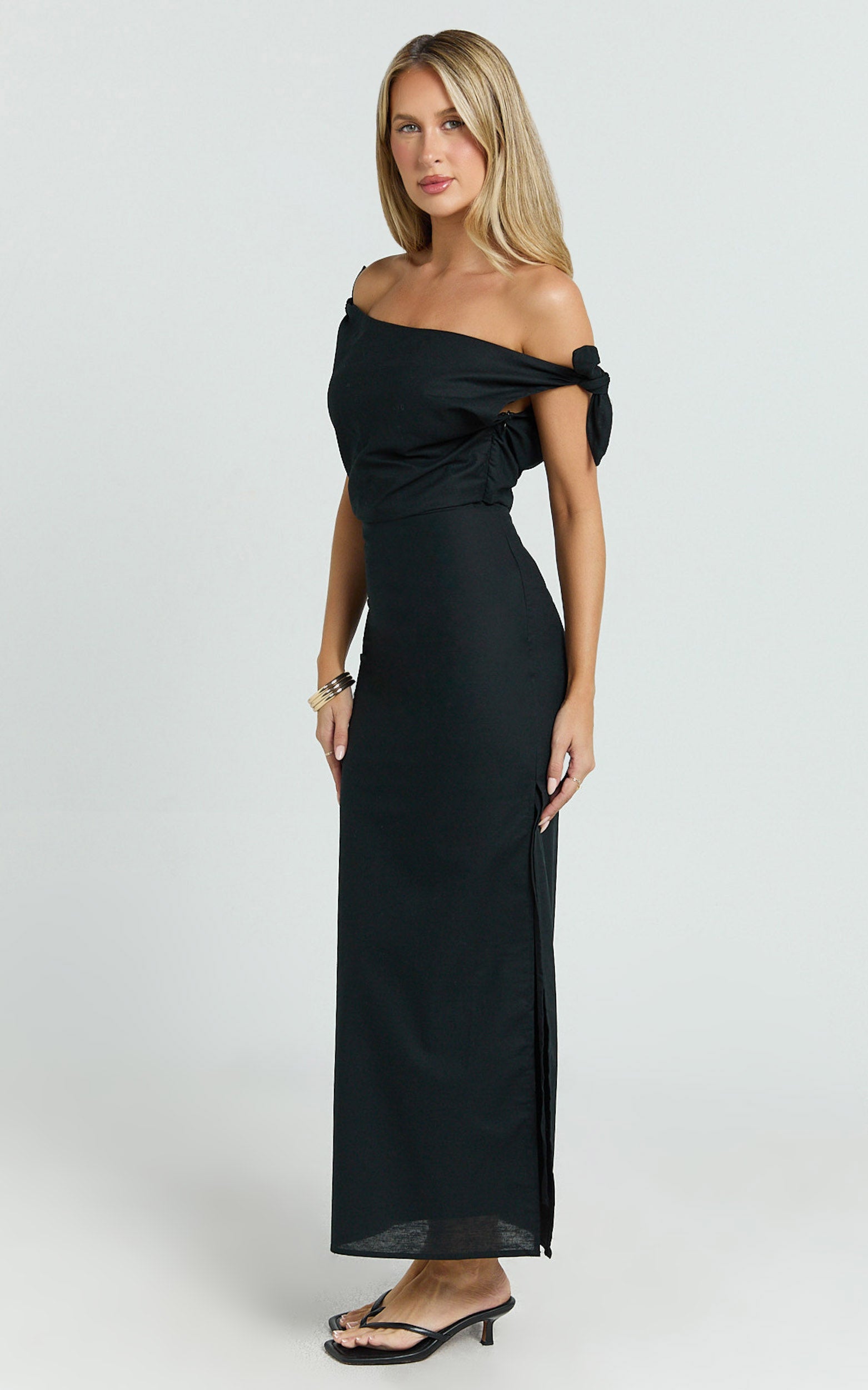 Made from sleek black linen, this off-the-shoulder style features an elegant column silhouette and a chic side split, perfectly blending minimalist charm with runway-ready glam. Dress it up for a standout evening look with bold accessories and strappy heels, or keep it casual and street-style approved by layering it under an oversized vintage denim jacket and fresh sneakers.