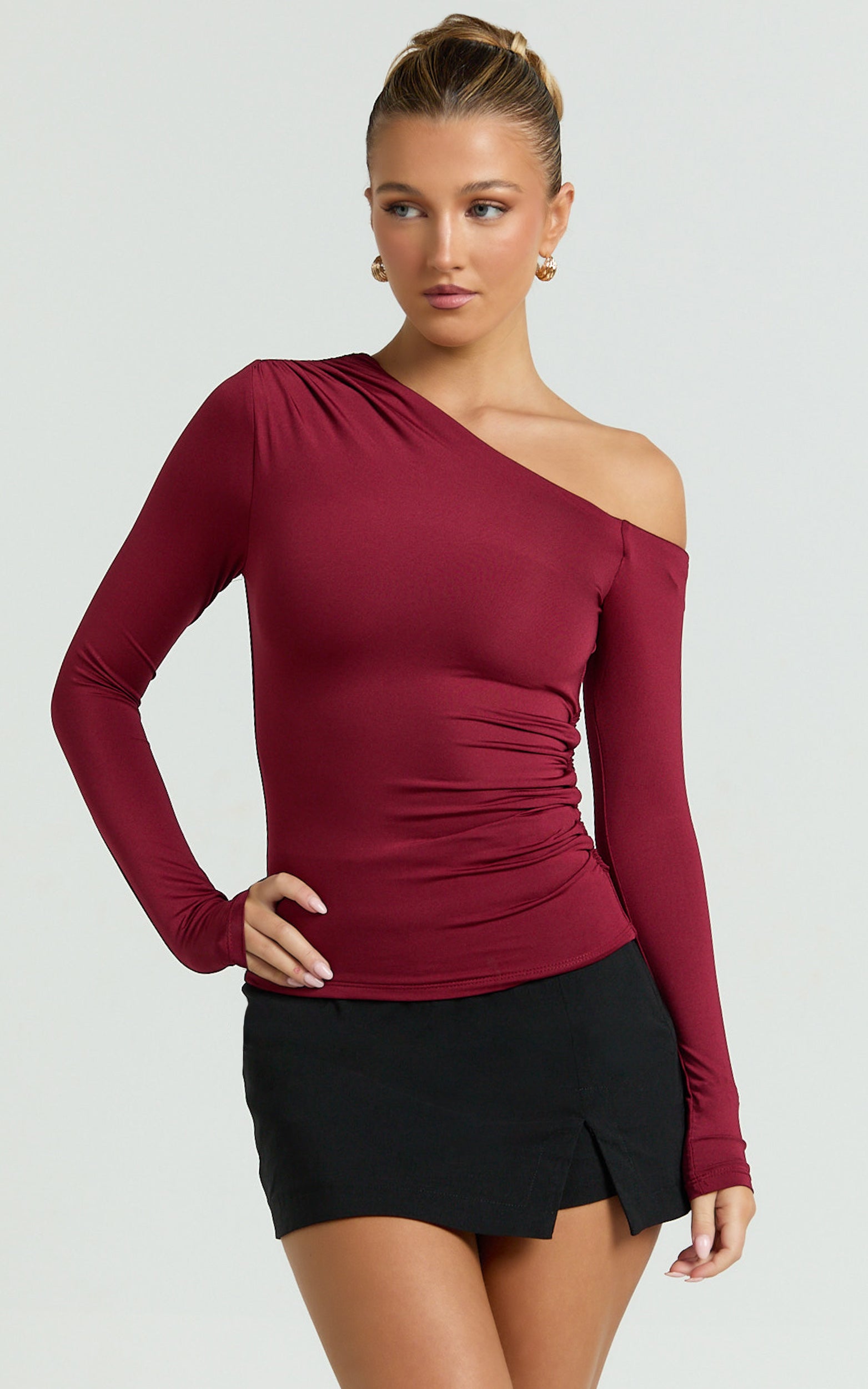 Clarence Top brings curve-loving ruching and a sleek, fitted silhouette for instant glam. Style it with high-waist denim or a sleek midi to play up the neckline, then finish with strappy heels and a mini bag for a scene-stealing look. Perfect for date nights, rooftop bars, and every RSVP where a little wine hue wins.