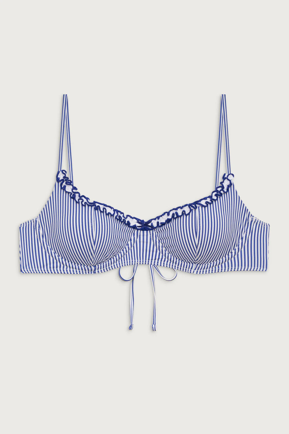 The Cola bikini top is designed to give you the lift you're looking for with adjustable shoulder straps and underwire support. This iteration of Cola features nautical stripes, ruffle trim, and a dainty bow detail. Pair the Cola balconette bikini top with the matching Sofia bikini bottom as your boldest summer set.