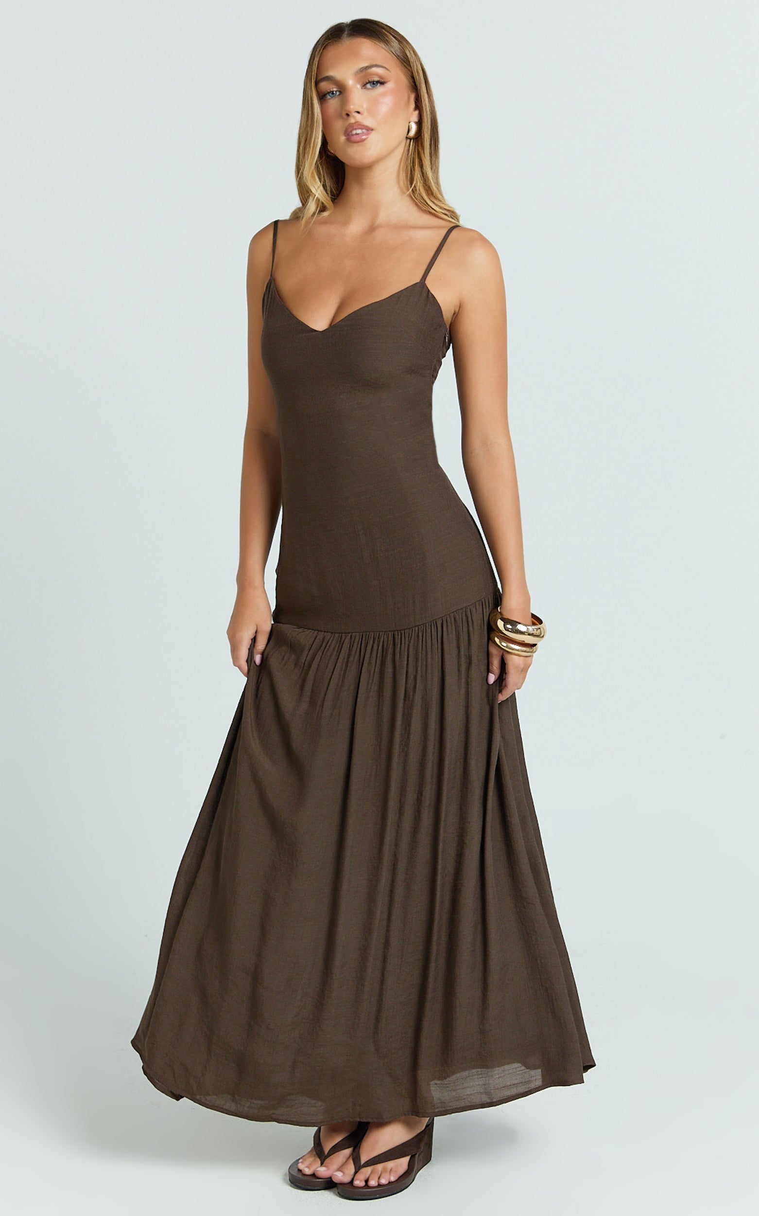 The Collins Maxi Dress in Chocolate is pure understated glamour - fluid, flattering, and made to move. The deep-chocolate tone feels luxe, while the swishy gathered skirt and relaxed dropped waist create a silhouette that elongates and flows with every step. Effortless from day to drinks, it’s your go-to for event dressing that always looks polished. With its soft lines and romantic plunge neckline, this maxi brings runway energy to real life. Style it with necklaces for that balletcore-inspired finish, or switch to strappy heels for an elevated evening vibe. Prefer it casual? Pair with ballet flats and a mini bag for easy polish. A timeless brown dress you’ll reach for on repeat.
