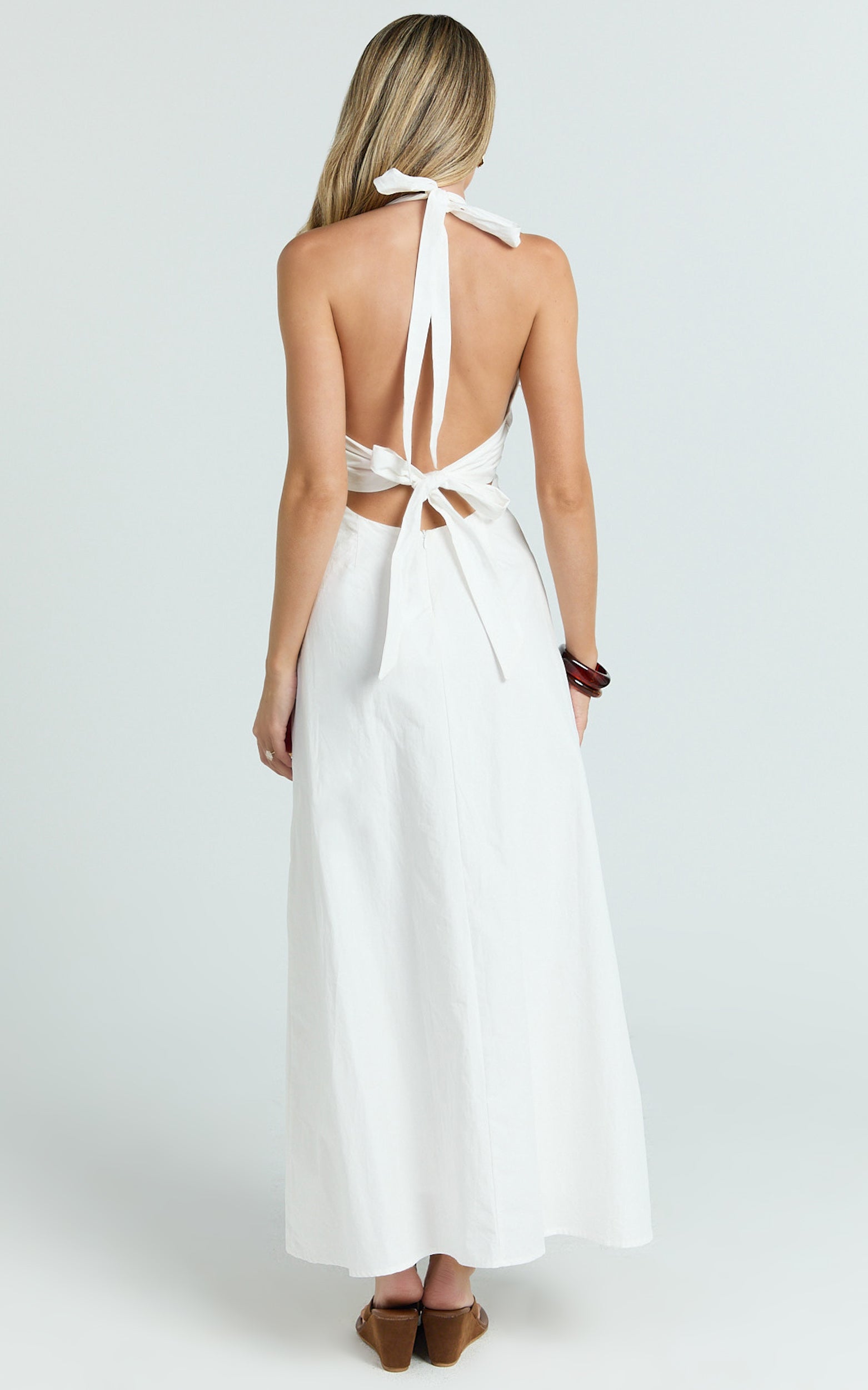 The Connor Maxi Dress in White is effortless elegance in motion. The halter neckline shows off your shoulders, the open back brings just the right amount of flirt, and the soft, flowy silhouette skims the body without clinging. It’s the perfect white maxi for beach weddings, long lunches, and sunset dates - simple, striking, and so easy to wear. Keep the styling clean with layered pendants and slicked-back hair, or lean into coastal energy with woven accessories and minimal sandals. For nights out, switch to strappy heels and gold hoops and let that open back do the talking. Fresh, modern and endlessly versatile, Connor is the white dress you’ll keep coming back to.