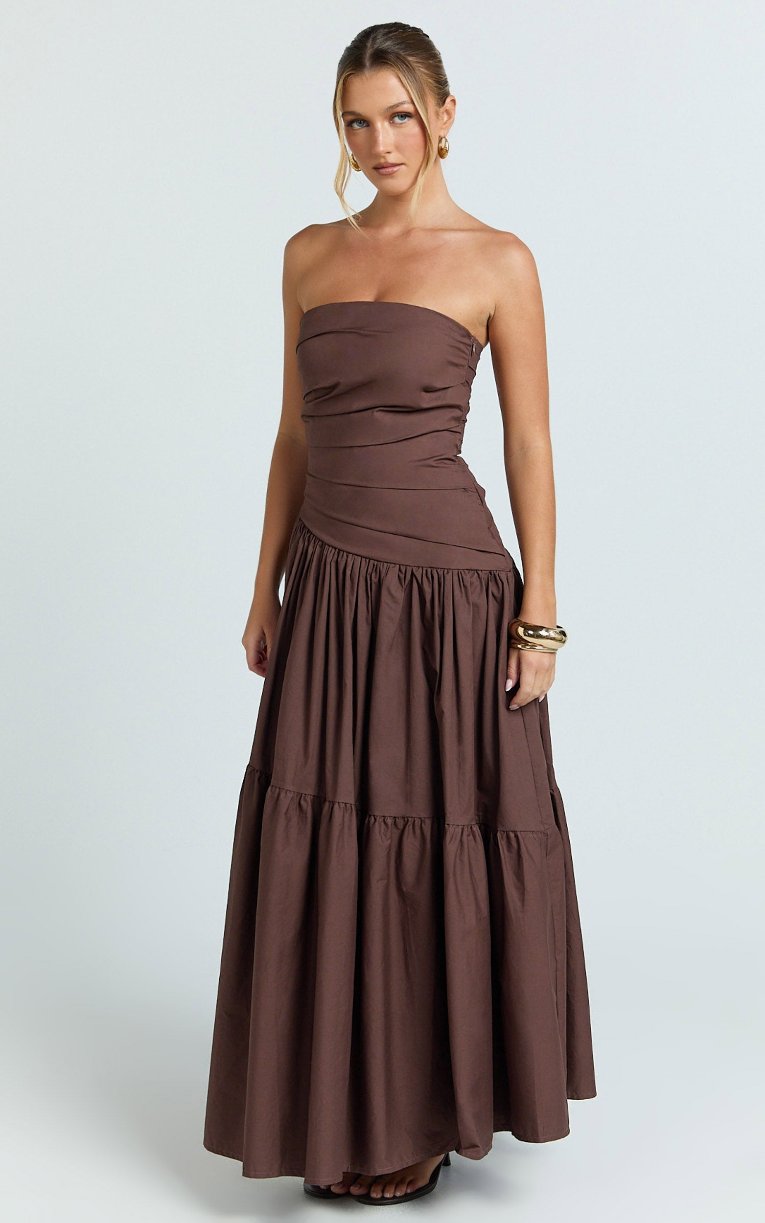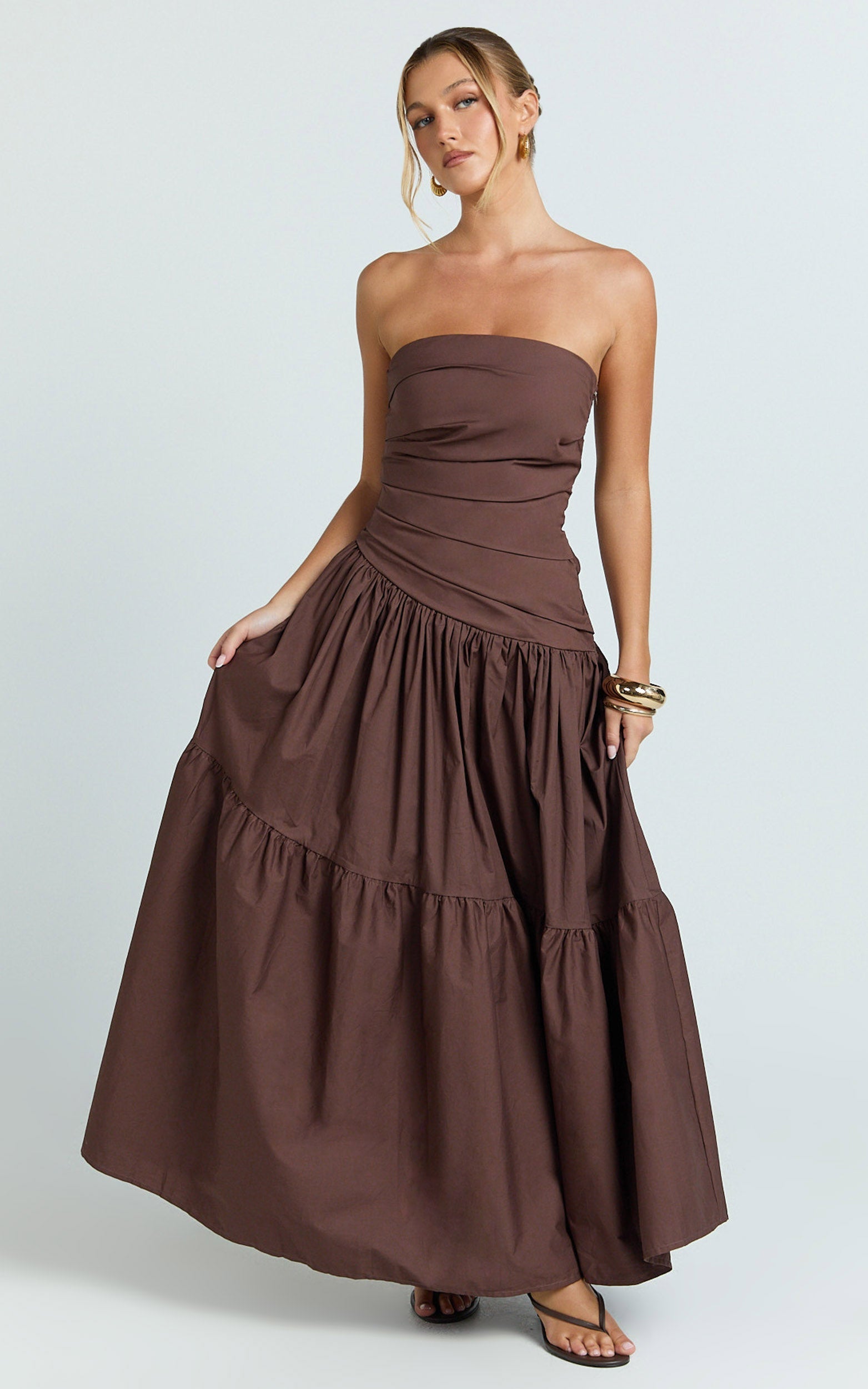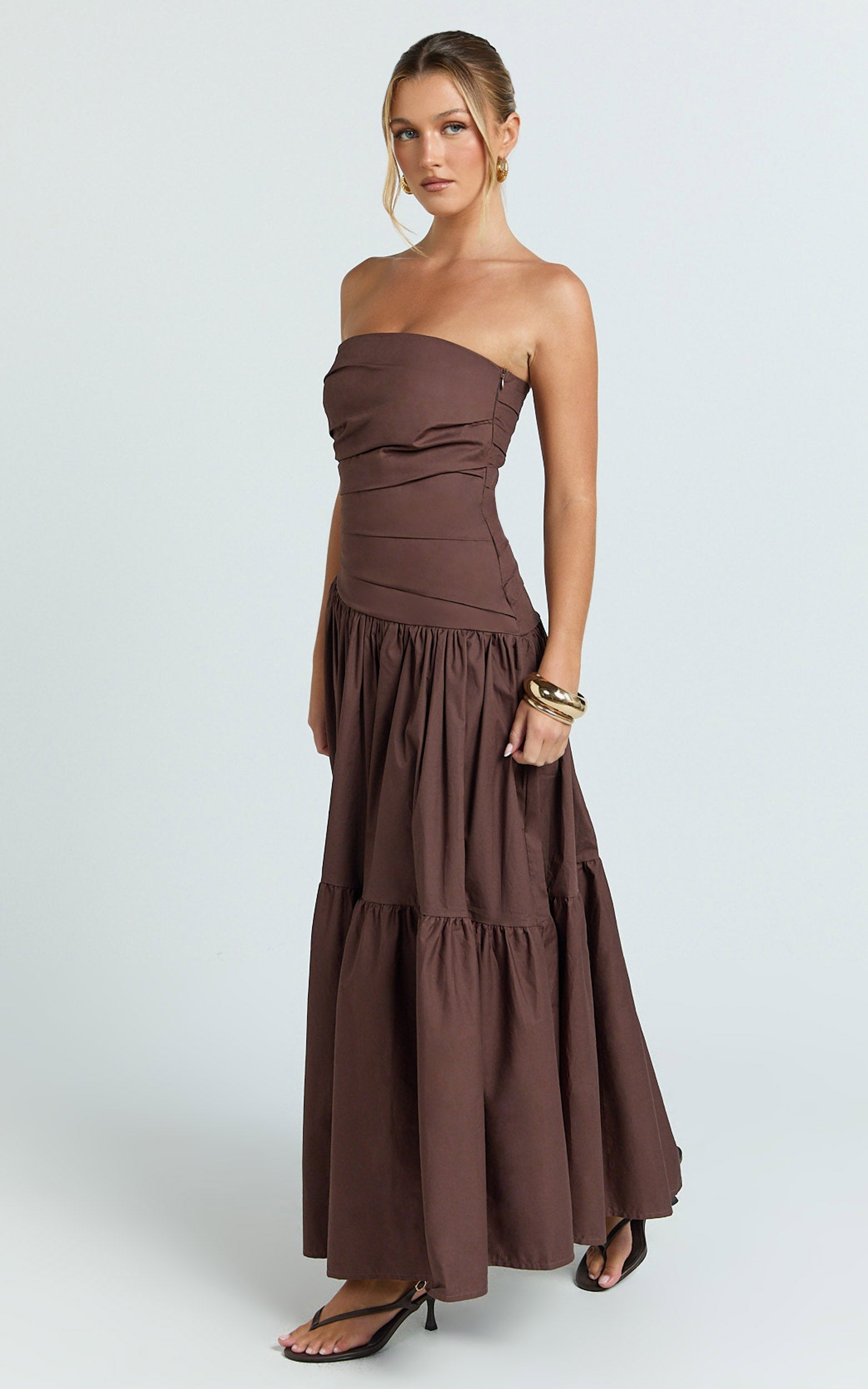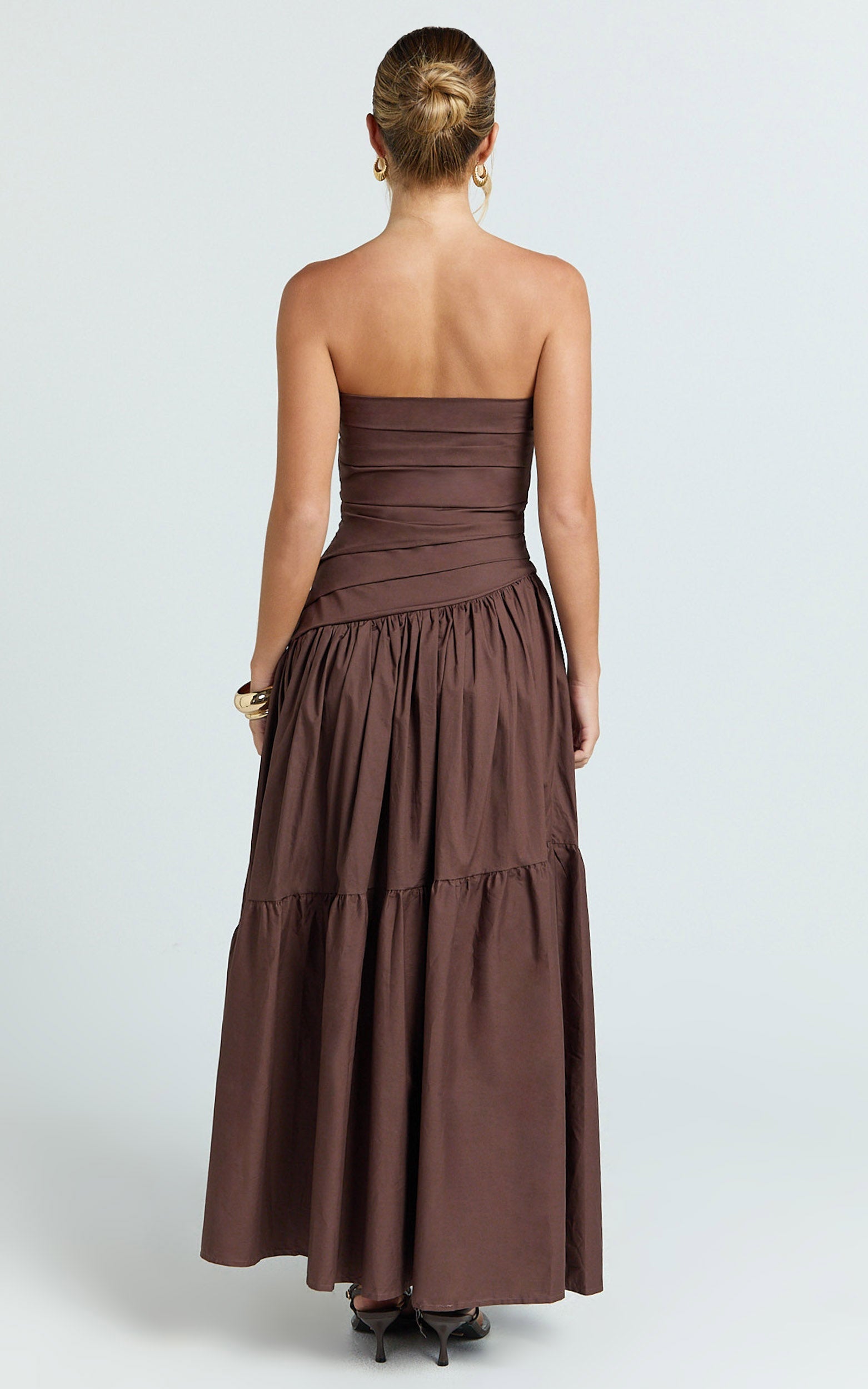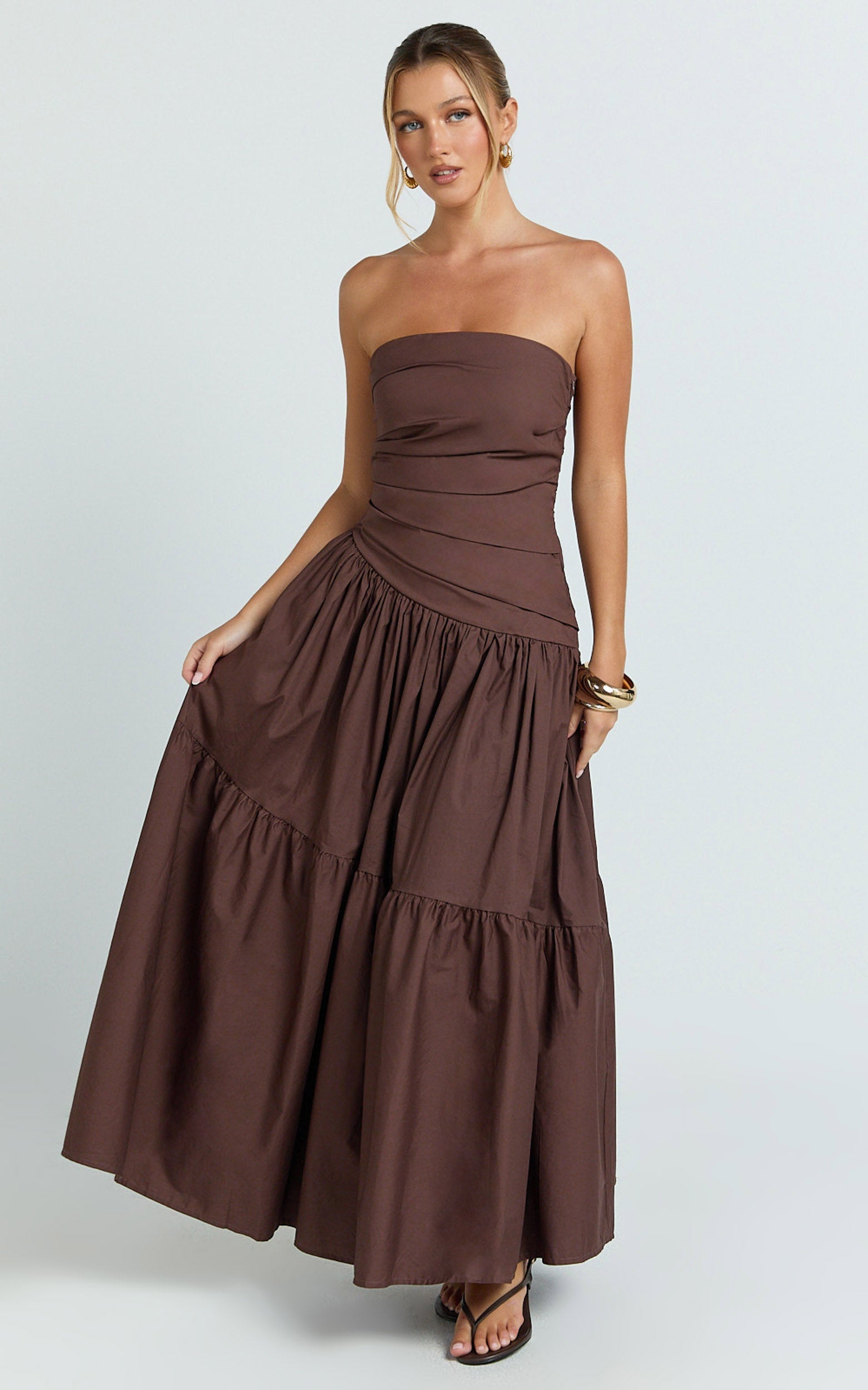 The Cora Midi Dress in Chocolate brings a curve-skimming silhouette that hugs in all the right places, dipping into a clean strapless neckline before flowing to a polished midi hem. Rich chocolate tones add that luxe feel, making it an easy yes for date nights, long lunches, and after-dark moments. Minimal yet striking, it’s the kind of dress that reads effortlessly expensive. Style Cora with gold hoops and strappy heels for an elevated evening, or lean into a relaxed vibe with simple slides and a sleek shoulder bag. Add a bold lip or glossy glow to keep things modern. Timeless, flattering, and endlessly wearable, this is the chocolate-toned staple you’ll reach for again and again.