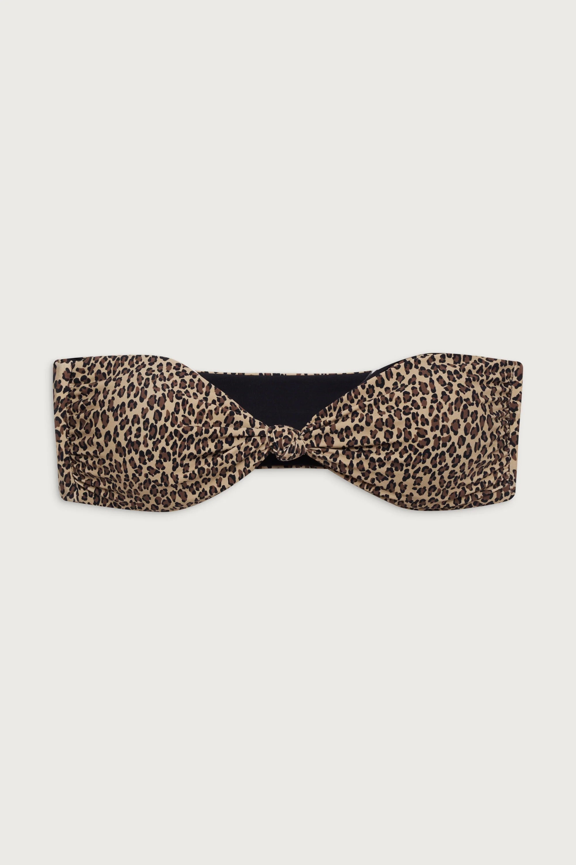 If you're looking for a bikini top that will ensure minimal tan lines, this bandeau is for you. The Crescent bikini top features a knotted front design and a new animal print, Baby Leopard. Complete the set with the matching Enzo bikini bottom.