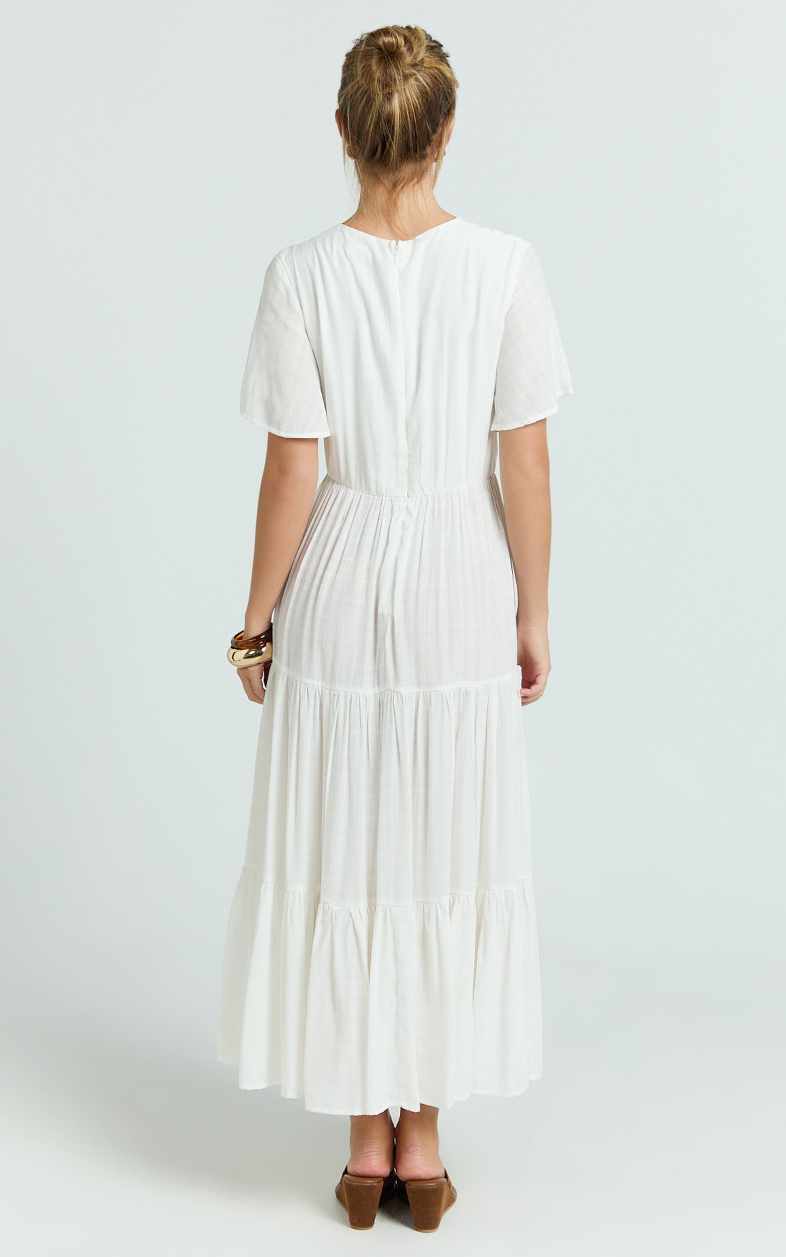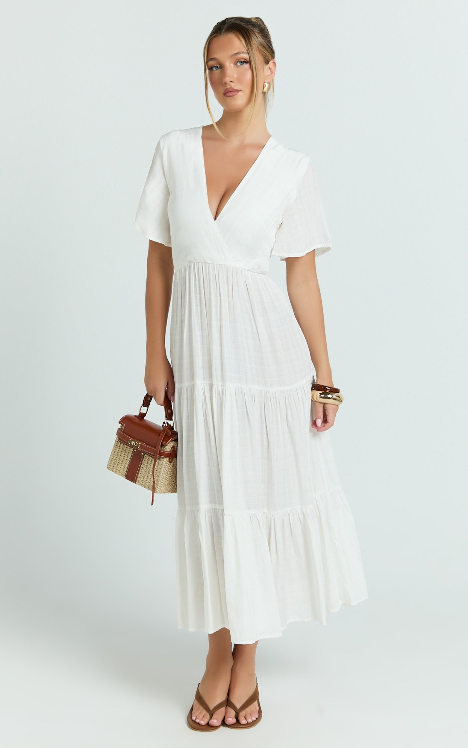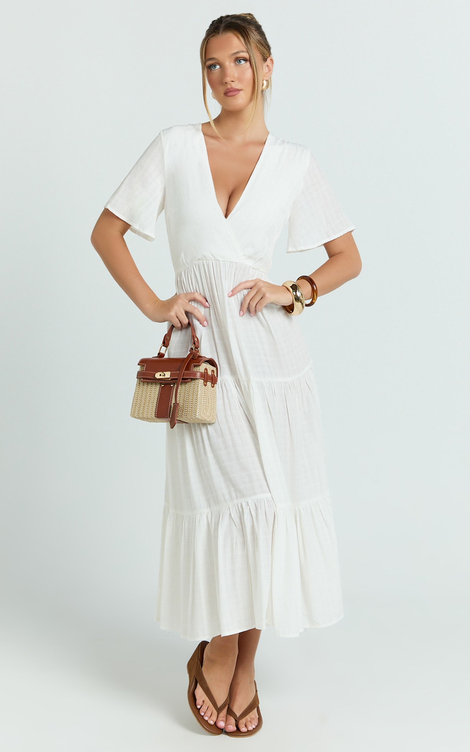 The Cryzel Midi Dress in White brings effortless romance with flutter sleeves and a tiered skirt that swishes as you move, keeping things fresh, flowy, and photogenic. A dreamy silhouette made for weekends, events, and sunny escapes. The Cryzel Midi Dress flatters with a waist-accentuating shape and twirl-ready tiers that feel easy yet elevated. Style with pendant necklaces and oversized sunglasses for a chic day look, then swap in a raffia bag and flip-flops for vacation energy. A sweet, versatile white midi you’ll reach for again and again, always ready for compliments.