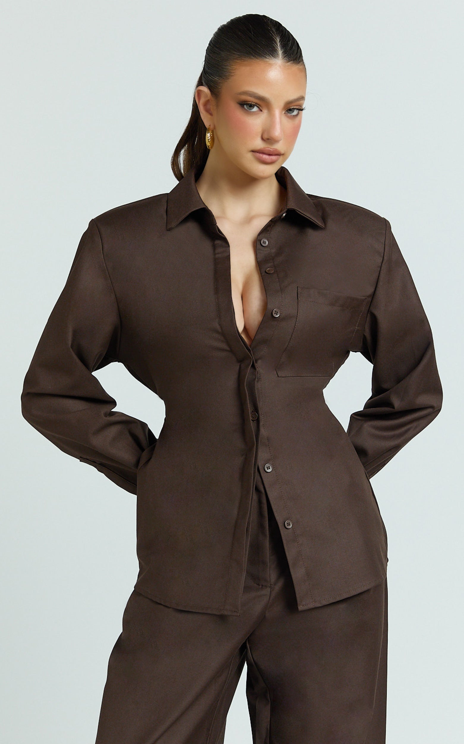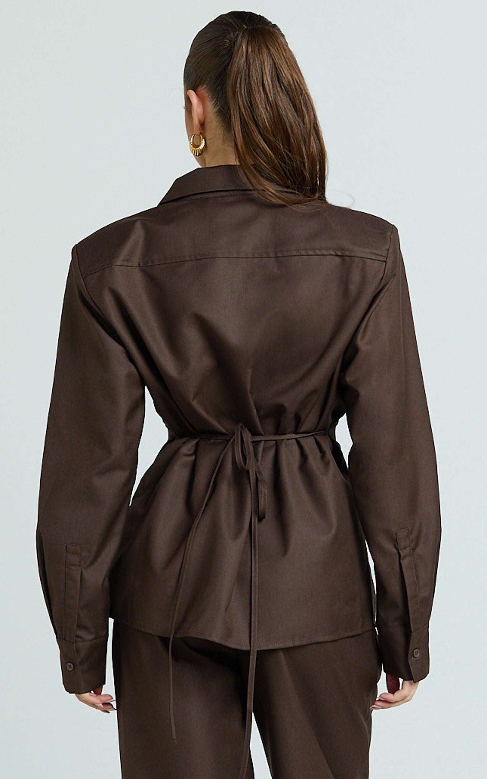 Strong shoulders meet a clean button front for that sharp “I’ve-arrived” energy, while the waist tie sculpts and flatters. Think office-to-out cocktails, styled with tailored trousers or a sleek mini from our Tops edit to balance the structure.