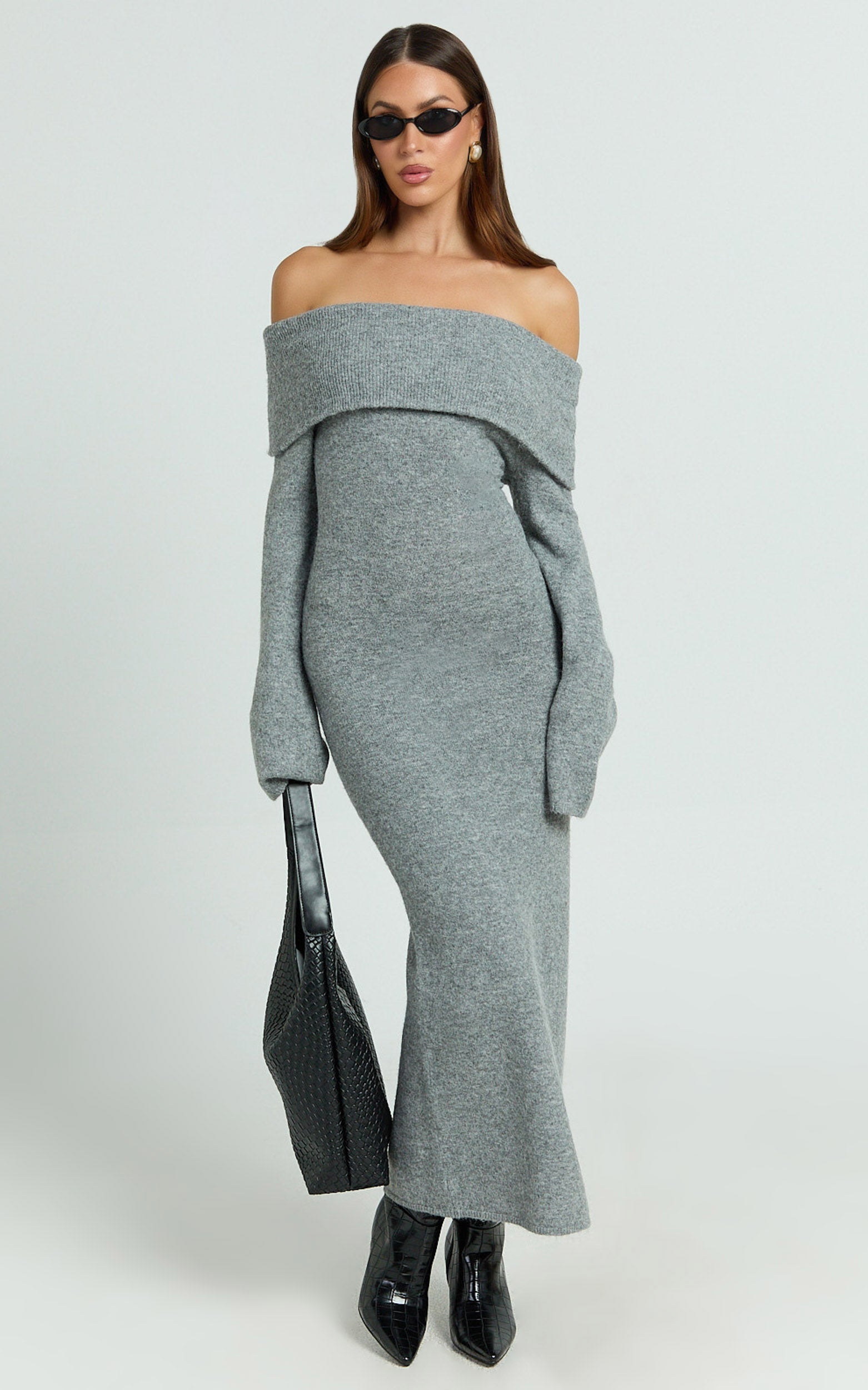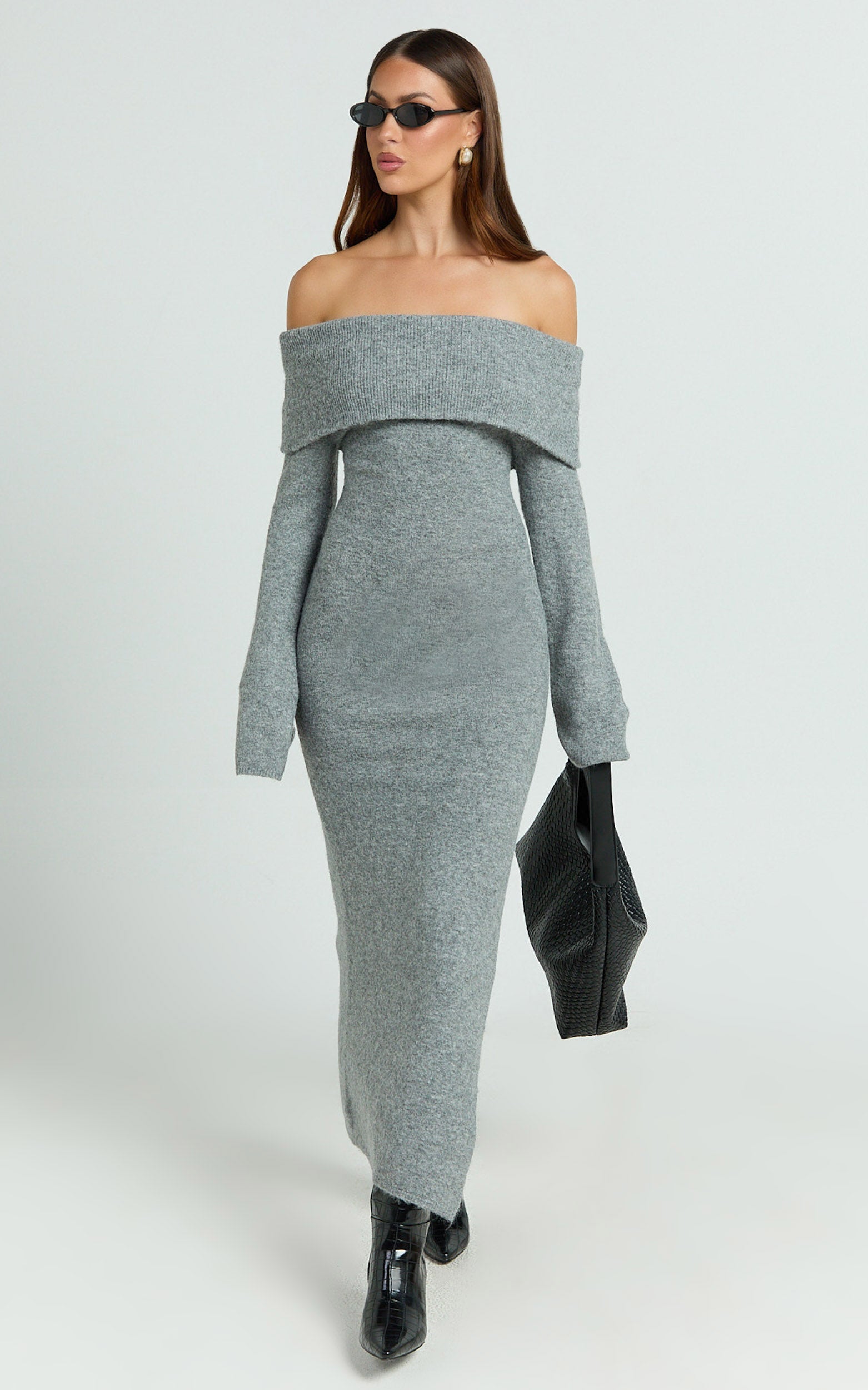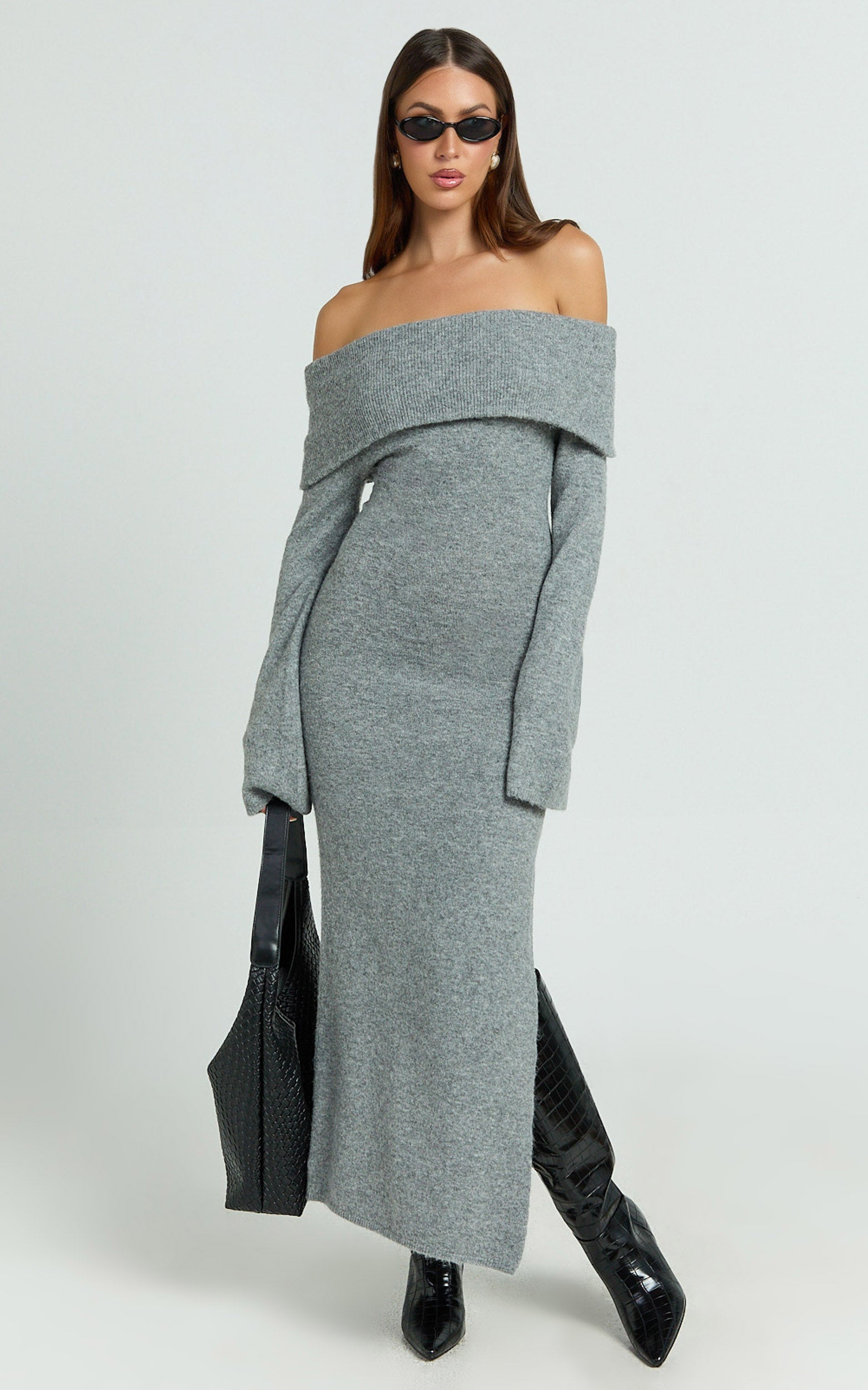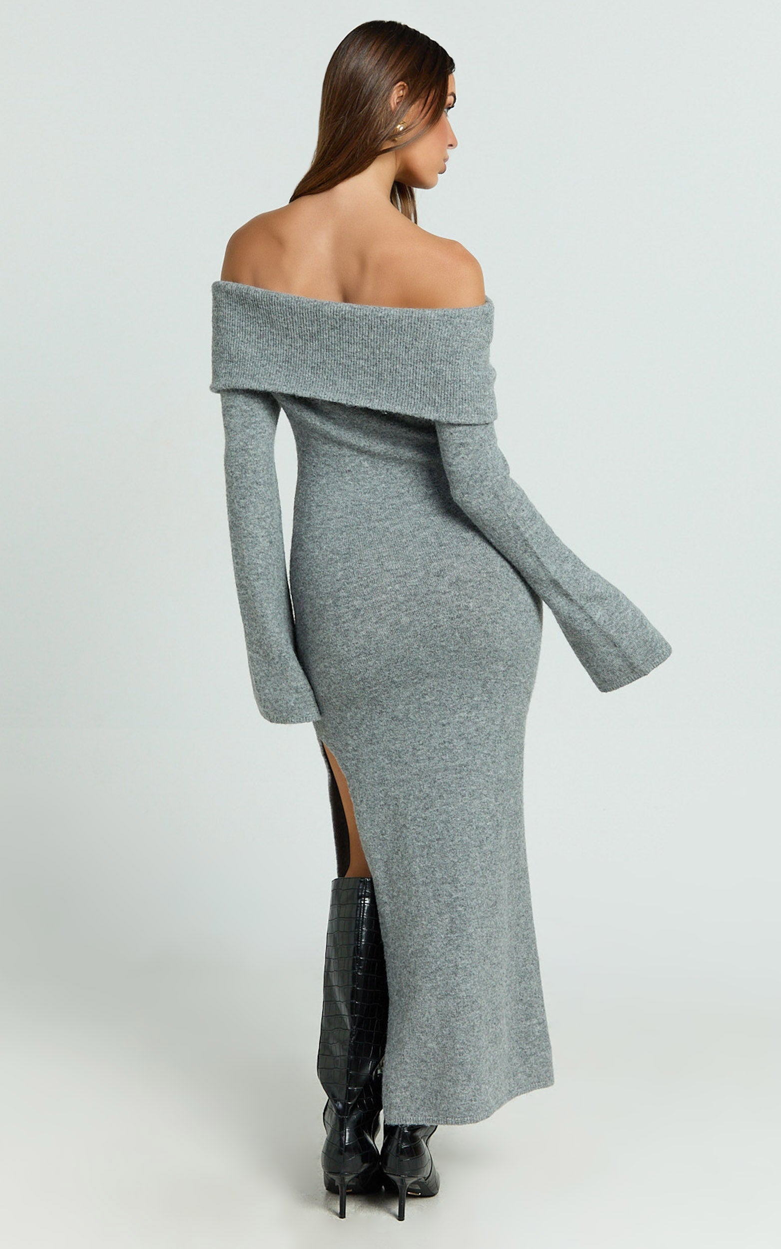 Transform your look with the Darcie Midi Dress - Off Shoulder Knitted Long Sleeve Dress in Grey Marle. Designed for every body and every moment, this versatile knit dress is made with fully fashioned knit using recycled polyester—so you can look good while doing good. The flattering off-the-shoulder neckline shows just enough skin, perfect for making a statement at your next party day or brunch with the girls.