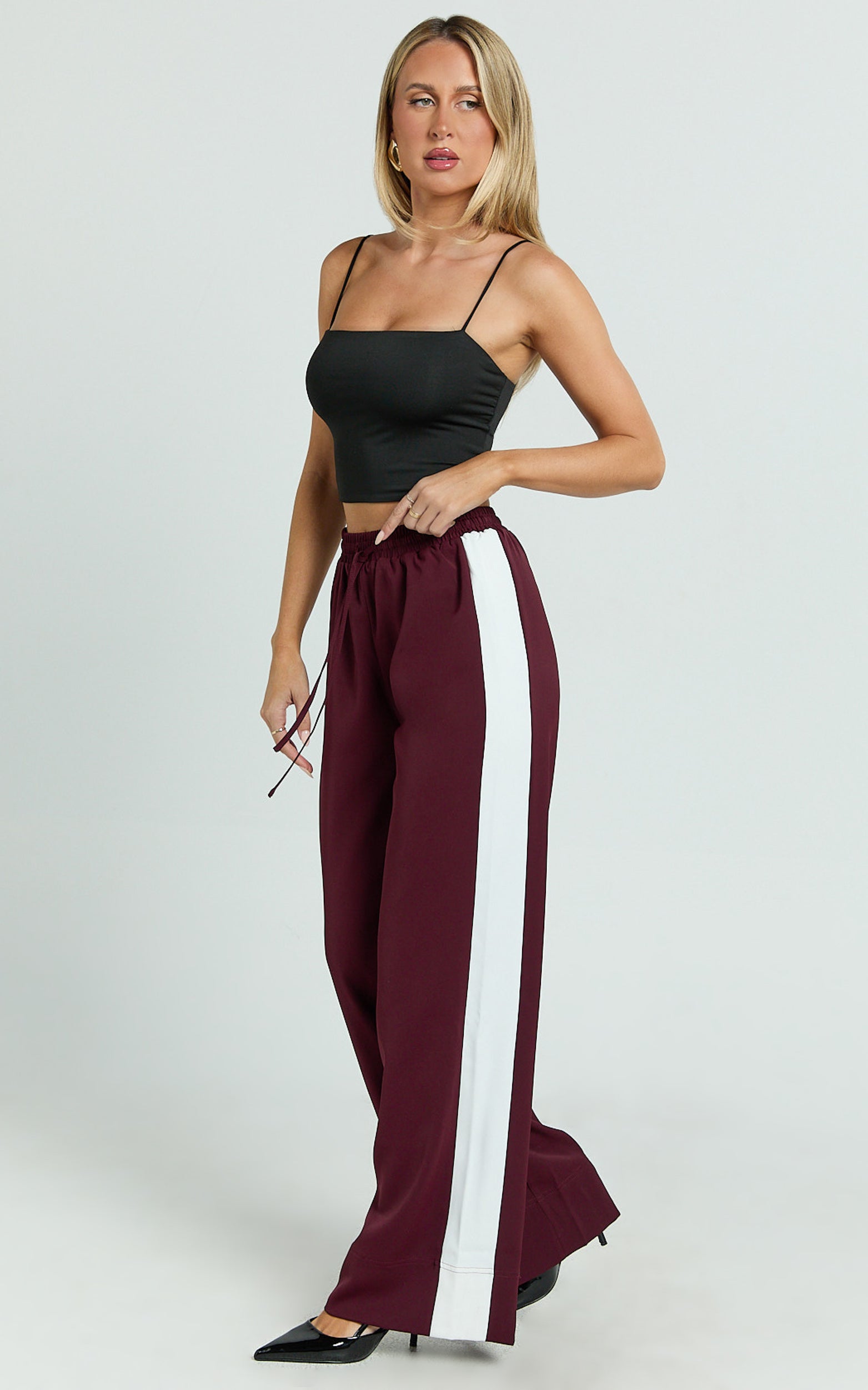 These burgundy pants blend tailored sophistication with an Athleisure vibe, featuring a flattering drawstring waist and contrast panel detailing that contours your silhouette to perfection. Embracing the Y2K Revival trend, their relaxed yet structured fit delivers instant it-girl appeal.