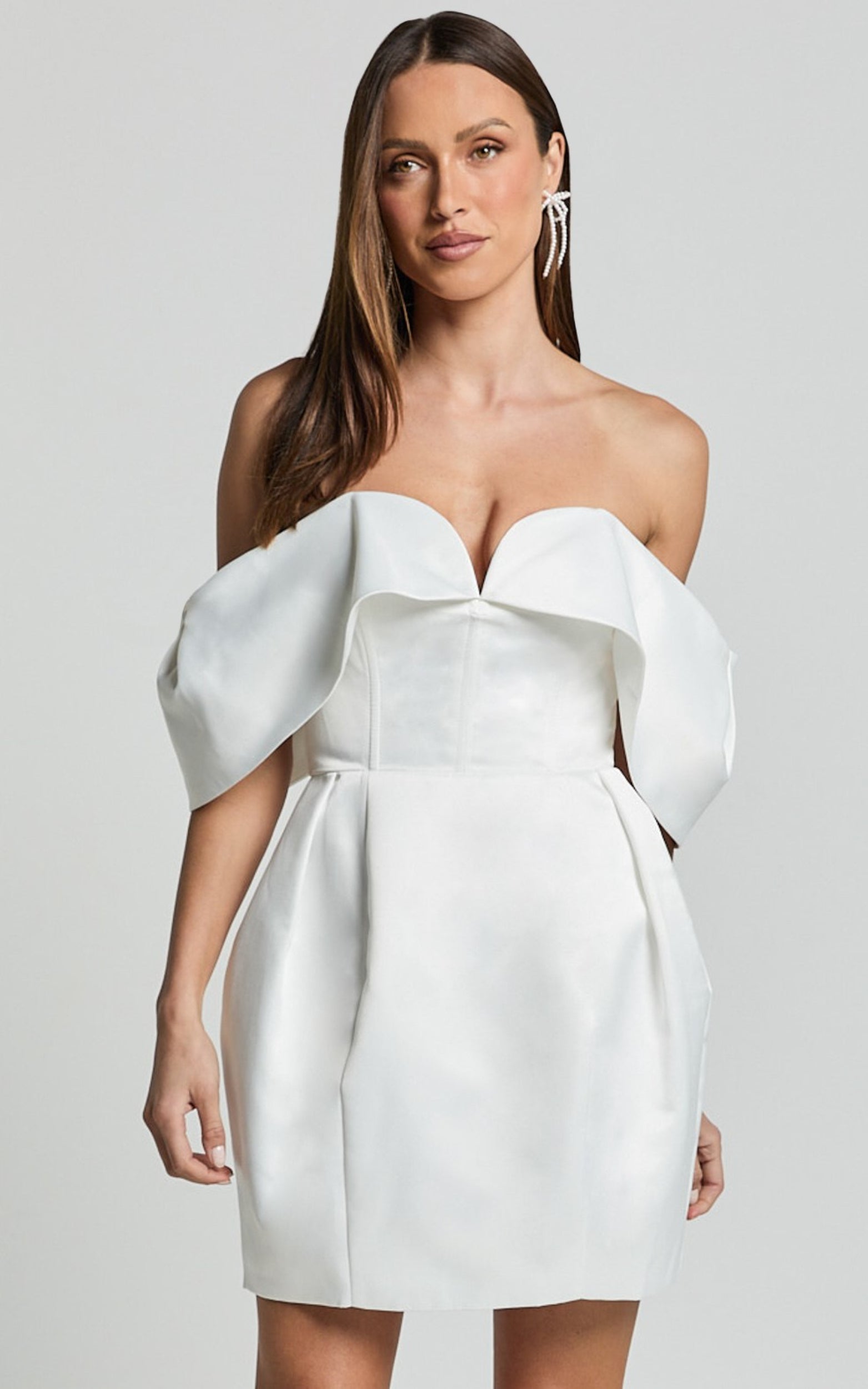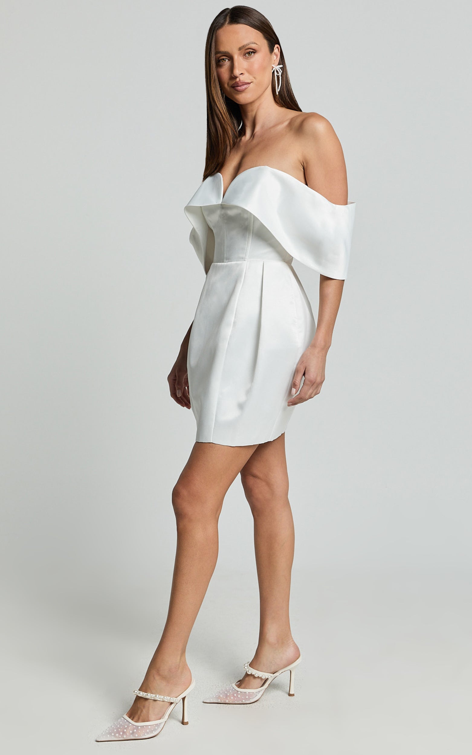Make a statement in the Demelza Mini Dress – your next unforgettable look for any formal occasion. Crafted with a sophisticated V bar off-shoulder neckline, this strapless satin sensation merges timeless elegance with a dash of daring. Rendered in a luxurious ivory, the dress dances between the daring and the demure, making it the perfect pick for those who don't just walk into a room, but own it.