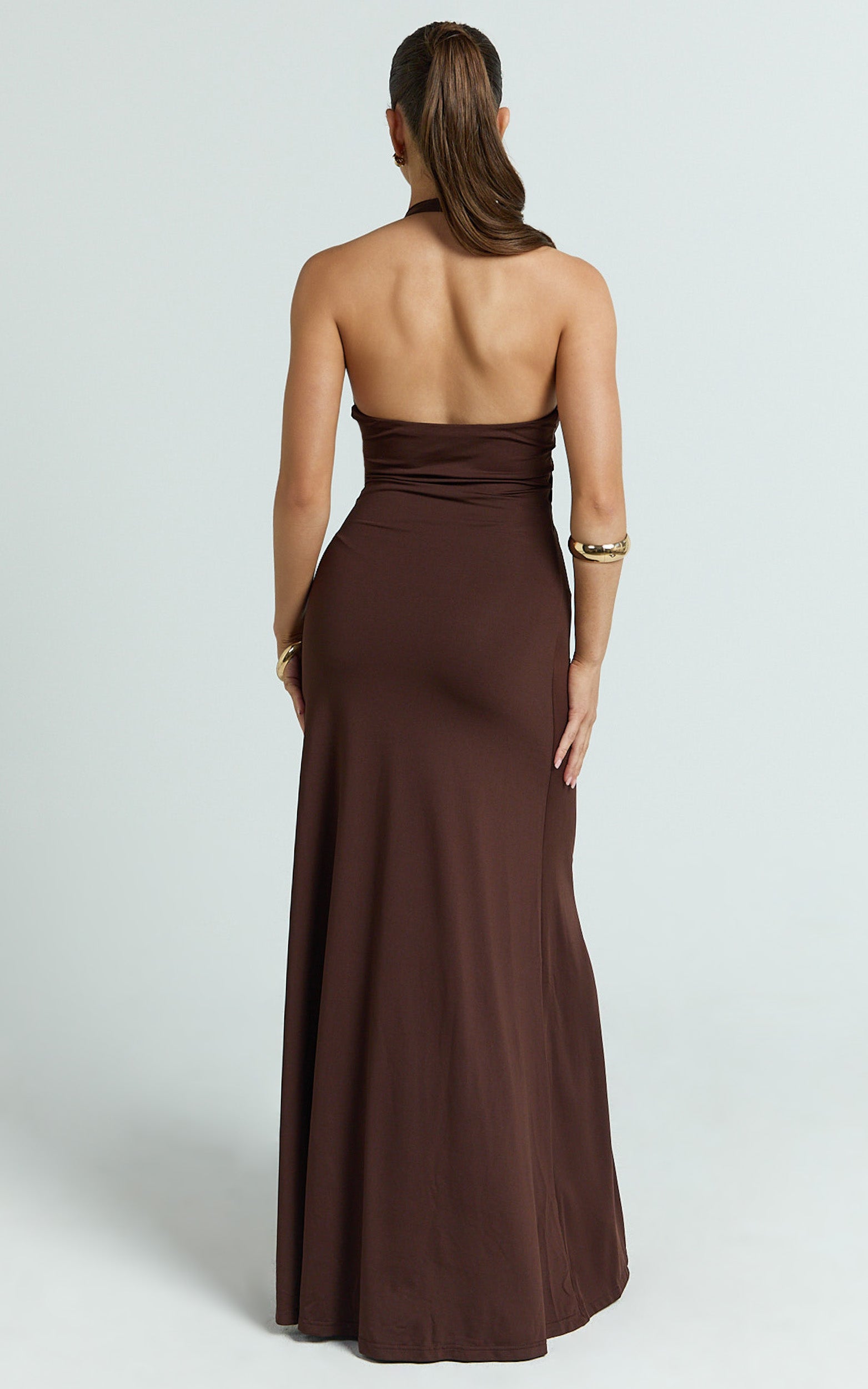 Denise Maxi Dress brings the heat to your Dresses lineup, flattering from every angle with a halter tie and streamlined ruching that sculpts without feeling restricted. Style it with Metallic Sunglasses and a delicate Bracelet Bags moment for that polished edge, or lean into Two-Tone Shoes for contrast that pops against the warm brown. A go-to for parties, wedding guests, and any RSVP that calls for effortless glamour.