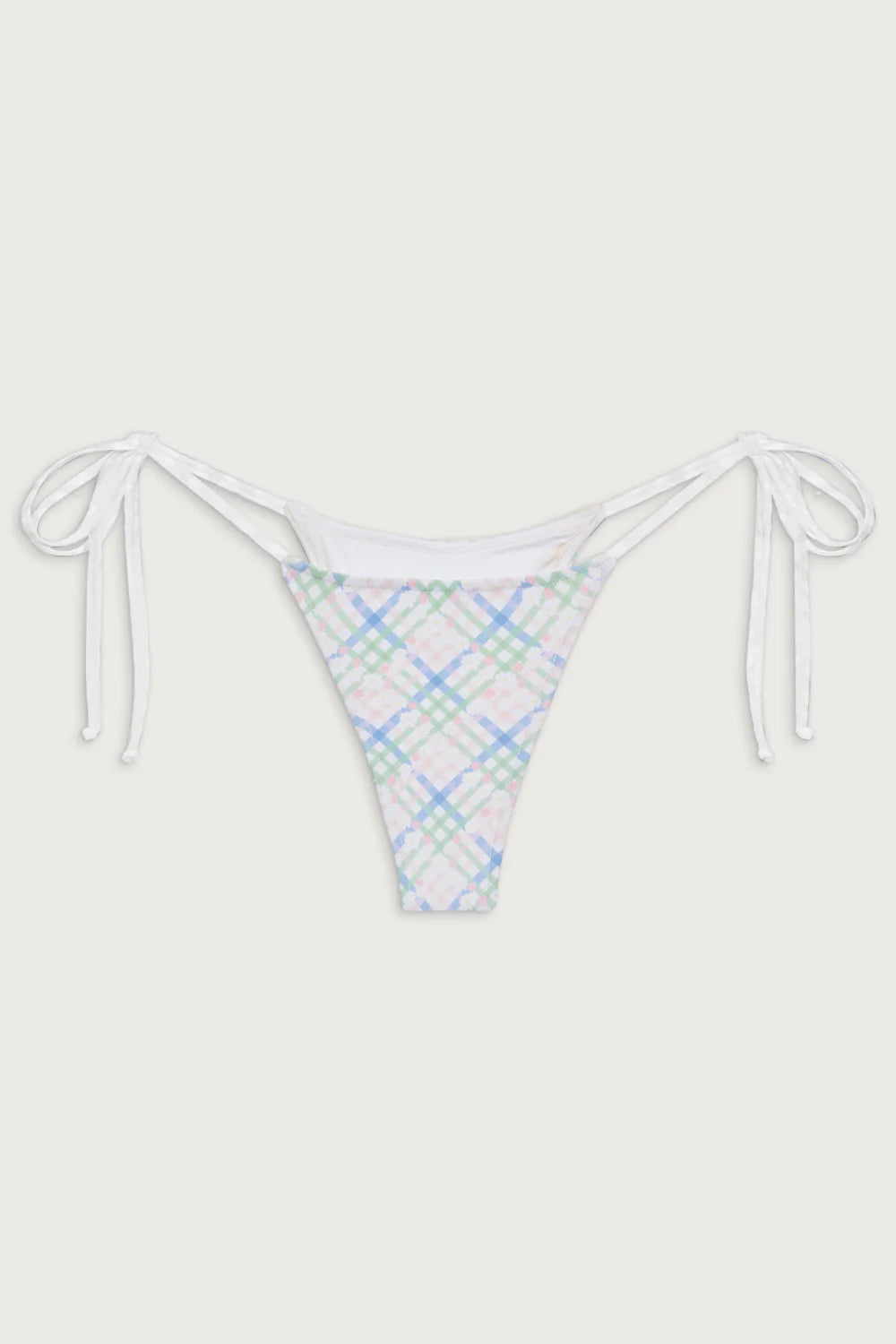 Designed with a low-rise fit and skimpy coverage, the Divine bikini bottom is an ultra-flattering beachside silhouette. Divine features adjustable side ties and an eye-catching pastel plaid print with tiny white flowers.
