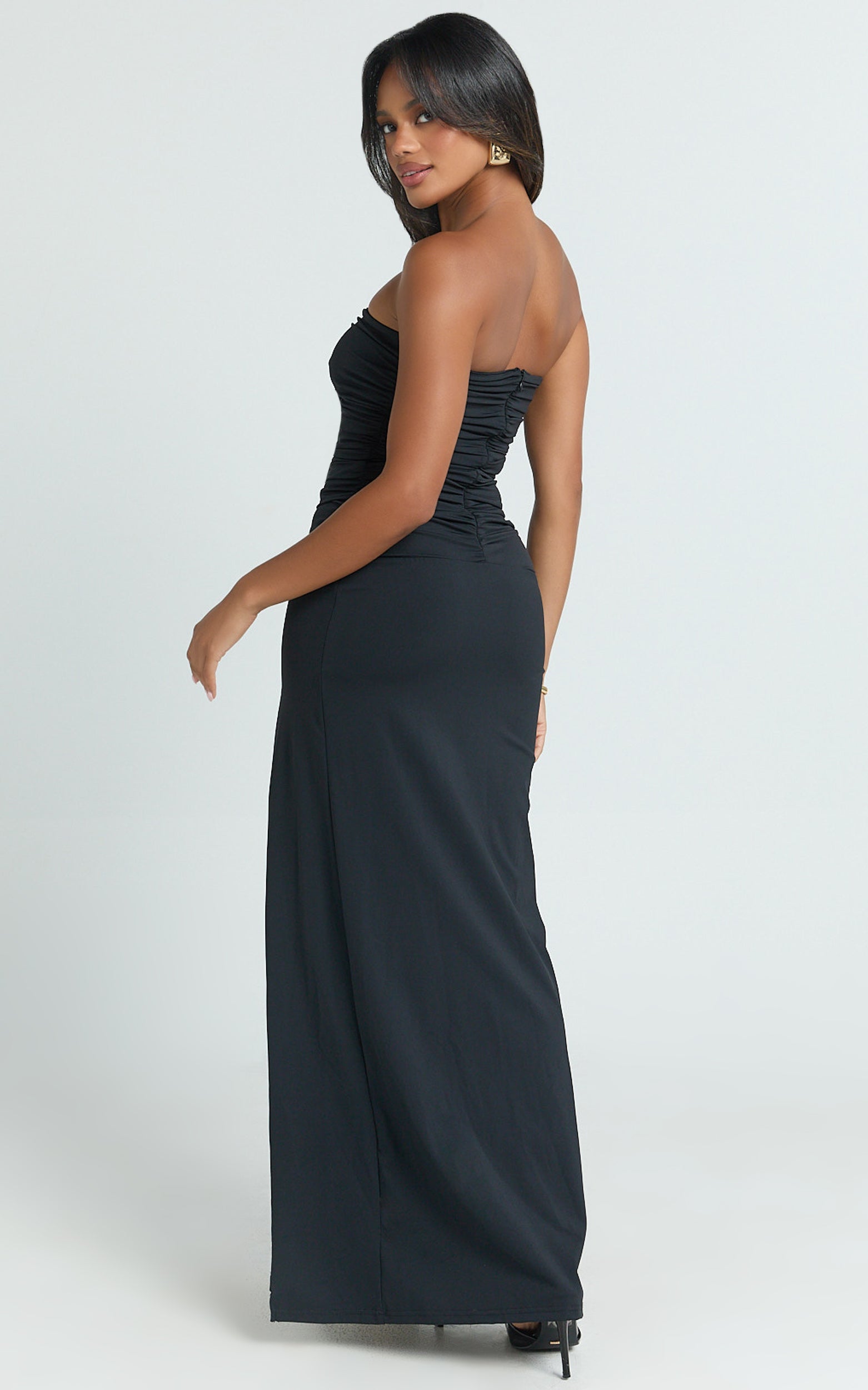 This strapless sweetheart bodycon serves curve-hugging confidence with sleek ruching and a floor-sweeping maxi length in deep black, your instant Statement outfit for parties, events, and every RSVP. Quiet luxury vibes meet sultry detailing, giving you that sculpted silhouette and a clean, minimal finish that lets you shine.