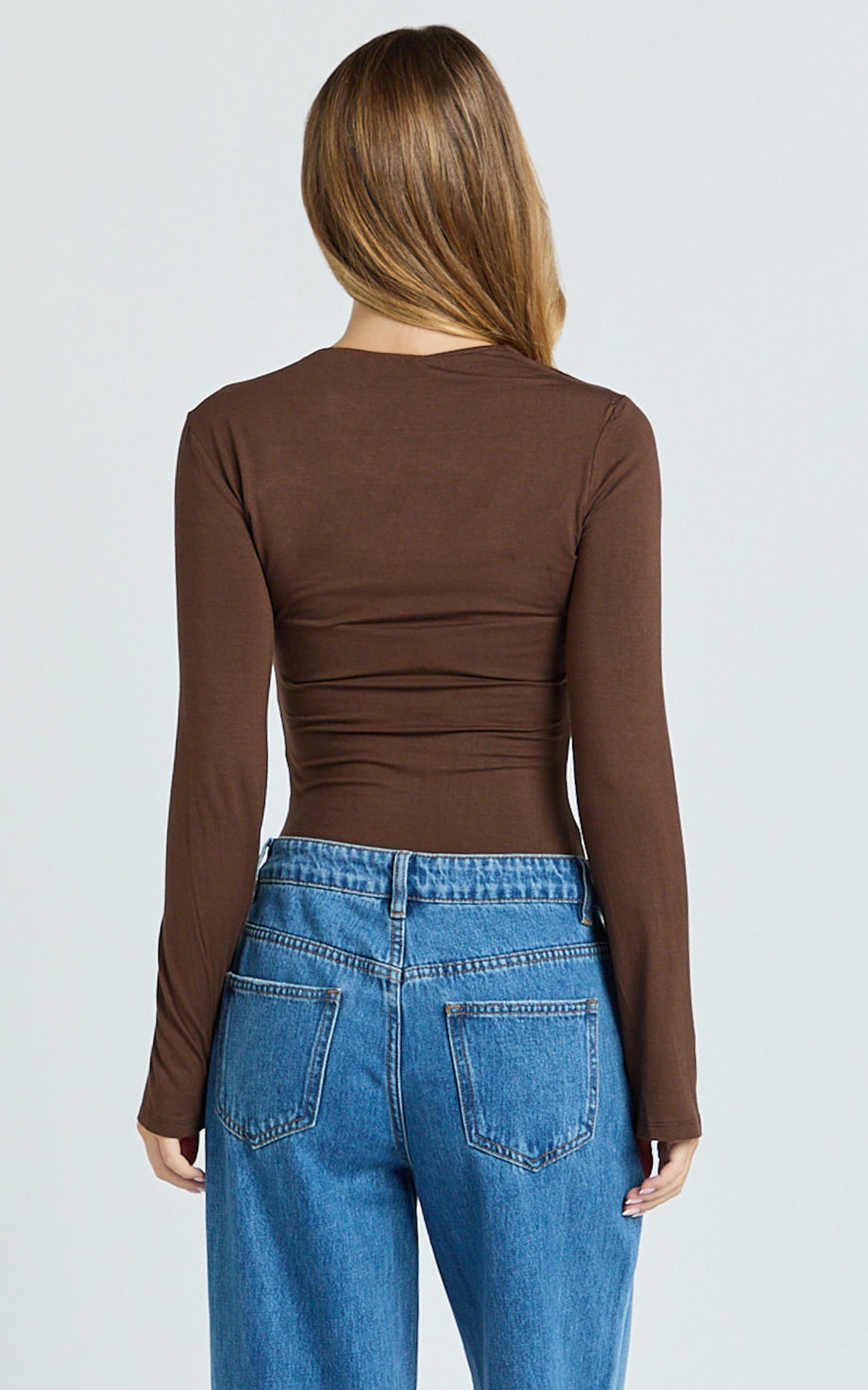 The twist-front detail cinches and defines, giving flattering shape while the deep brown hue nails that quietly luxe vibe in capsule wardrobe mood. Sleek, versatile and easy to dress up or down, this brown staple slips seamlessly into day-to-night looks and pairs perfectly with neutral bottoms for a polished finish.