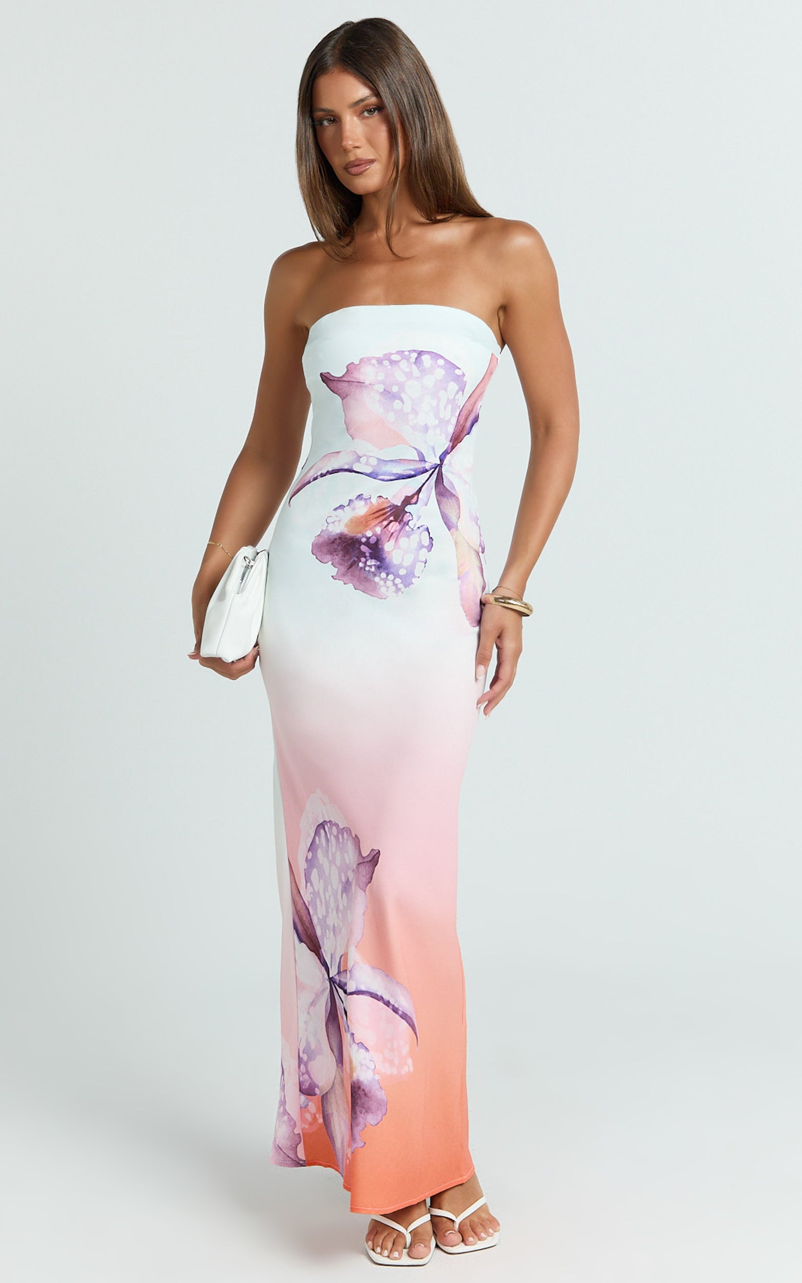 The Elouise Maxi Dress in Orchid Ombre features a sleek, fitted silhouette designed to flatter every curve with a smooth, sculpted finish. The clean strapless neckline frames the décolletage beautifully - perfect for a glowing skin moment or a bold statement necklace. The orchid ombre print steals the show with its flowing, romantic hues, making this maxi ideal for weddings, parties, and summer occasions. Style it with loose curls, strappy heels, silver earrings, and a chic clutch for effortless glam that moves from sunset cocktails to dance-floor moments.