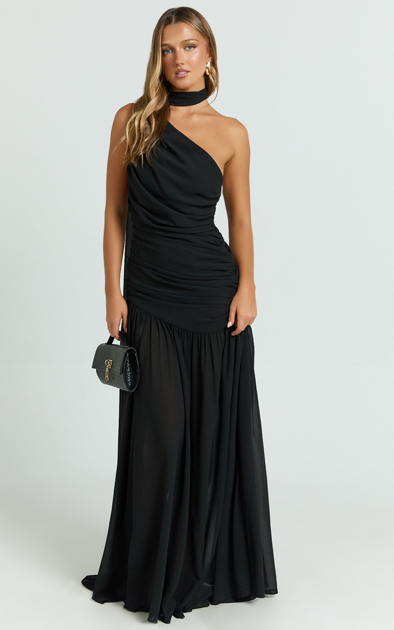 Enya Maxi Dress - One Shoulder Neck Tie Ruched High Split Dress In Black nails that runway-to-real-life vibe, polished, confident and camera-ready. Style it with minimalist sandals for a refined finish, or lean into trending energy with mesh flats for a cool contrast. Add a statement cuff bracelet or a puff heart necklace to tap into the season’s must-have accessories while keeping the look luxe and timeless.