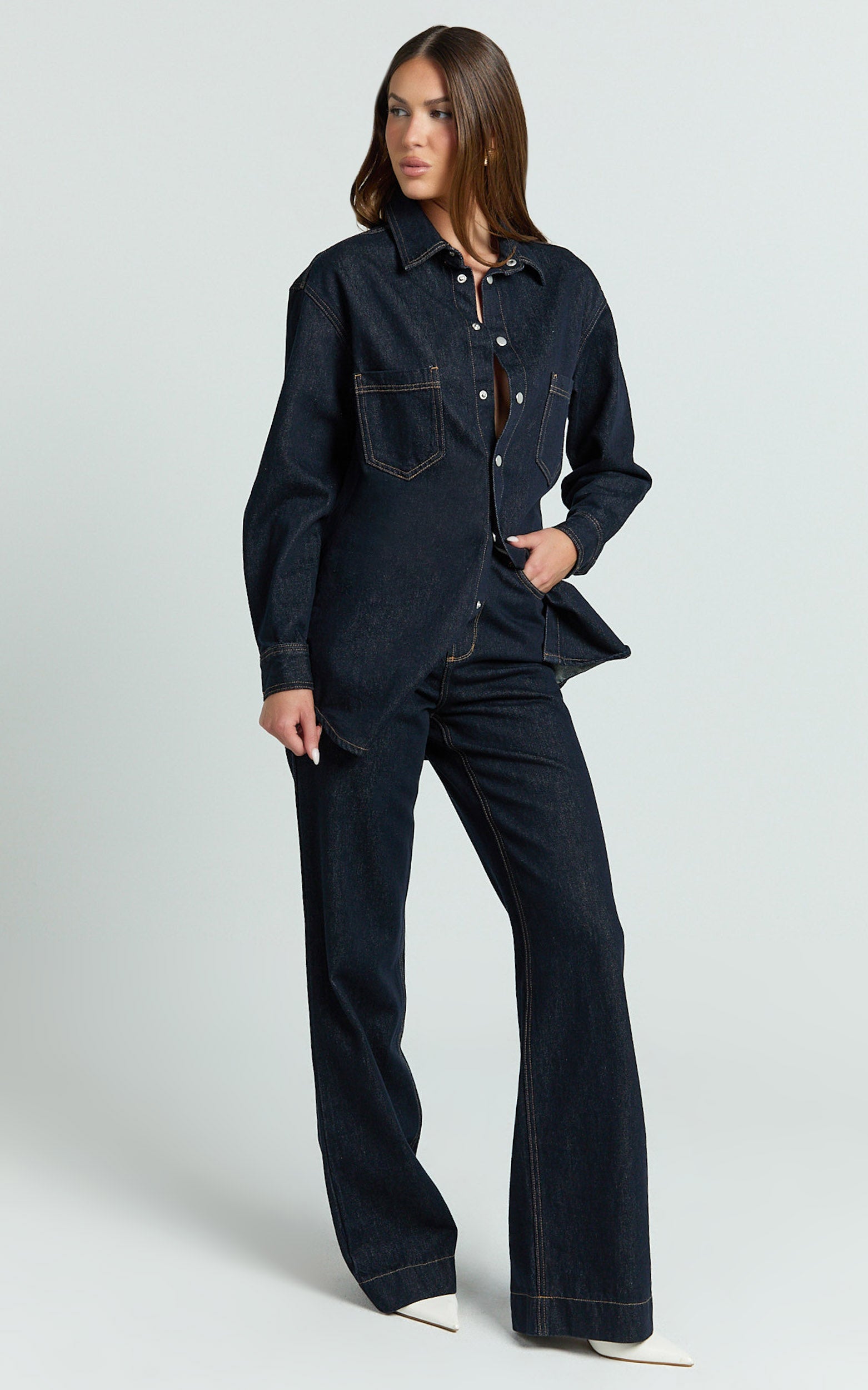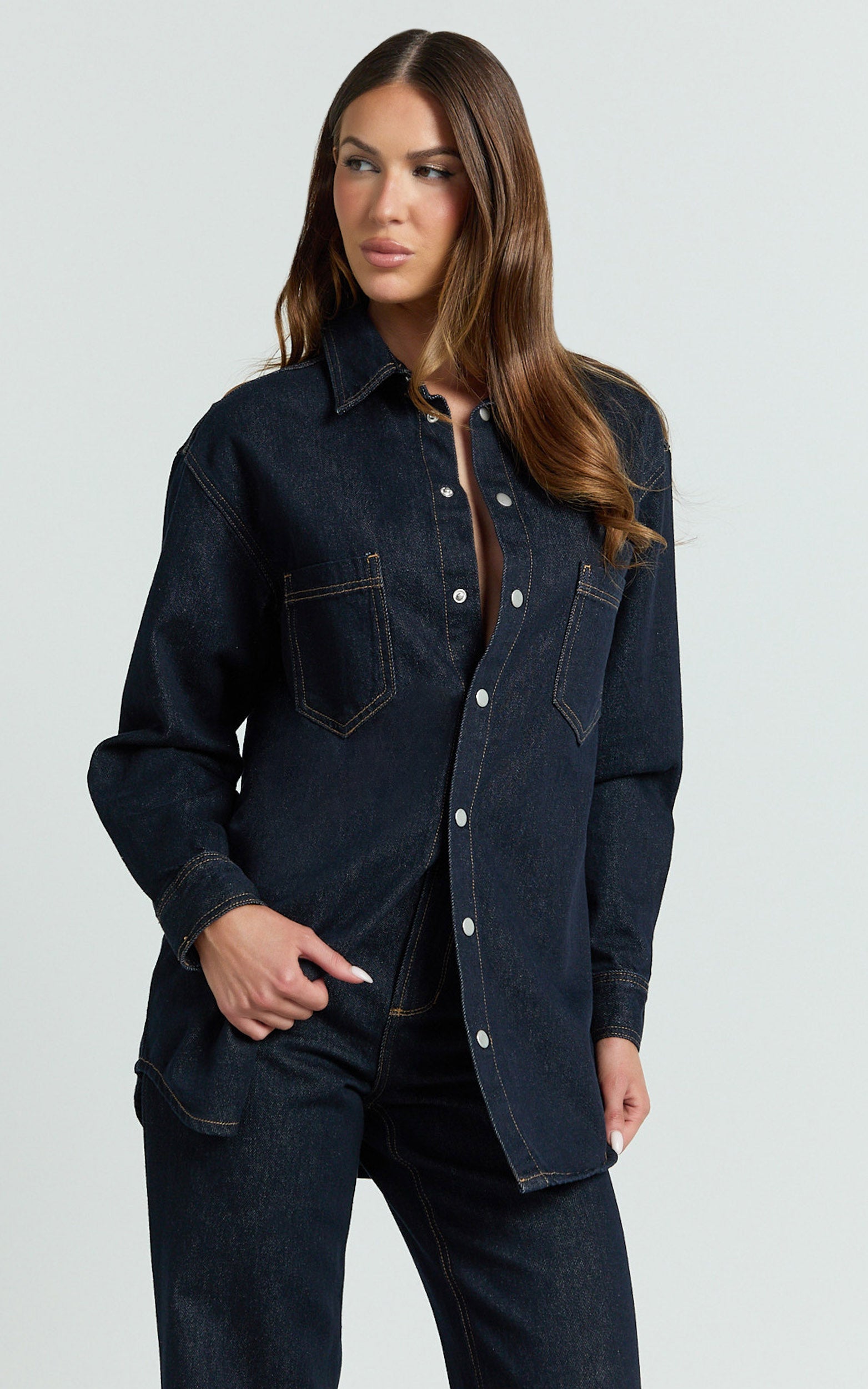 The oversized silhouette and raw hem channel the baggy jeans trend, pair it unbuttoned over a fitted crop top or tuck into high-waisted shorts for an off-duty style moment.