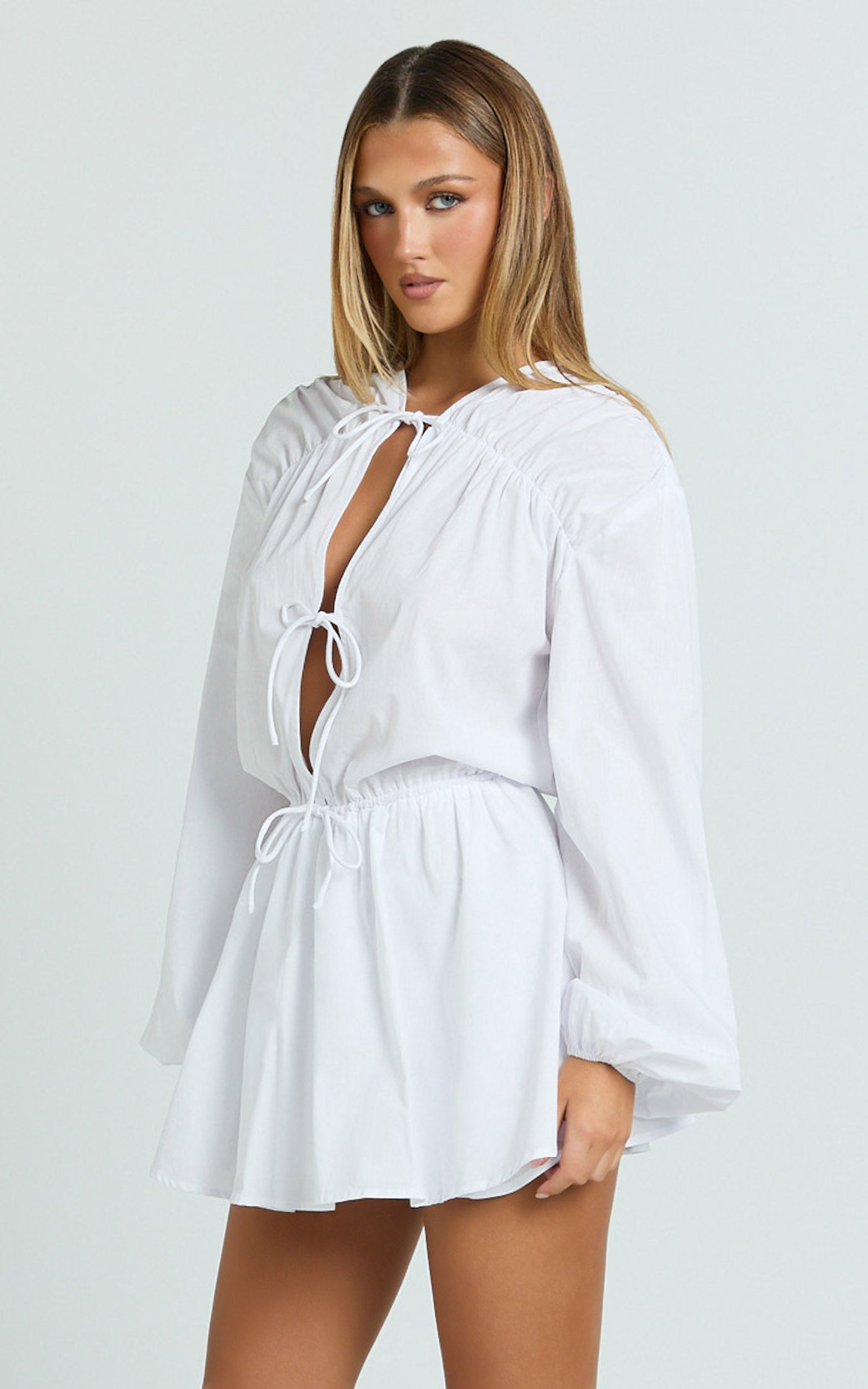 Style it your way: lean into summer stripes with a woven tote vibe or add a shell pendant necklace for that beachy glow. For an It-girl twist, pair with oversized sunglasses and keep accessories minimal to let Felix shine. The Felix Mini Dress - Front Tie Bishop Sleeve Dress In White is your one-and-done look for brunch, parties, and every RSVP in between.