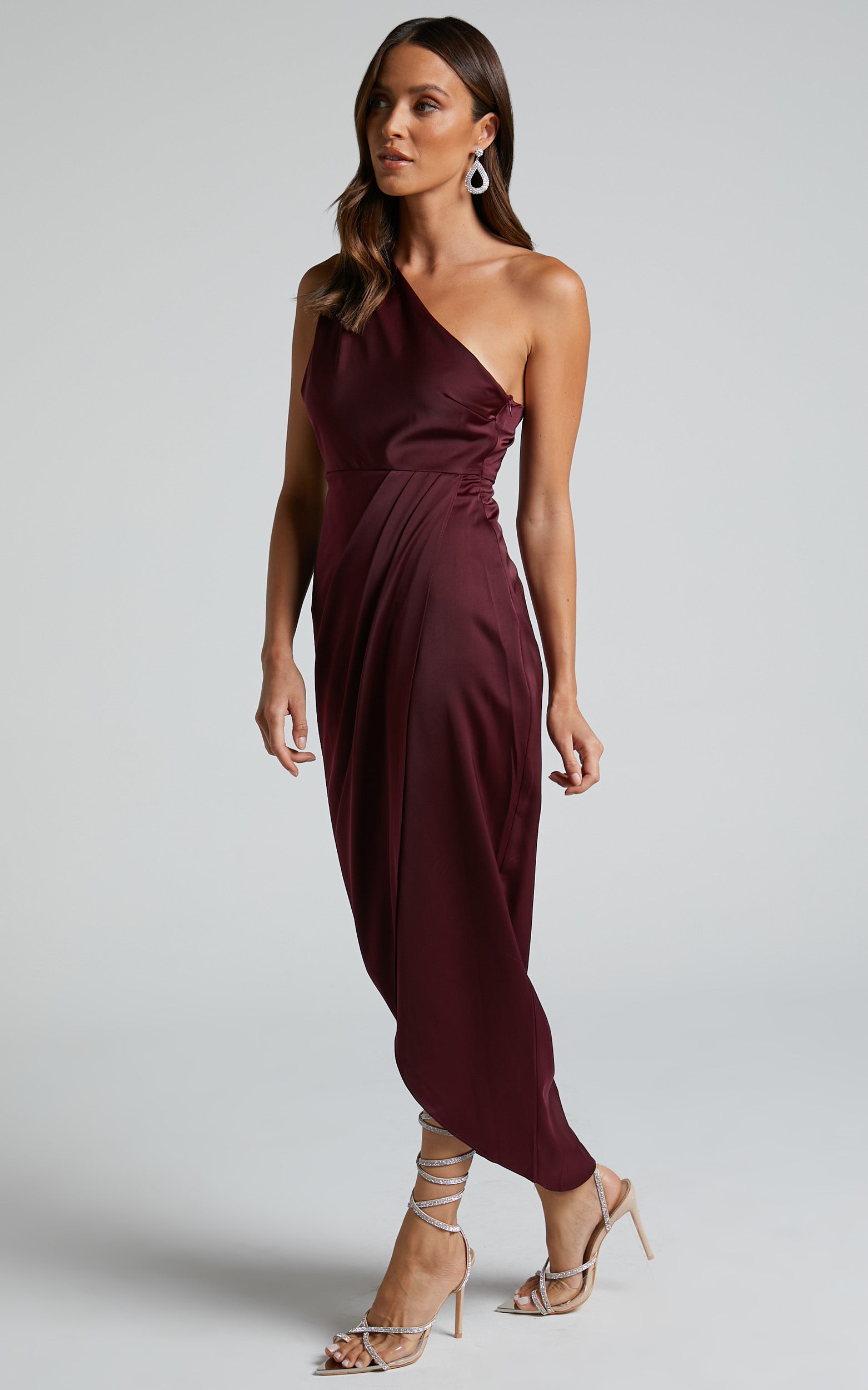 The Felt So Happy Dress is an elegant choice for your next formal occasion. It's crafted from a luxe satin fabric and designed with a one-shoulder neckline and a fitted bodice that has soft gathering. This piece has beautiful pleats on the skirt and it falls to a high-low tulip hem, highlighting an exposed leg. Wear it out to a wedding or to any special events coming up with heels and statement jewellery to top it off!