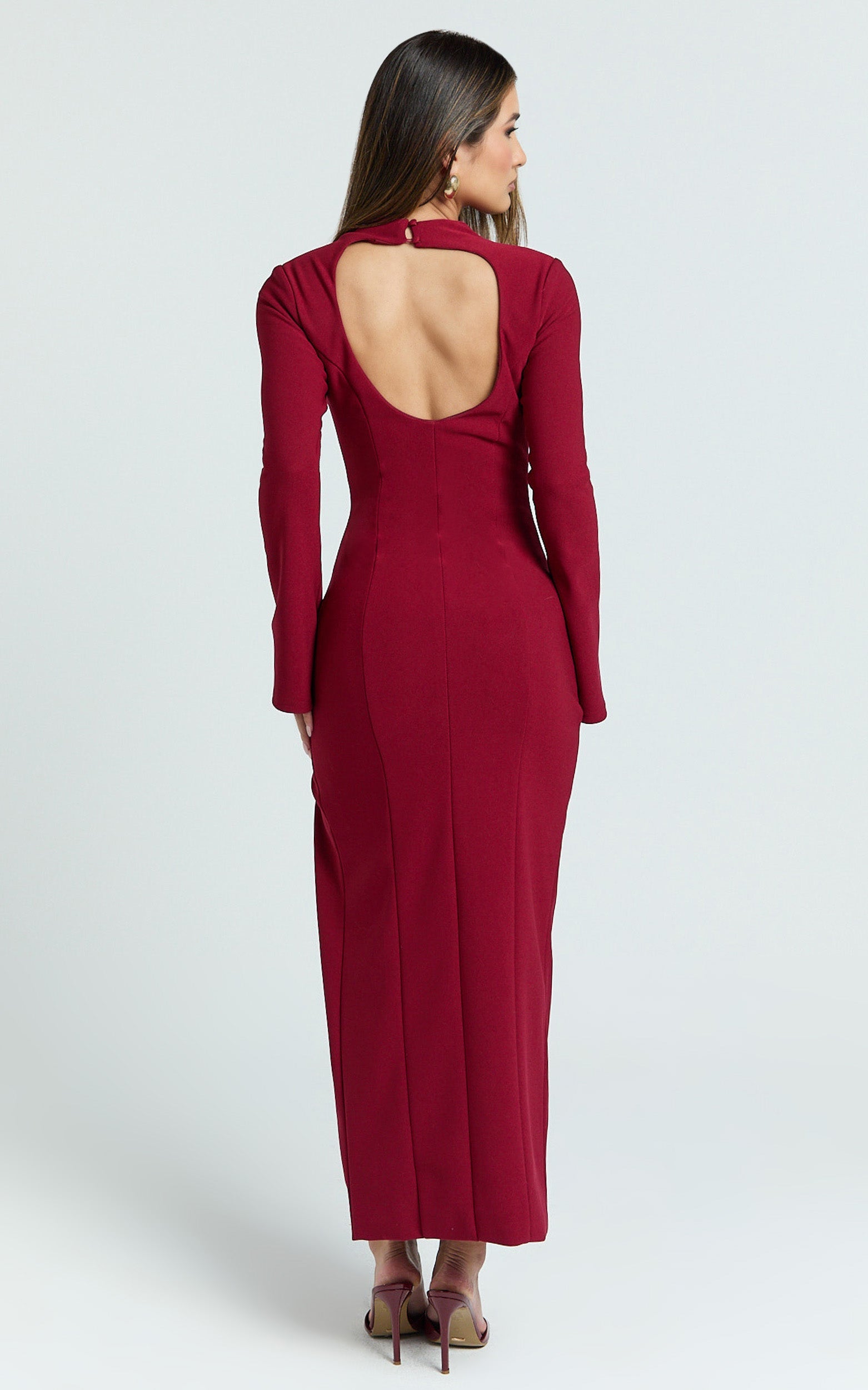 This midi dress brings instant confidence with its high neck, long sleeves and sultry leg split, perfect for making an entrance at any party or special occasion. The bodycon silhouette hugs you in all the right places, accentuating your curves while serving up quiet luxury energy in a stunning wine hue.