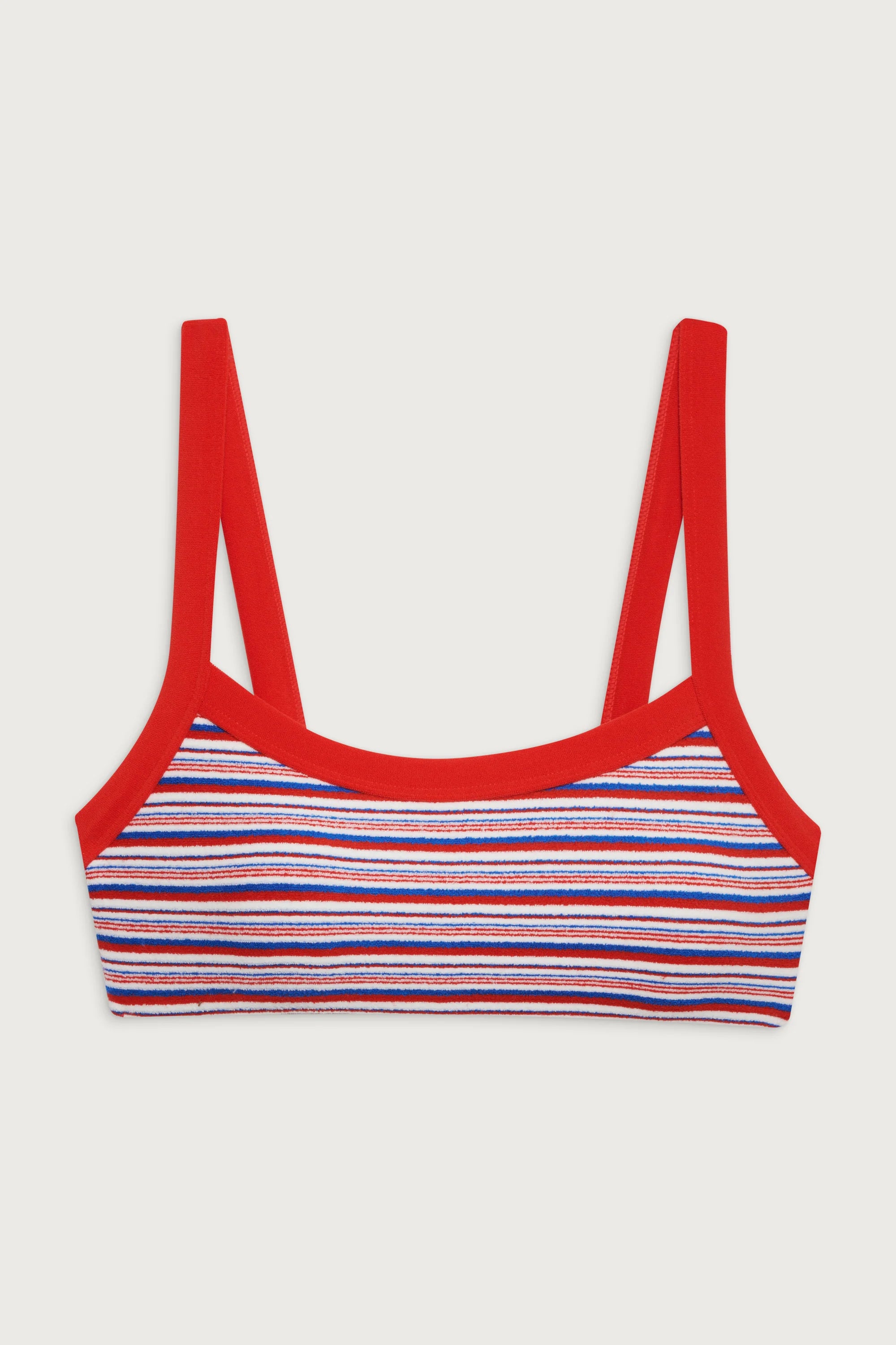 The Flynn bikini top is designed for effortless days spent in the sun. Made from plush terry cloth fabric, this bralette-style bikini top offers medium coverage and moderate support. Its bright red binding and American Summer striped print make Flynn a standout piece this season.
